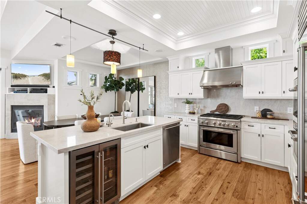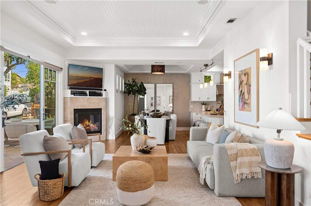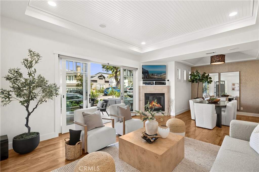 Perfectly positioned in the coveted 200 block just one home off Ocean Boulevard, this exceptional coastal residence offers 4 bedrooms and 4.5 bathrooms. Behind its sprawling 50-foot-wide facade, the home presents a sophisticated sense of scale and volume adorned by soaring high-paneled ceilings, rich wood flooring, and curated designer finishes throughout. Natural light filters across open living spaces, enhancing the warmth and elegance of every room. Highlighted by a fireplace, the great room is framed by disappearing glass doors that seamlessly extend into a front courtyard, blending indoor comfort with coastal ambiance and soft ocean views. Designed for elevated entertaining and everyday luxury, the dining room features a custom designer wallpaper accent wall, adding texture and artistry to the space. The adjacent chef's kitchen is appointed with sprawling quartz countertops, a six-burner range, Sub-Zero refrigeration, a secondary integrated wall oven, water filtration, instant hot water, and a generous center island with a built-in beverage fridge and breakfast bar seating. Three secondary ensuite bedrooms include a highly desirable main-level en-suite bedroom with a walk-in shower, offering ideal flexibility for guests or extended stays, complemented by a well-appointed laundry room and abundant storage throughout. Spanning the width of the oversized lot, the primary suite showcases expansive views, an oversized walk-in closet, a fireplace dually serving a spa-caliber bath with a soaking tub, multi-head walk-in shower, dual vanity, and a privacy commode. Above, the rooftop deck captures sweeping coastal vistas stretching from the sands of China Cove to the Harbor Entrance, Catalina Island, and the iconic Wedge, offering an extraordinary backdrop for sunset gatherings or quiet coastal moments. A rare two-car side-by-side garage offers prized convenience in this coastal setting. Live the Corona del Mar Lifestyle and elevated coastal living just steps from Ocean Boulevard, local and famed dining and shopping, Blue Ribbon Schools, and world-class beaches.