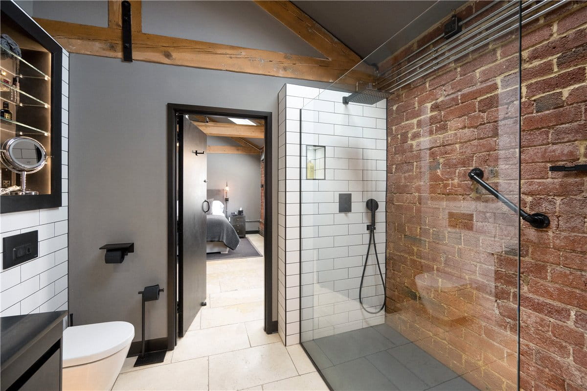 The building is entered via a subtle but spacious entrance hall with storage, an industrial staircase leads up to the first floor landing and the entrance to apartment one which briefly comprises an entrance hall with double doors leading to the exceptional open plan living/dining and kitchen space with west facing balcony and a slight level change up to the cloakroom and the two large double bedroom suites which both have vaulted ceilings with exposed beams, large walk in wardrobe facilities and luxurious en suite shower rooms.