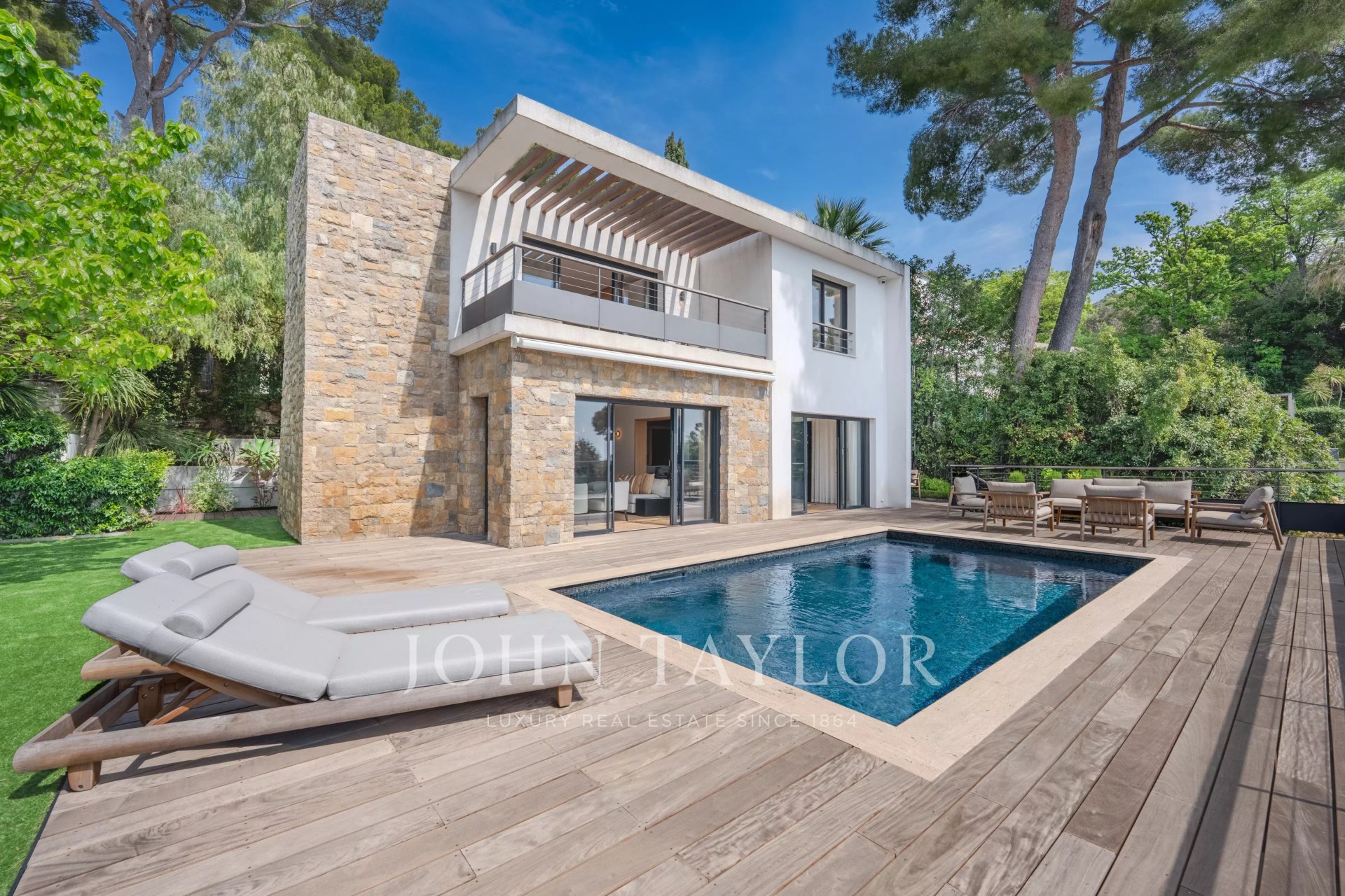 Having a panoramic view of the Bay of Cannes, this superb contemporary realization offers extremely refined services.In absolute calm, in the heart of California, this villa offers beautiful reception spaces: living room, dining room open to beautiful terraces, minimalist kitchen with utility room, three beautiful suites with dressing room and bathroom/shower as well as an independent studio. Very nice entrance with remarkable staircase.Home automation system, reversible air conditioning, two parking spaces.