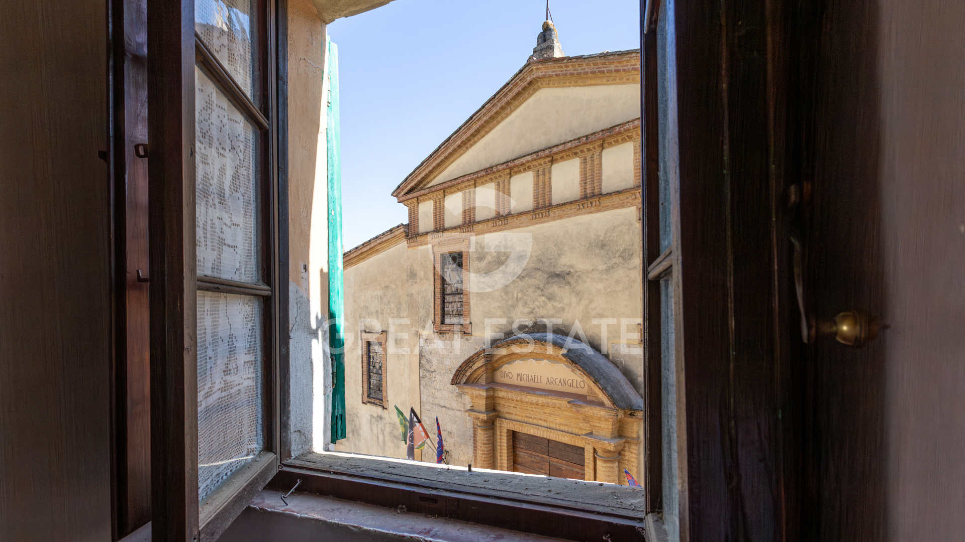 Very bright and charming apartment located in the main square of Cetona. The property is situated on the third floor of a historic building, boasting large windows overlooking both the Piazza and the Tuscan countryside. The apartment, all arranged on a single level, has a commercial surface area of approximately 95 sq.m. and is divided as follows: Entrance hall with two large rooms overlooking the square, a living area with an antique fireplace facing the delightful little square of the Church of San Michele, and on the same side, the kitchen and a bathroom.Included in the sale are a 15 sq.m. ground-floor storage unit and a spacious 35 sq.m. attic located on the top floor.The property requires modernization; all building permits for the renovation have been duly approved, and work can begin immediately. Upon request, it may also be sold TURNKEY (Cetona in Piazza Ref. 9348)
