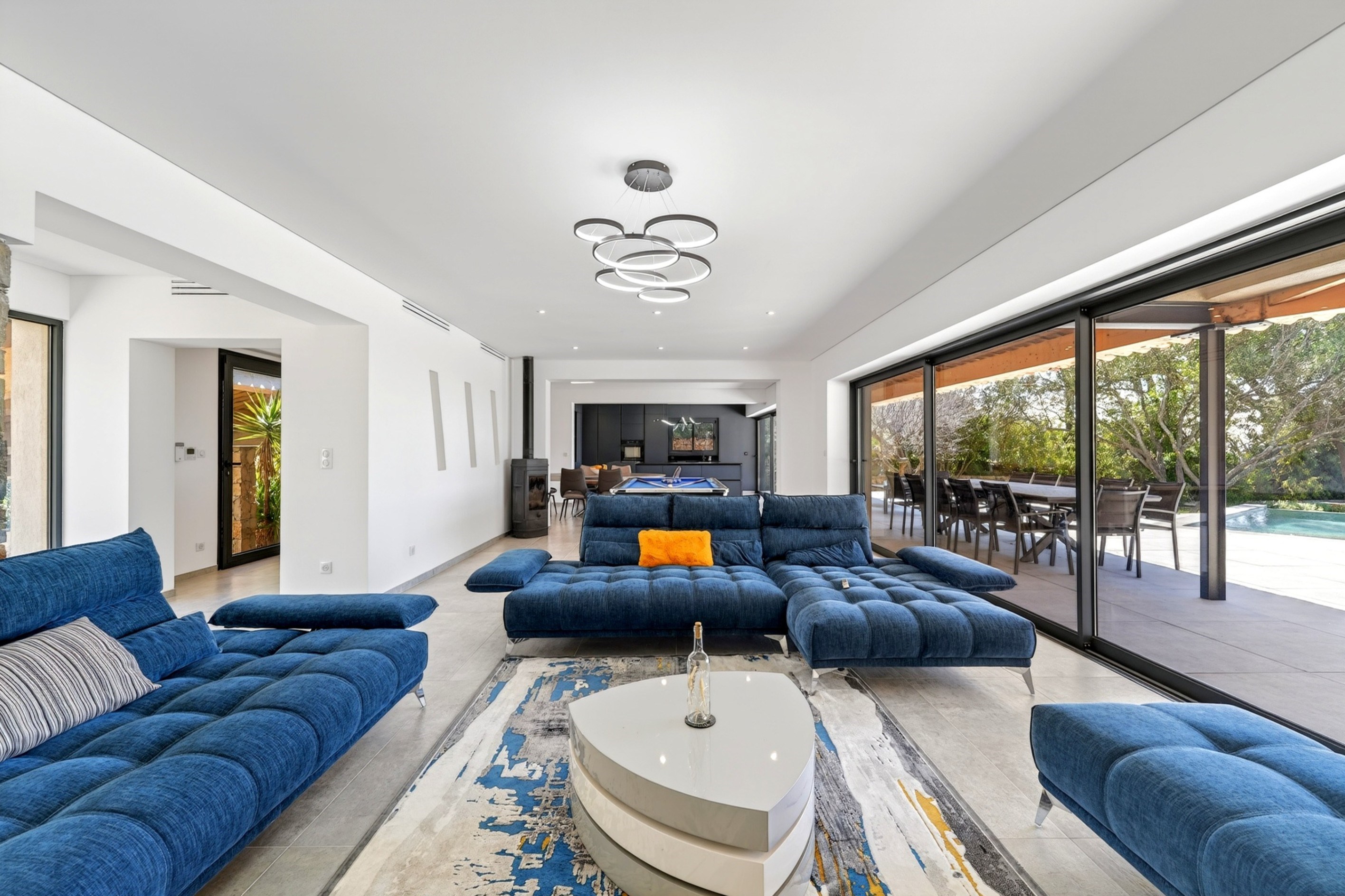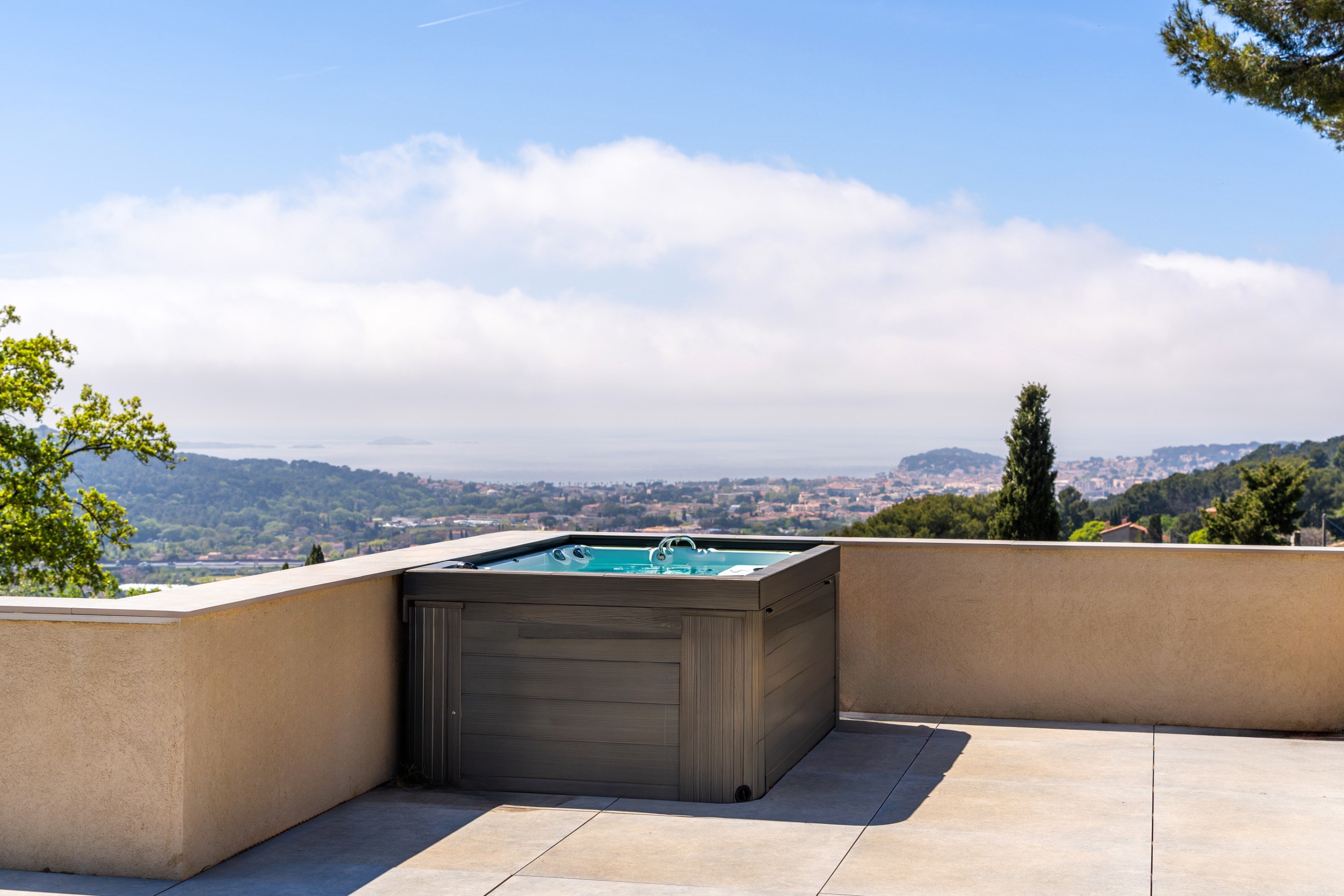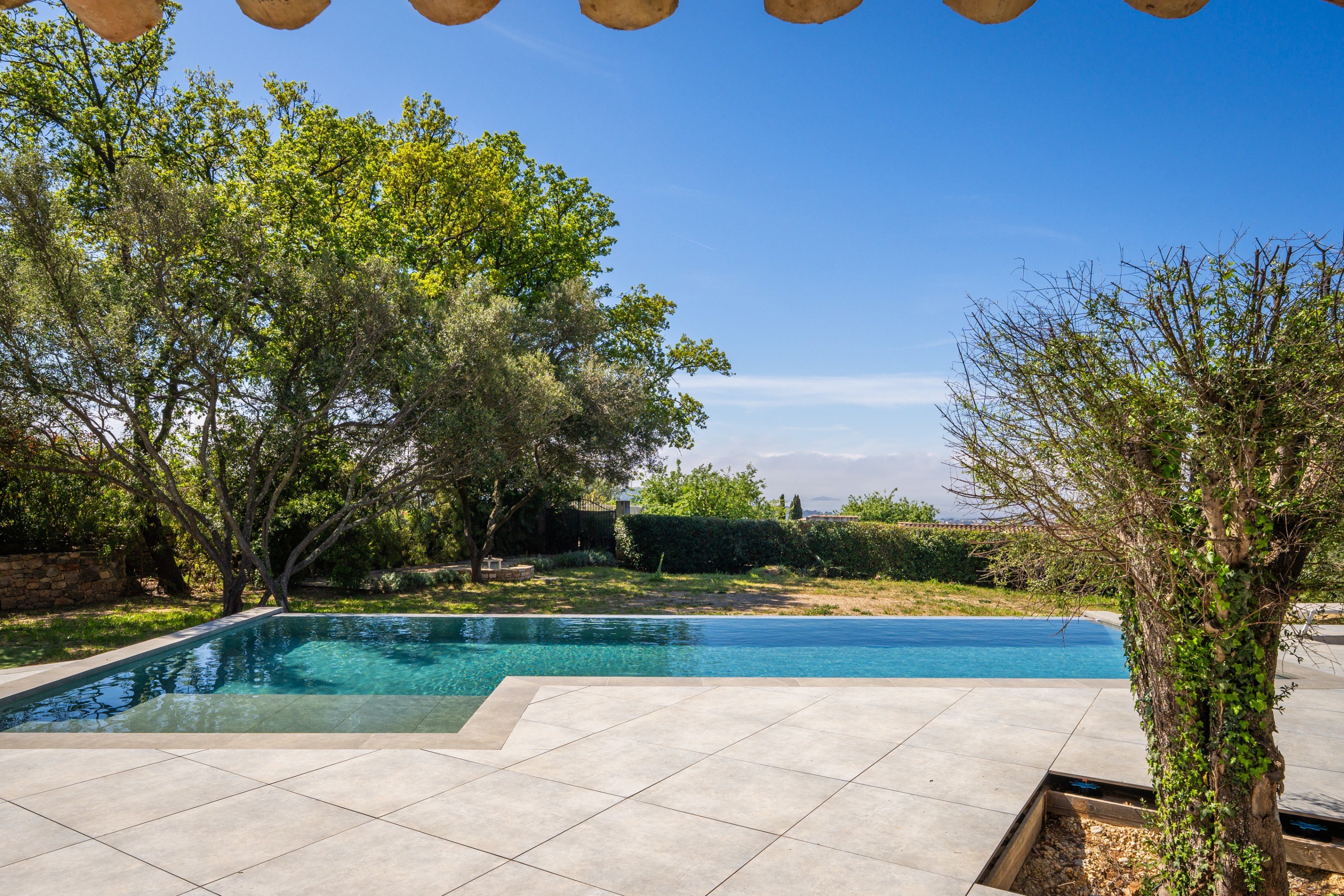 For sale in Ollioules, a renovated architect-designed villa featuring an infinity pool, sea views, and an apartment. Set within a preserved residential environment, lush with greenery and enjoying absolute tranquility, this architect-designed villa — redesigned by Jean Gouzy and fully renovated in 2024 — combines contemporary lines, abundant natural light, and a stunning maritime horizon. From the moment you enter, the generous and perfectly proportioned volumes reveal open perspectives towards the sea. The reception areas, conceived for seamless indoor-outdoor living, open widely onto expansive terraces and an infinity pool. The living room is enhanced by a spectacular triple-panel pocket sliding glass door, creating remarkable transparency and fluidity. Offering approximately 370 sqm of living space, the property features six suites, each with its own private shower room, ensuring privacy and comfort for guests. The principal suite stands out with its walk-in dressing room and balneotherapy area — a true everyday wellness retreat. Built at the heart of landscaped grounds of approximately 3,500 sqm, the villa also includes a pétanque court and a large carport. As a highlight, a private rooftop terrace reveals panoramic sea views and hosts a jacuzzi, creating truly suspended moments of relaxation. On the garden level, a workshop, an independent two-bedroom apartment, and a garage complete the property, further enhancing the versatility and rare character of this exceptional address.