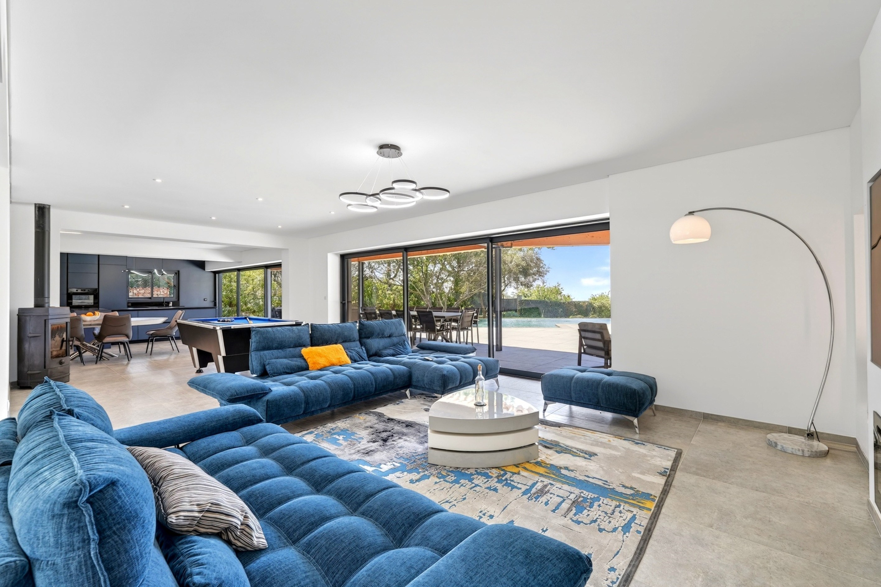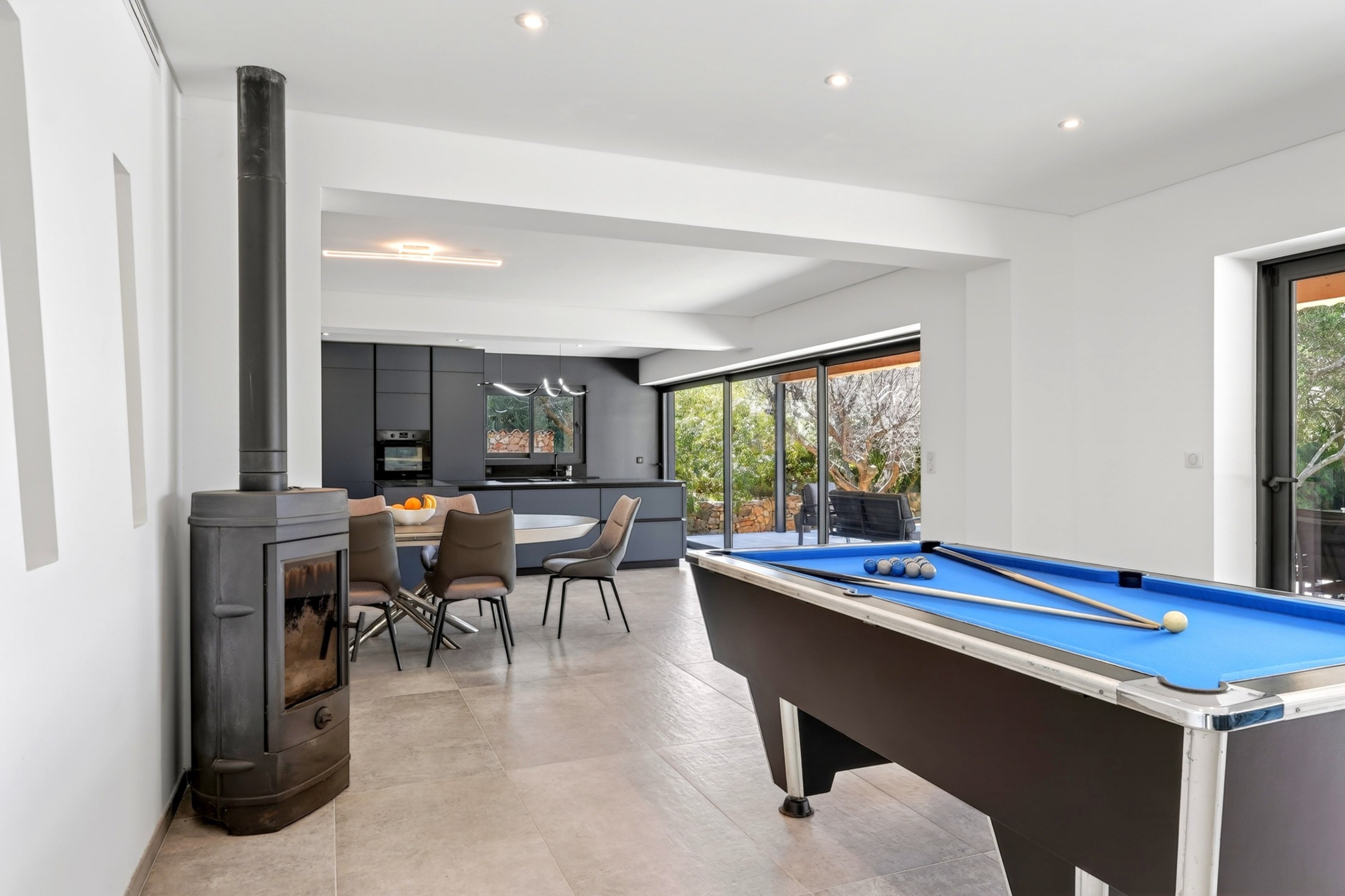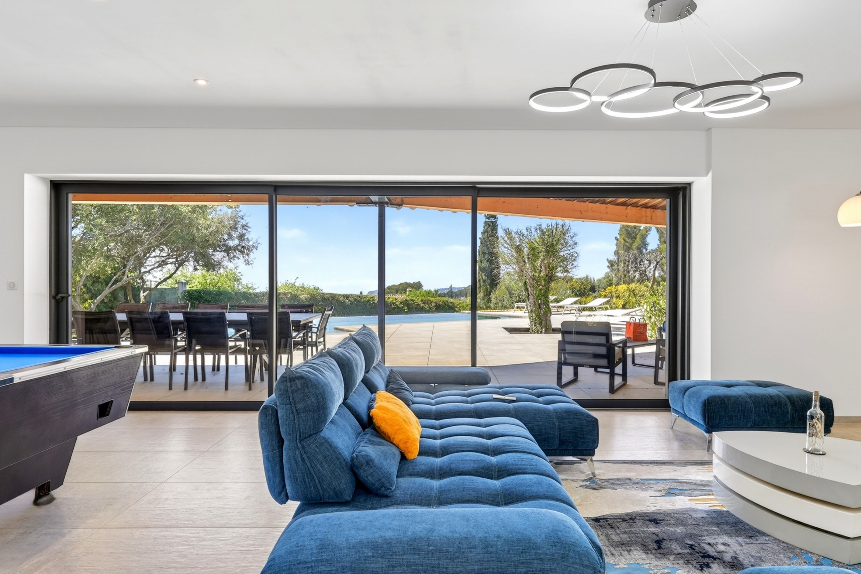 For sale in Ollioules, a renovated architect-designed villa featuring an infinity pool, sea views, and an apartment. Set within a preserved residential environment, lush with greenery and enjoying absolute tranquility, this architect-designed villa — redesigned by Jean Gouzy and fully renovated in 2024 — combines contemporary lines, abundant natural light, and a stunning maritime horizon. From the moment you enter, the generous and perfectly proportioned volumes reveal open perspectives towards the sea. The reception areas, conceived for seamless indoor-outdoor living, open widely onto expansive terraces and an infinity pool. The living room is enhanced by a spectacular triple-panel pocket sliding glass door, creating remarkable transparency and fluidity. Offering approximately 370 sqm of living space, the property features six suites, each with its own private shower room, ensuring privacy and comfort for guests. The principal suite stands out with its walk-in dressing room and balneotherapy area — a true everyday wellness retreat. Built at the heart of landscaped grounds of approximately 3,500 sqm, the villa also includes a pétanque court and a large carport. As a highlight, a private rooftop terrace reveals panoramic sea views and hosts a jacuzzi, creating truly suspended moments of relaxation. On the garden level, a workshop, an independent two-bedroom apartment, and a garage complete the property, further enhancing the versatility and rare character of this exceptional address.