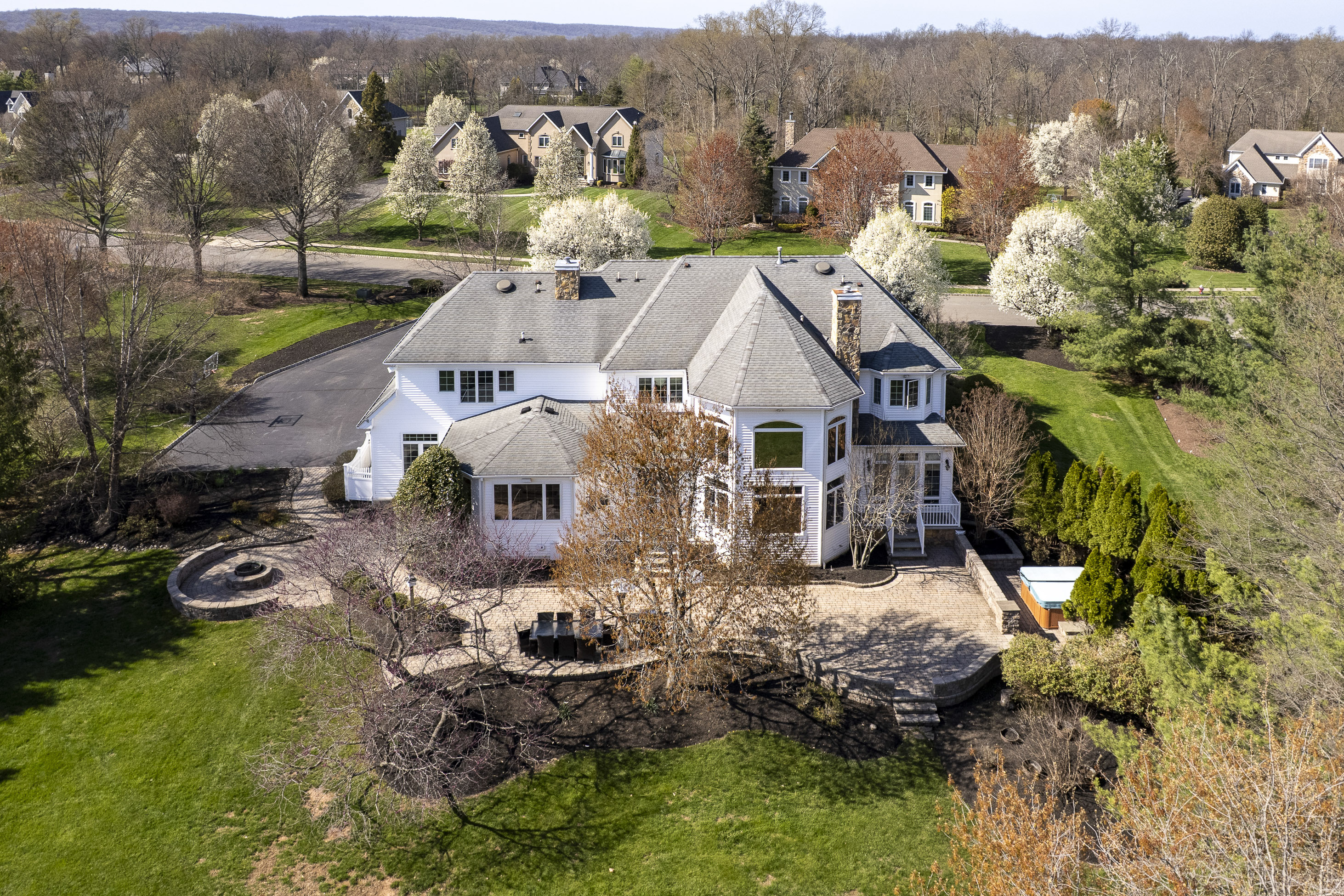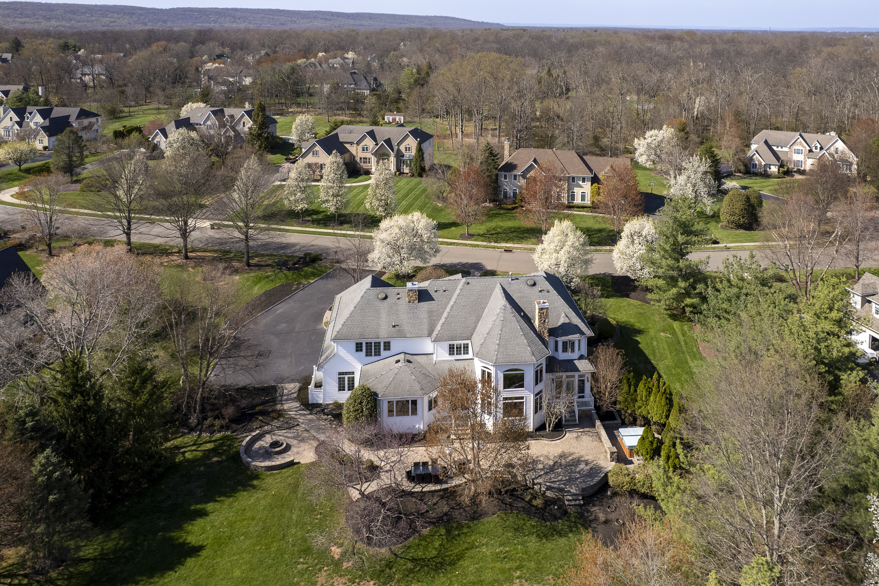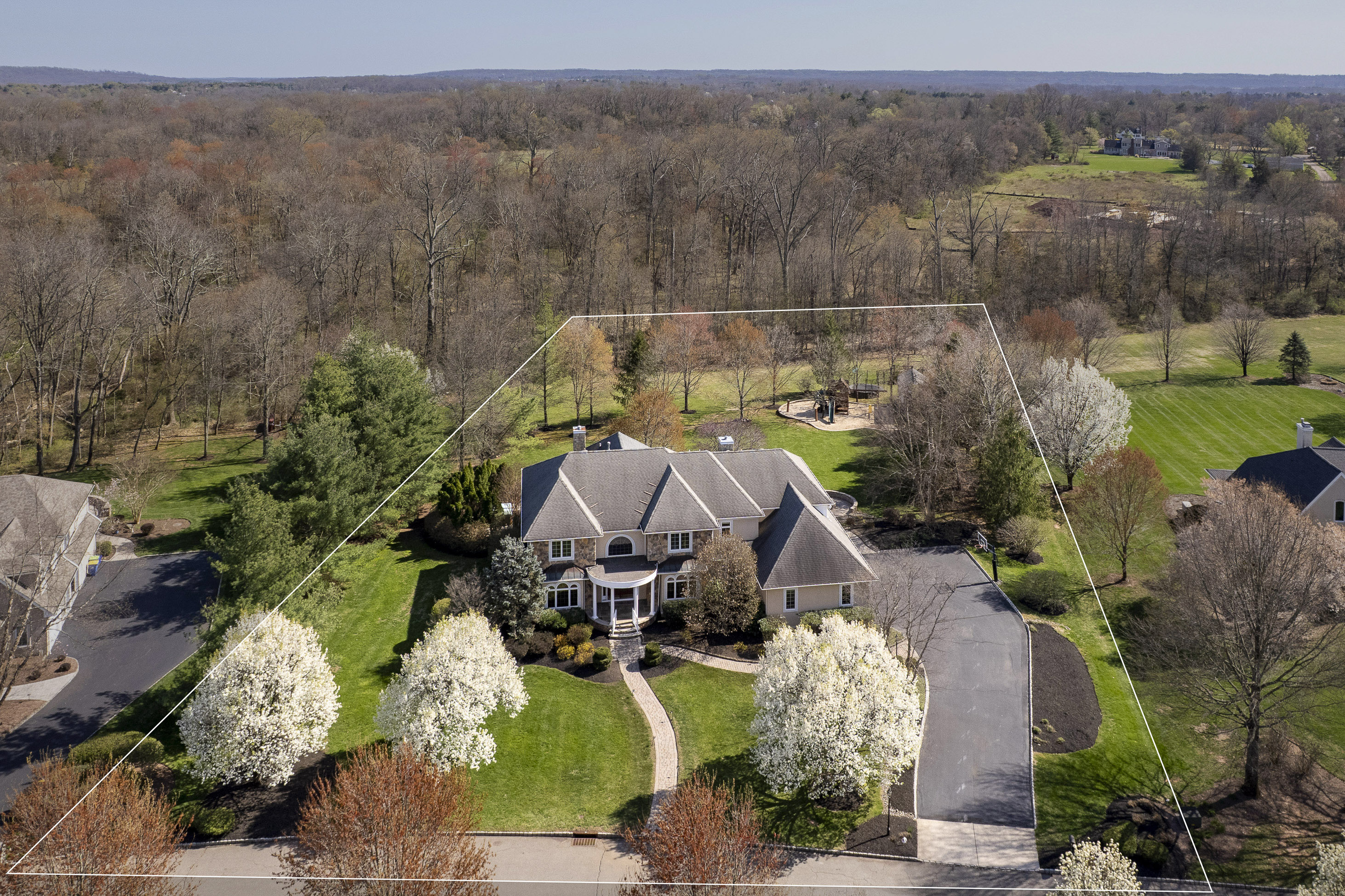 This amenity-rich 5-bedroom, 5 1/2-bath home in Belle Mead’s Saddlewood Estates on just over an acre is truly something special, filled with natural light, soft, calming tones, and effortless style. Each space feels carefully composed yet easy to live in, balancing refined sophistication with a sense of comfort that invites you to settle in and stay awhile. At the center of it all, the kitchen is designed to do more than perform. Outfitted with premium appliances and a layout that prioritizes flow, it connects seamlessly to the surrounding spaces. Just beyond, a generously scaled breakfast room is large enough to rival the formal dining room, providing a second gathering space that feels equally suited to everyday mornings and casual entertaining. The formal living room and dining room sit in balance, adjoined by a butler pantry. In the family room, a dramatic wall of windows fills the space with sunlight, while a gas fireplace anchors the room with warmth. A richly detailed study offers a quiet place to work, complete with custom solid-cherry built-ins that add depth and craftsmanship. Nearby, a first-floor bedroom and full bath provide flexibility for guests or extended stays. Downstairs, the lower level is designed as a destination in itself. A full entertainment suite includes a private movie theater, home gym, full bath, cedar storage closet, and a wine cellar, creating a retreat that feels both indulgent and fun. Upstairs, four bedrooms each have their own bathroom or connect through a well-designed Jack-and-Jill layout. The primary suite stands out as a calming escape with a sitting room that could serve as a second home office, a boutique-style dressing room with a center island, and an en-suite bathroom with a shower for two. Outside, find an expansive patio with a fire pit, a three-car garage, and a play area all set on a cul-de-sac street. Located in the nationally acclaimed Montgomery Township School District, and just minutes from top private schools, Cherry Valley golf course, downtown Princeton, parks, shopping, and major commuter routes, this home is designed to be lived in fully, offering beauty, comfort, and ease in every detail.