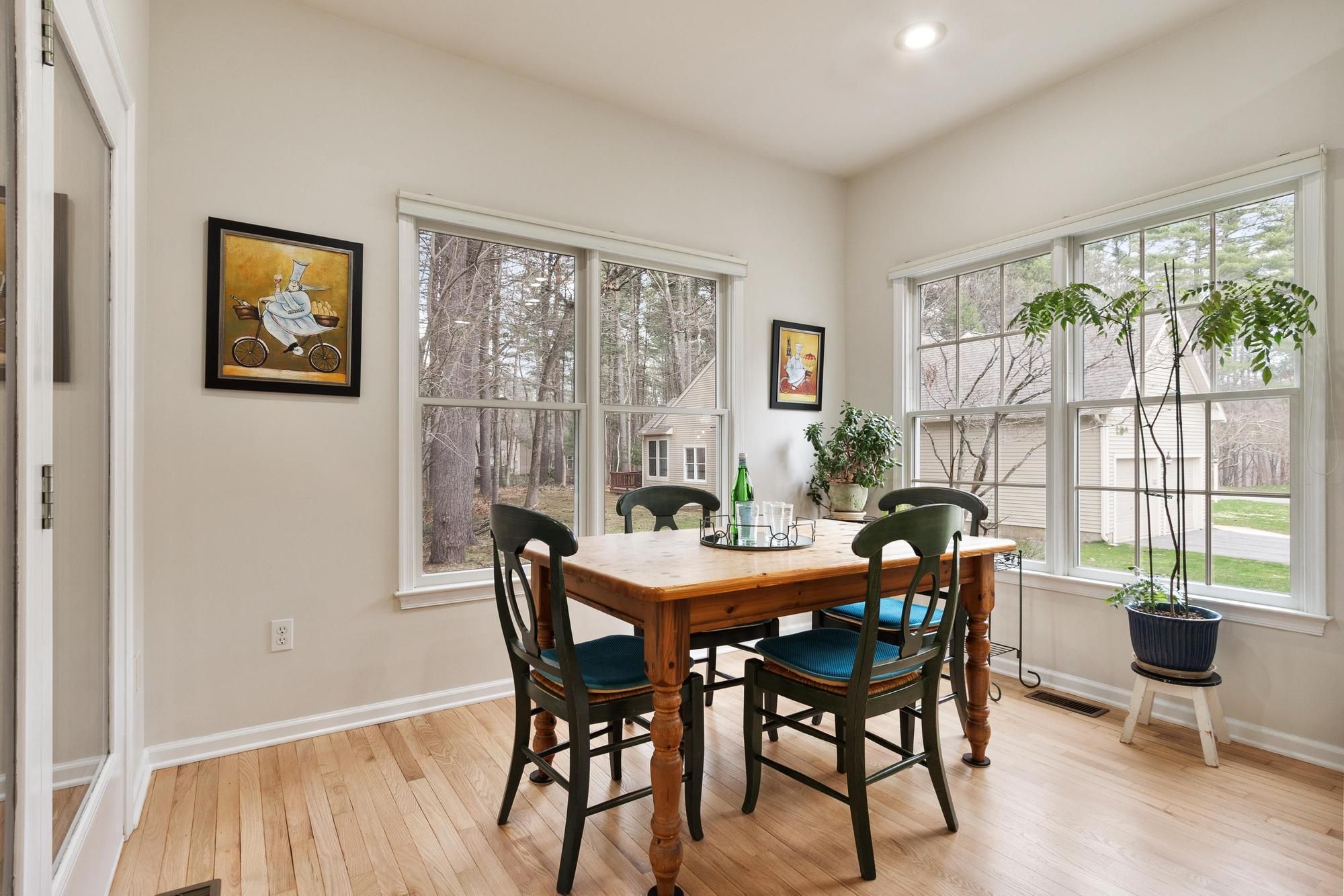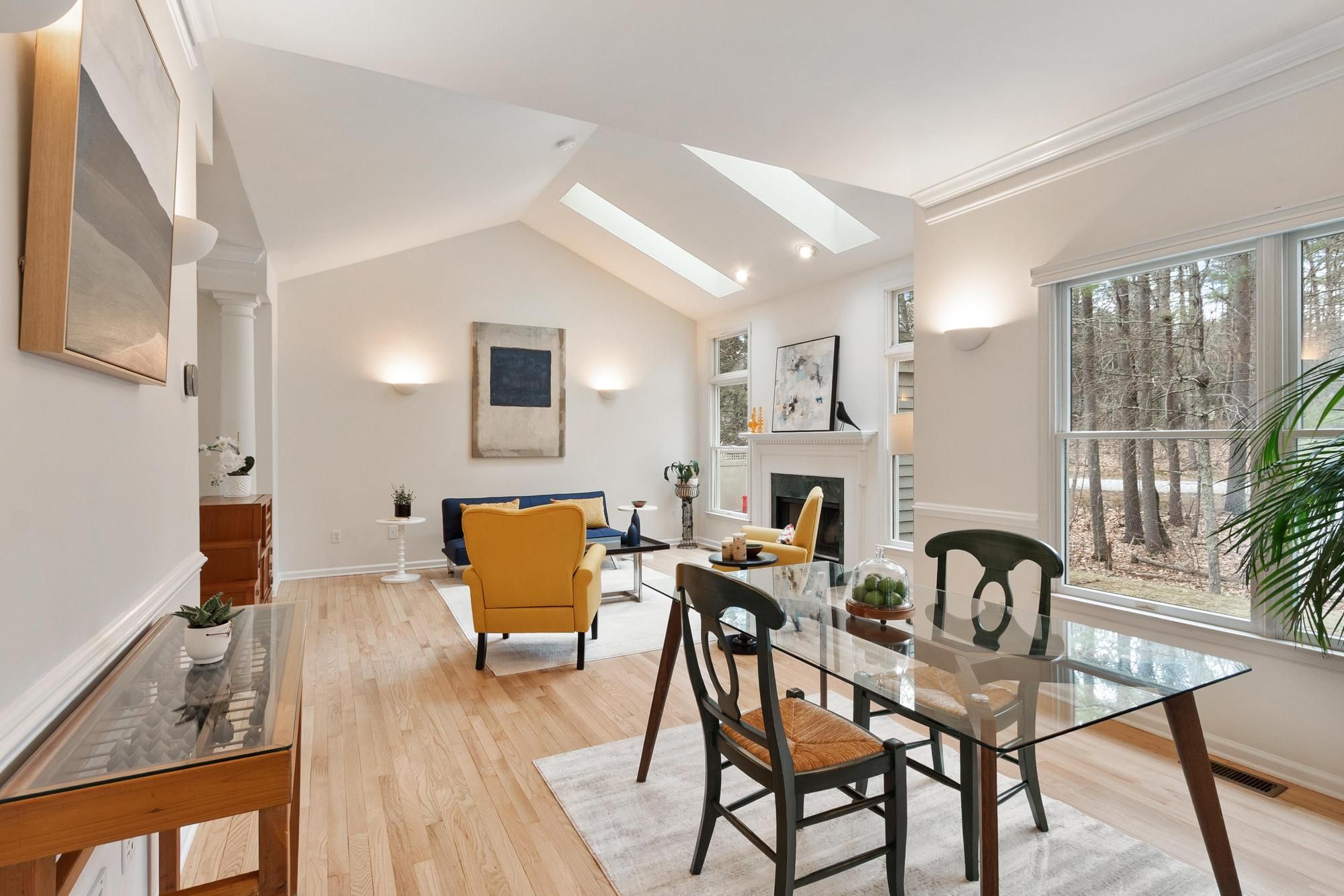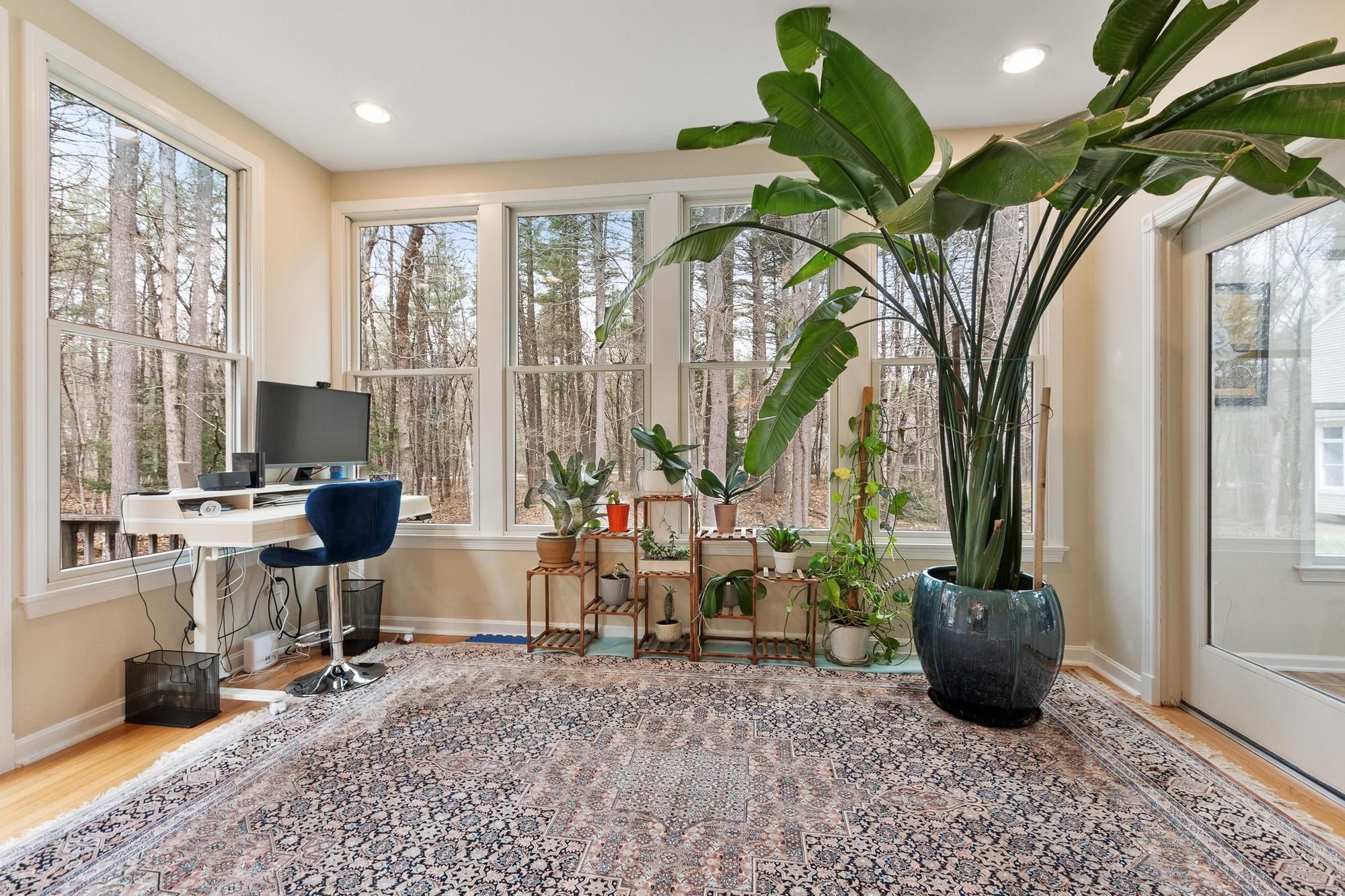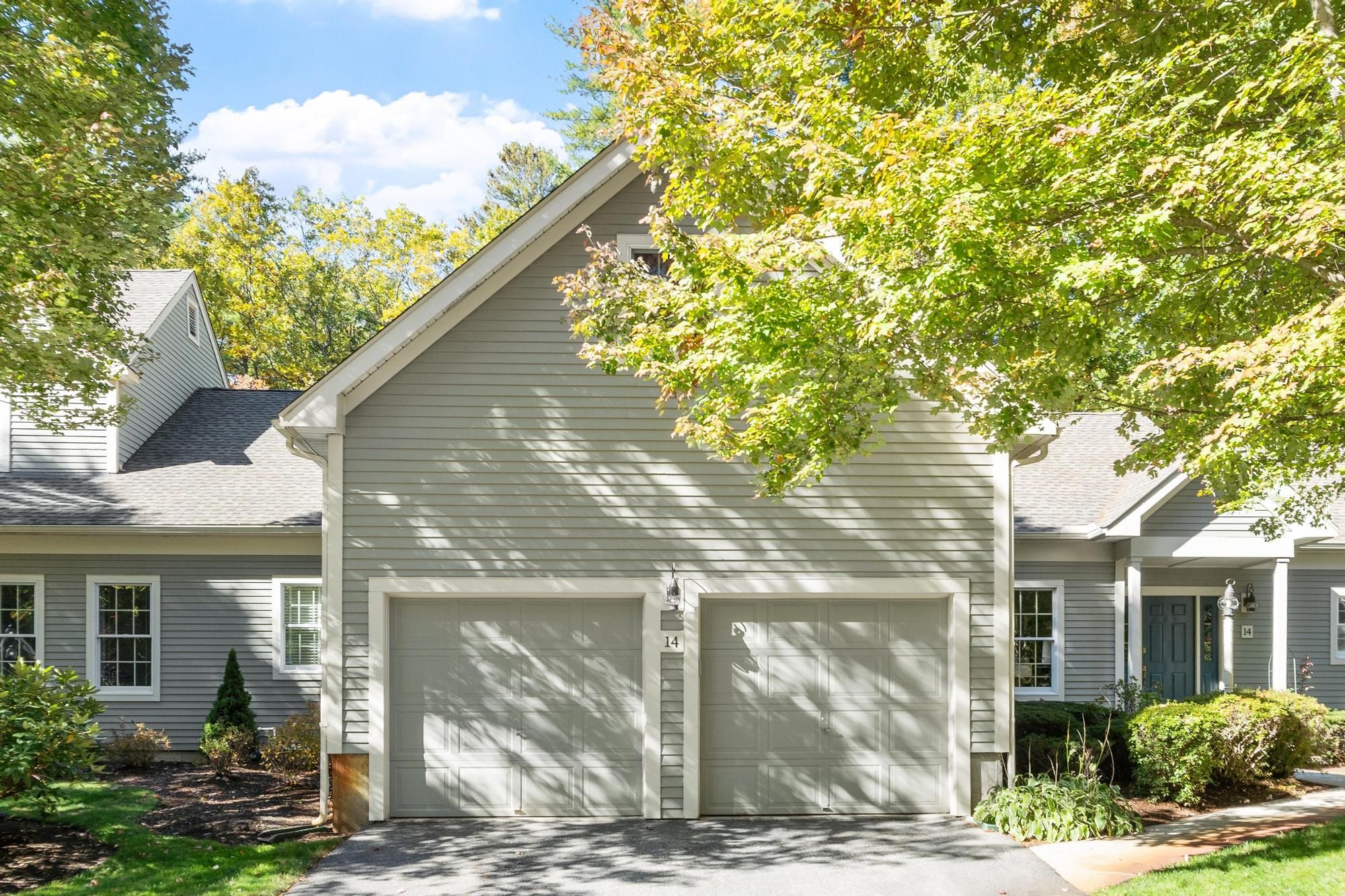 Exceptional opportunity at highly sought-after Huckins Farm! This desirable single-level home offers one of the community’s most popular floor plans, featuring 2 bedrooms, 2 full baths, a front office and sun-filled sunroom. Soaring ceilings and an open layout create a bright, airy feel, enhanced by oversized windows and abundant natural light. The year-round sunroom, complete with a mini split, opens to a private deck overlooking manicured grounds, mature trees, and peaceful common space on a quiet circle. Recent updates include refinished hardwood floors, fresh interior paint, new refrigerator, dishwasher, oven, and microwave. Additional highlights include a fireplace, spacious living areas, a 2-car attached garage, and a full basement ready to finish. The primary suite offers two walk-in closets. Enjoy exceptional amenities including a clubhouse, fitness center, pool, tennis courts, equestrian center, scenic trails, and conservation land. Move right in and enjoy Huckins Farm living!
