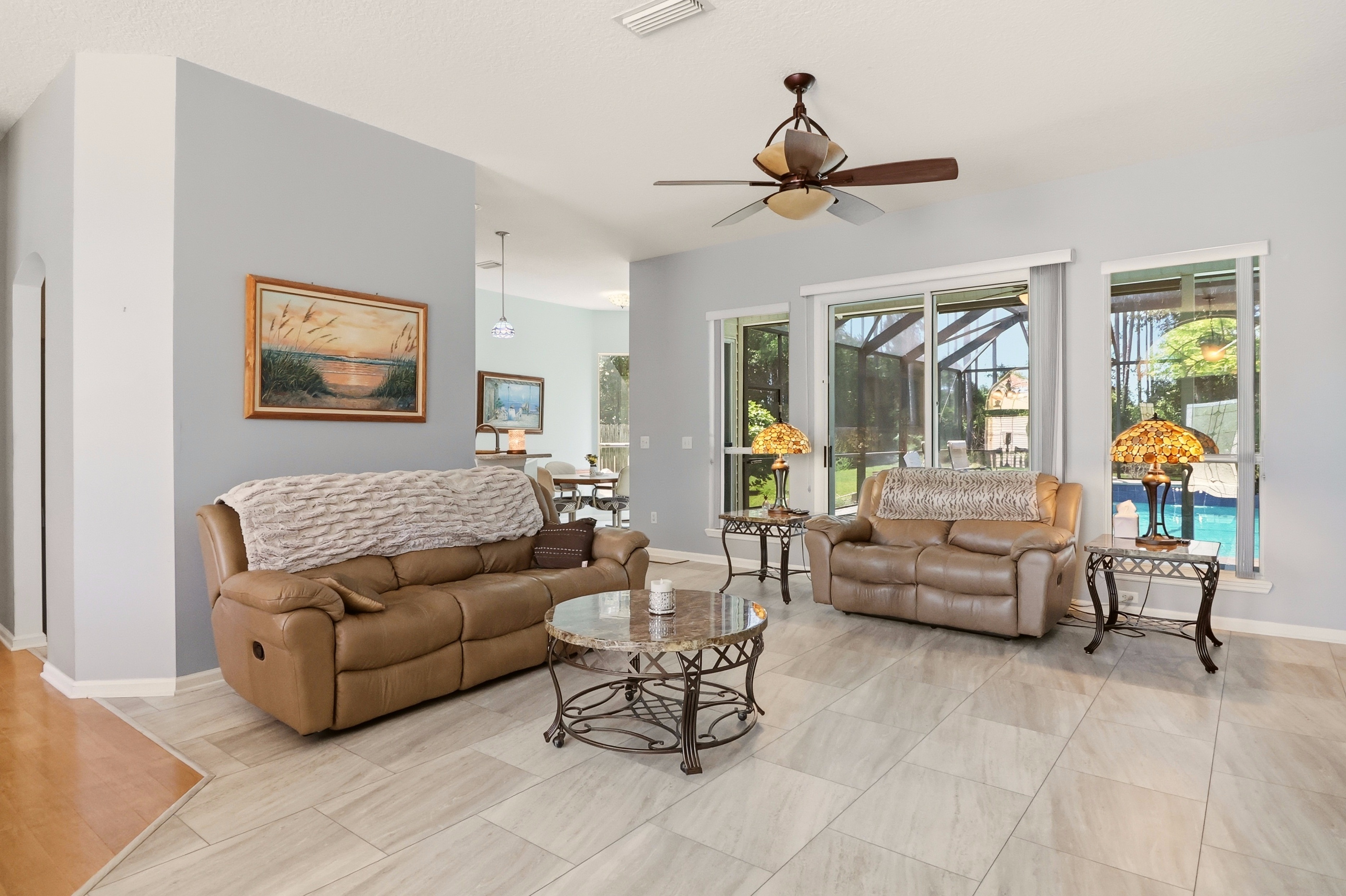 Welcome to 273 Whisper Ridge Drive in St. Augustine, FL, an impeccably maintained three bedroom, two bath home on a rare .34 acre lot with a private lake view, screened-in heated pool, and no CDD fee. Built by Richmond American Homes, this light-filled, open-concept home features 1,833 square feet of thoughtfully designed living space with arched doorways, tray ceilings, and abundant windows that bring in natural light. The spacious primary suite offers a relaxing sitting area, dual closets, and a beautifully updated bathroom with a remodeled shower and spa-like features. The kitchen and living areas flow seamlessly, making this home perfect for everyday living and entertaining. Step outside to your own backyard retreat with a screened lanai, eight foot deep chlorine pool, irrigation well, and lush landscaping including avocado and Meyer lemon trees. Major updates provide peace of mind, including a 2022 roof, 2026 water heater, 2024 water softener with charcoal filtration, and paid-off solar panels that heat the pool. Located in the highly sought-after St. Johns County School District with easy access to I-95, shopping, dining, and just minutes to historic St. Augustine and the beaches, this move-in ready home offers the perfect blend of comfort, privacy, and Florida lifestyle living.