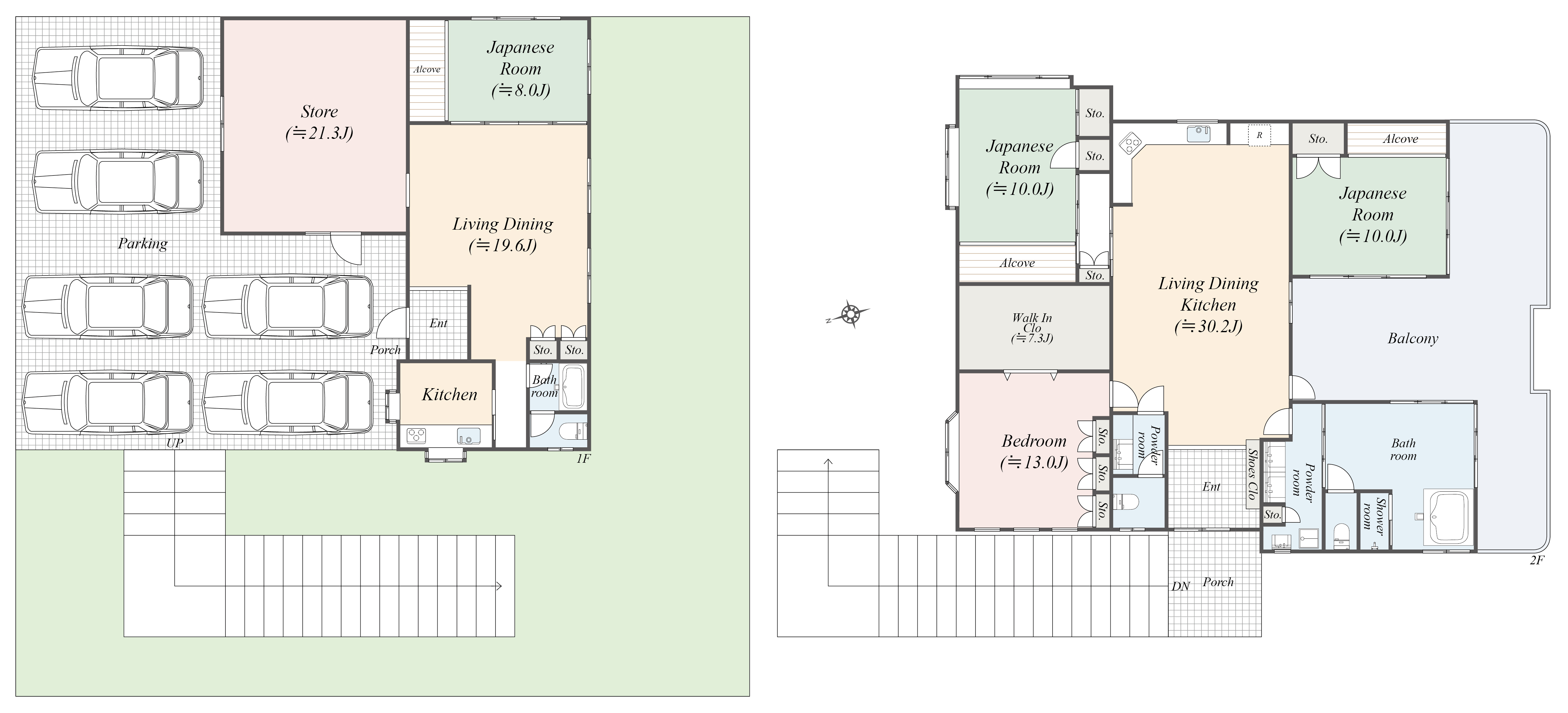 ■Floor Plan: 1st Floor (1LDK + retail space), 2nd Floor (3LDK)