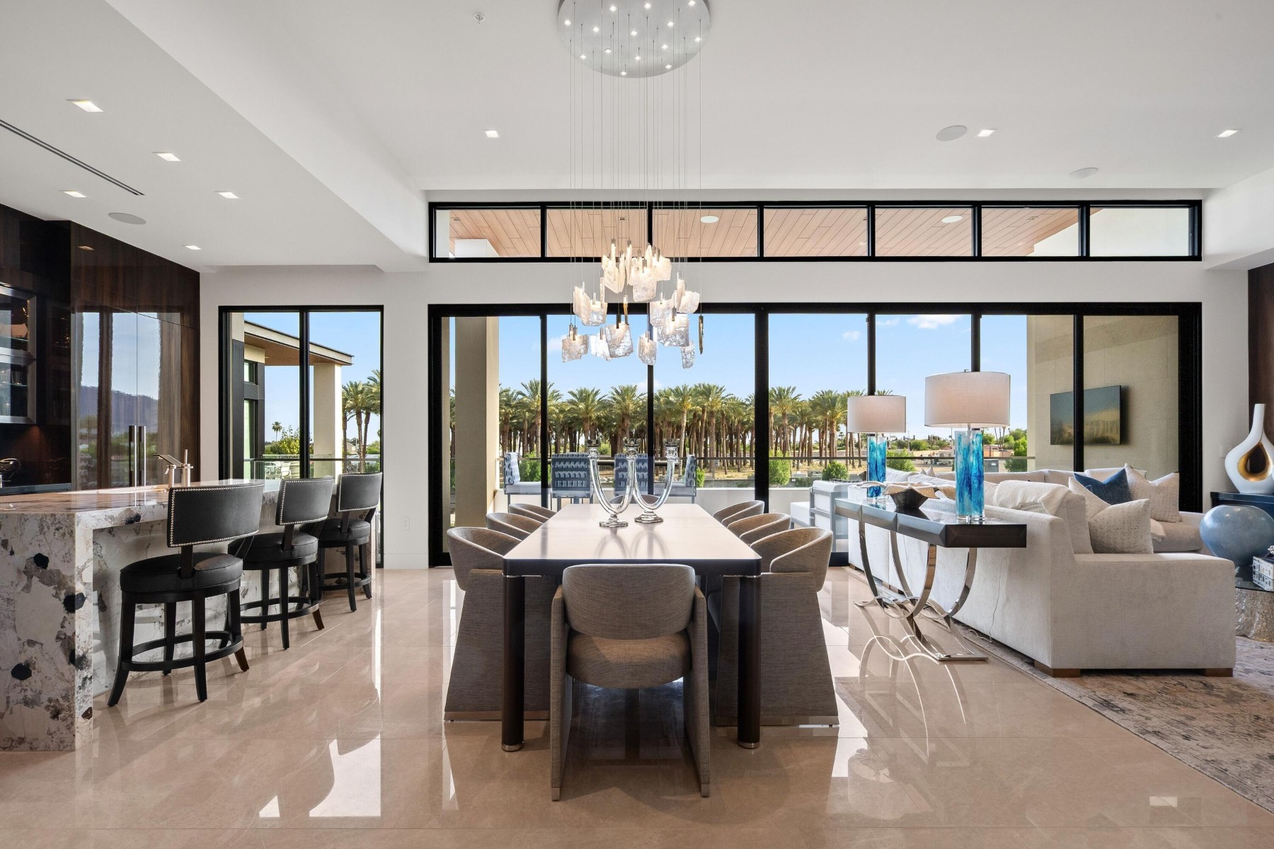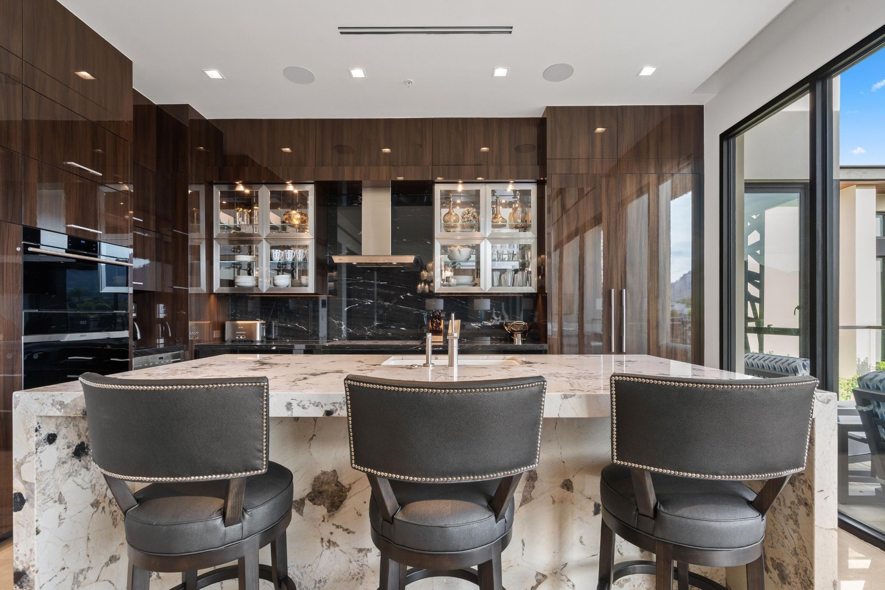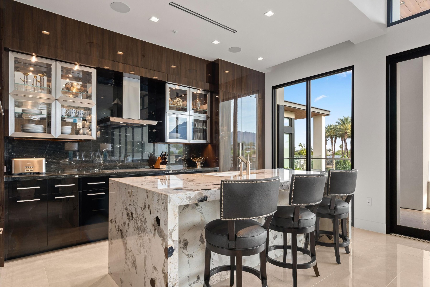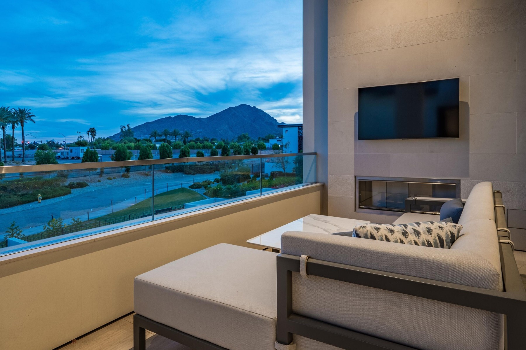 World-class luxury--synonymous with The Ritz-Carlton--is immediately evident in this top floor, 3-bedroom, 3.5-bath open-concept villa, ideally positioned within the highly coveted enclave of The Ritz-Carlton Villa Residences in Paradise Valley. Thoughtfully designed to embody sophisticated contemporary living with a refined yet relaxed elegance, the residence offers an inviting atmosphere that perfectly complements the coveted indoor-outdoor lifestyle of Scottsdale, where over 300 days of sunshine set the stage for year-round enjoyment. Equally suited as a luxurious weekend retreat or a full-time residence, this villa delivers both versatility and distinction. Striking design elements define the interiors, including dramatic stone slab feature walls, countertops, and vanities, paired with sleek solid-color and wood-lacquer cabinetry. Subtle recessed detailing, textured wall treatments, and a curated selection of high-end contemporary fixtures are complemented by both clear and opaque glass walls and sliding door systems, creating a seamless flow of light and space throughout. A linear patio spans the full length of the residence, offering direct access from multiple rooms through expansive sliding glass doors. Here, breathtaking views unfold--endless skies, Camelback views with ever-changing mountain hues, vibrant sunsets, and shimmering starlit evenings provide a captivating daily backdrop. The intelligently designed split floor plan ensures privacy and comfort, with the primary suite thoughtfully positioned on one wing. At the heart of the home, an expansive open living area features a central gathering space, a dining space framed by scenic vistas, and an adjacent lounge with a wet bar--ideal for both intimate gatherings and larger-scale entertaining. The chef's kitchen is a true showpiece, highlighted by a grand island with bar seating and complemented by two generously sized guest ensuites on the opposite side of the residence. Beyond the villa, the grounds present a serene, resort-inspired setting with lush landscaping and tranquil water features. A geometric pool with integrated walkways and soothing bubblers is framed by stately palms, manicured lawns, and vibrant flowering gardens, evoking a private spa-like retreat. Residents enjoy access to premium amenities, including a state-of-the-art fitness center, exercise studio, elegant entertainment spaces, pet park, and dedicated concierge service. The nearby The Ritz-Carlton Paradise Valley will offer additional convenience for guest accommodations. Perfectly situated amid premier shopping, acclaimed dining, and a vibrant cultural scene, with convenient proximity to the airport, this exceptional residence delivers an unparalleled lifestyle defined by luxury, comfort, and effortless sophistication.
