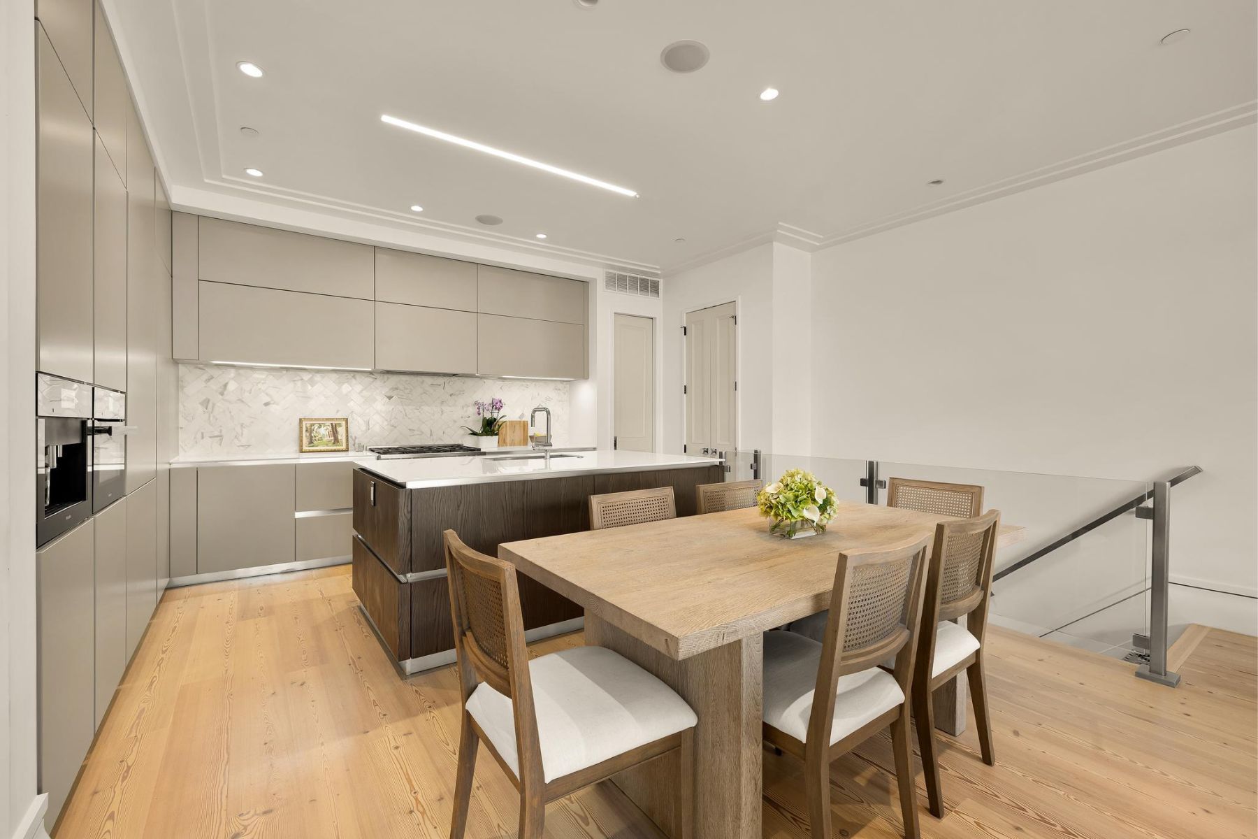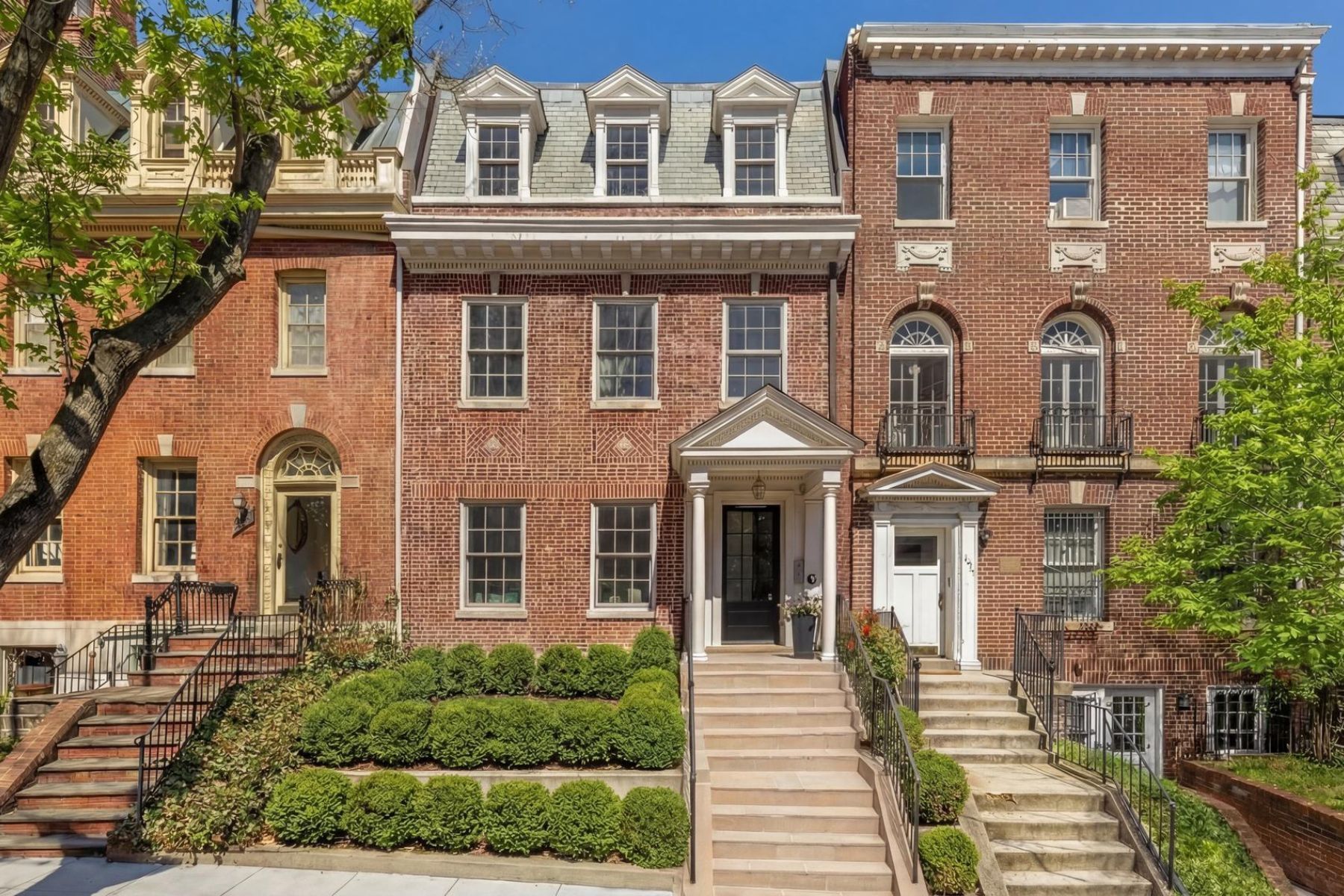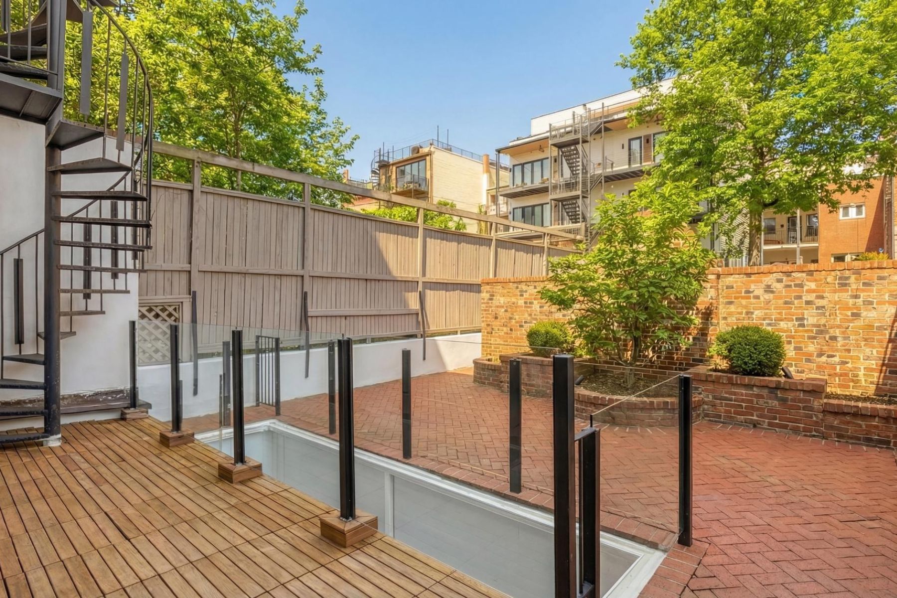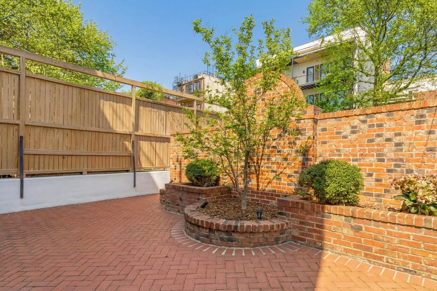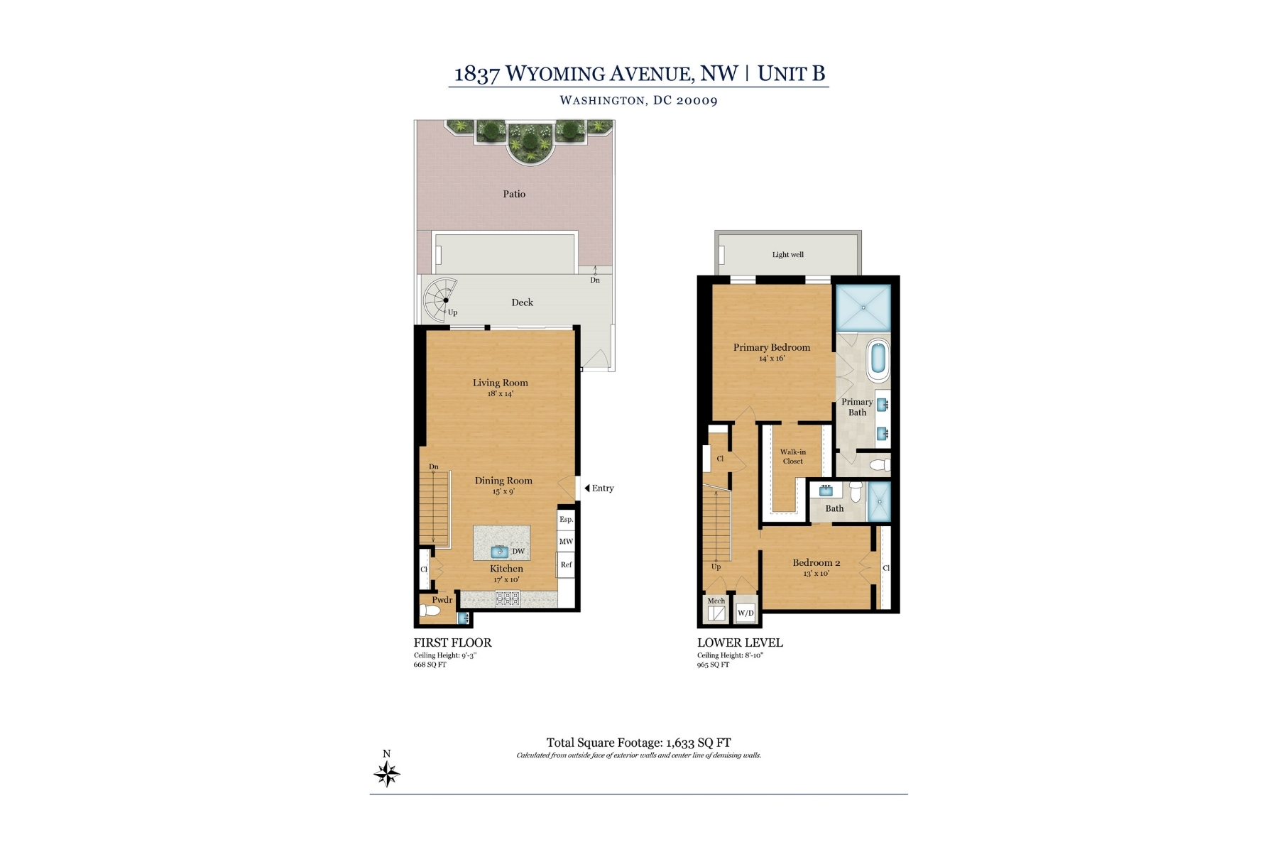1837 Wyoming Avenue is located on a tranquil block, straddling the boundary between the prestige of Kalorama and the energy of Adams Morgan, a boutique building comprising of luxury condominiums finished to the highest degree. The façade of the building evokes reserved elegance with its inlaid red brick and classic dormers. Amongst this distinguished company is Unit B, a private rear duplex spanning a generous 1,633 square feet of elegant living space. The main level is a fully open concept space encompassing living, dining, and kitchen areas. High ceilings, wide-plank white oak floors, recessed lighting, and a floor-to-ceiling glass wall opening onto the rear patio. The chef’s kitchen combines form and function, with Italian cabinetry complementing a herringbone marble backsplash and contrasting Dekton center island and suite of Miele appliances, including a commercial-grade gas range and built in espresso machine. The outdoor space, with its brick paver patio, and uplit landscaping, is a coveted amenity in such a central location. A glass-railed staircase leads down to the bedroom level, where the primary bedroom showcases herringbone white oak floors. Double doors open into the ensuite bath with contrasting dark and light marble, featuring heated floors, a double floating vanity, freestanding soaking tub, and oversized walk-in glass shower. A walk-in custom California Closet completes the suite. The second bedroom also features ample storage and a marble ensuite bath with radiant floor heating. Glistening Emtek hardware and a surround sound system are found throughout. Convenient in-unit laundry, a separate powder room, and available RENTAL PARKING are additional desirable features. A second rental space is also available. The location is truly incomparable, being steps from the natural retreat of Kalorama Park, and vibrant dining scene including Lapis, Maison Bar a Vin, Cana, and Tatte.