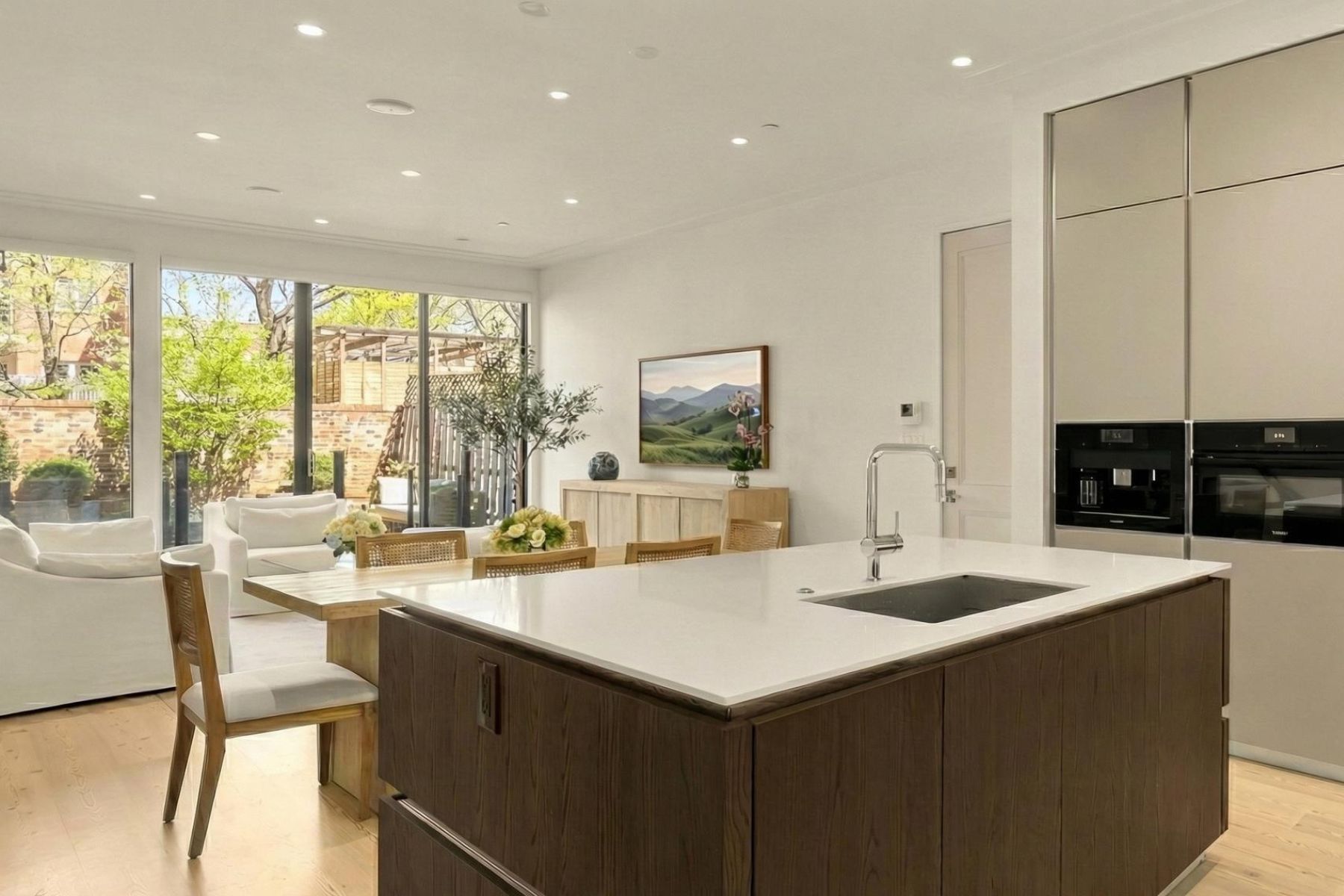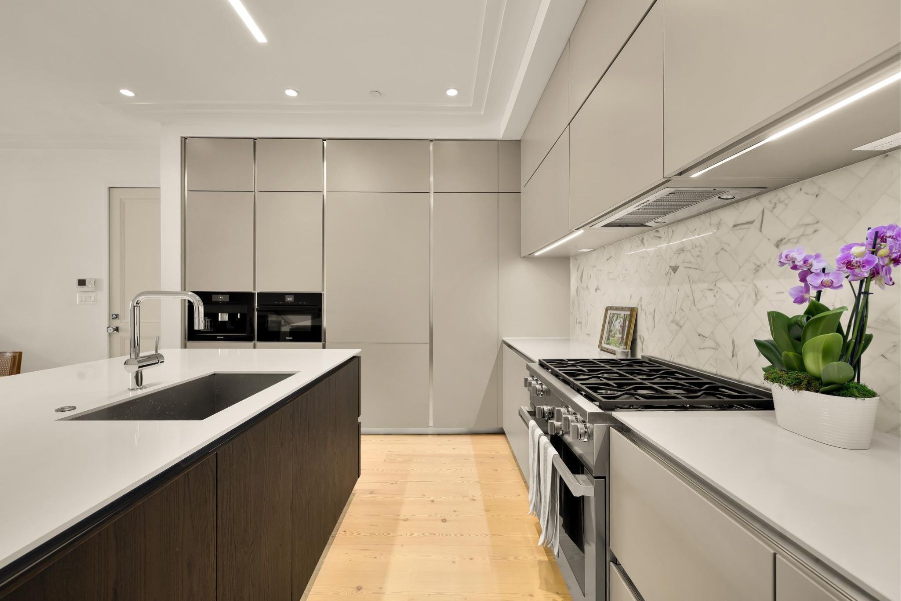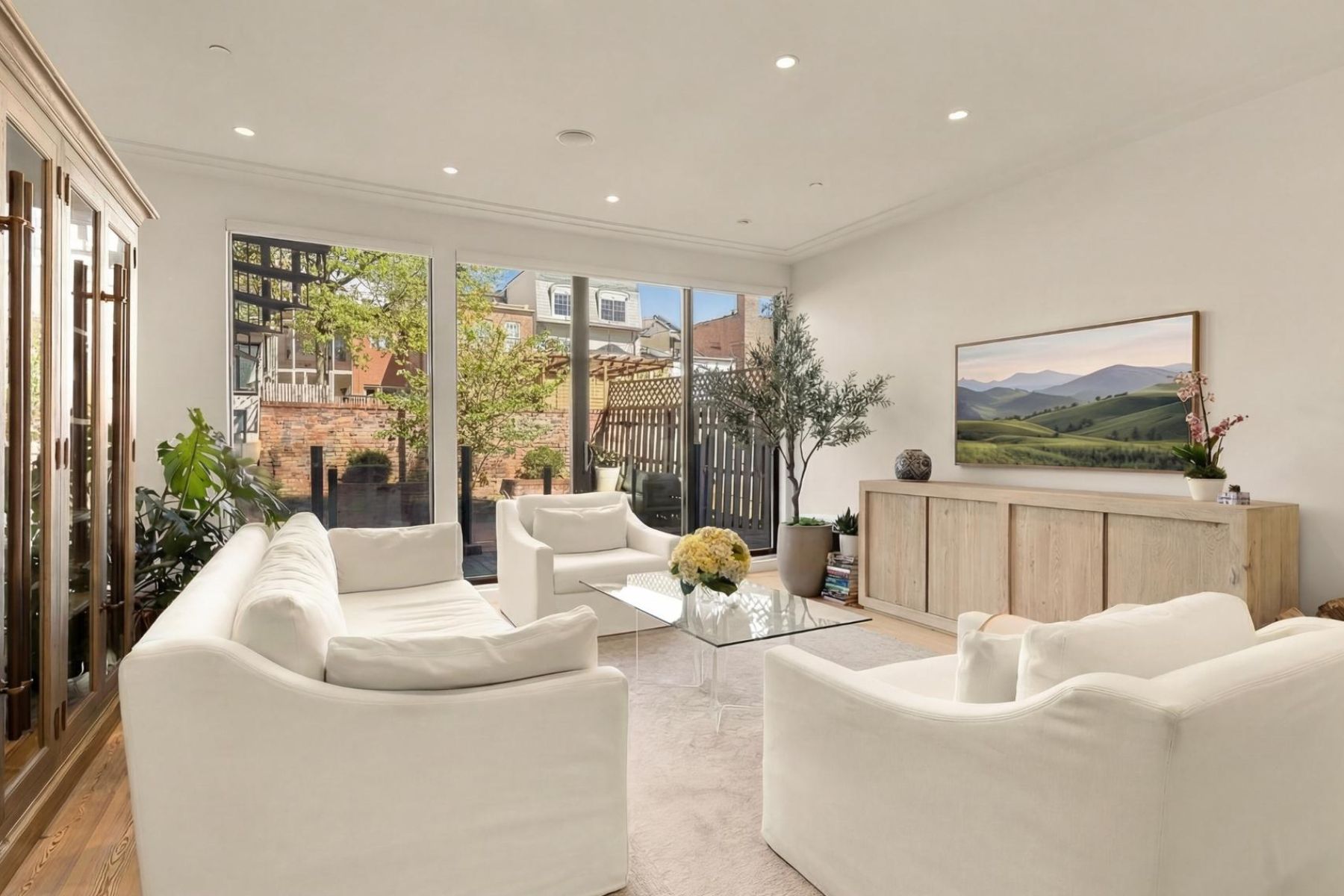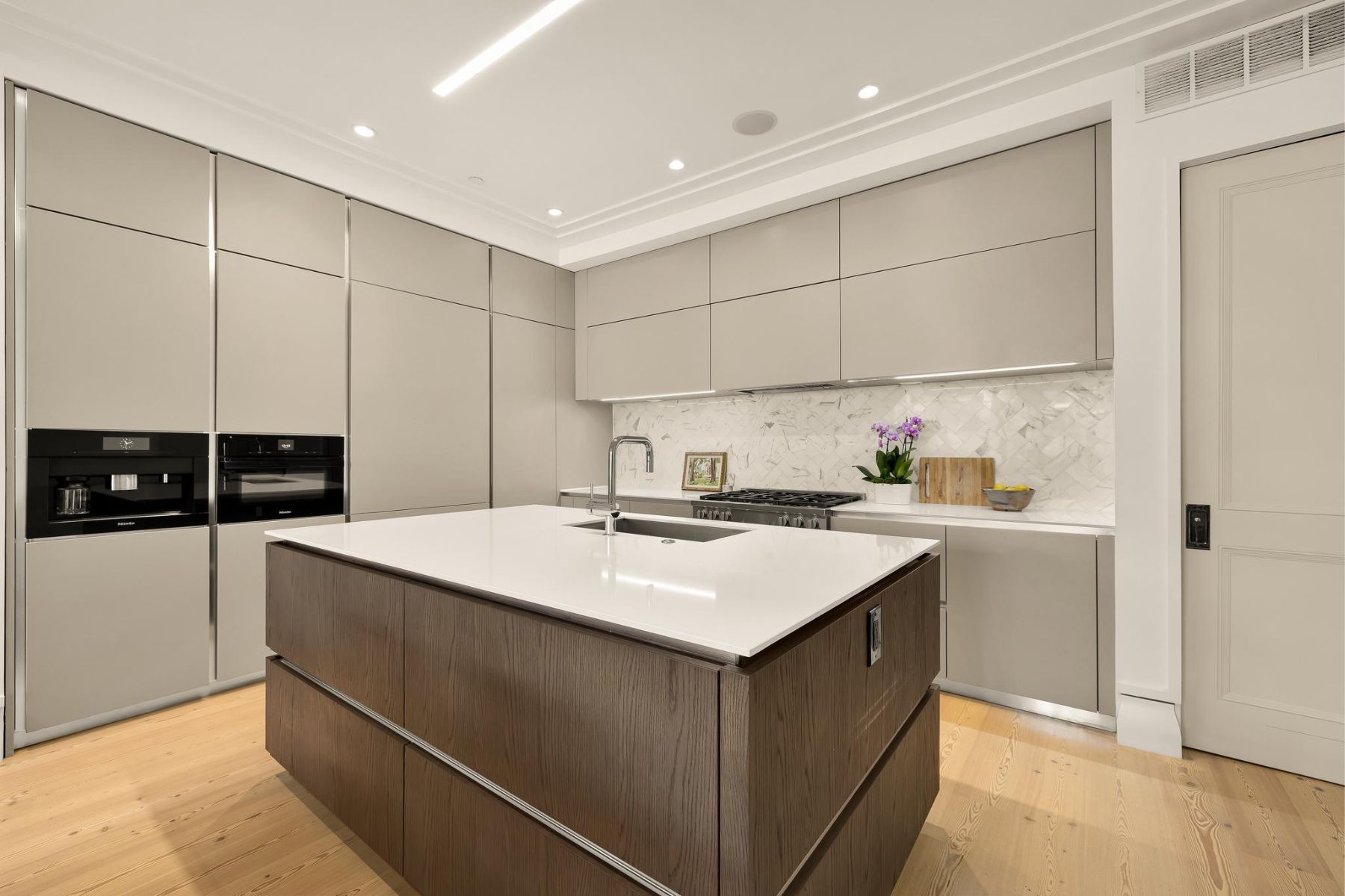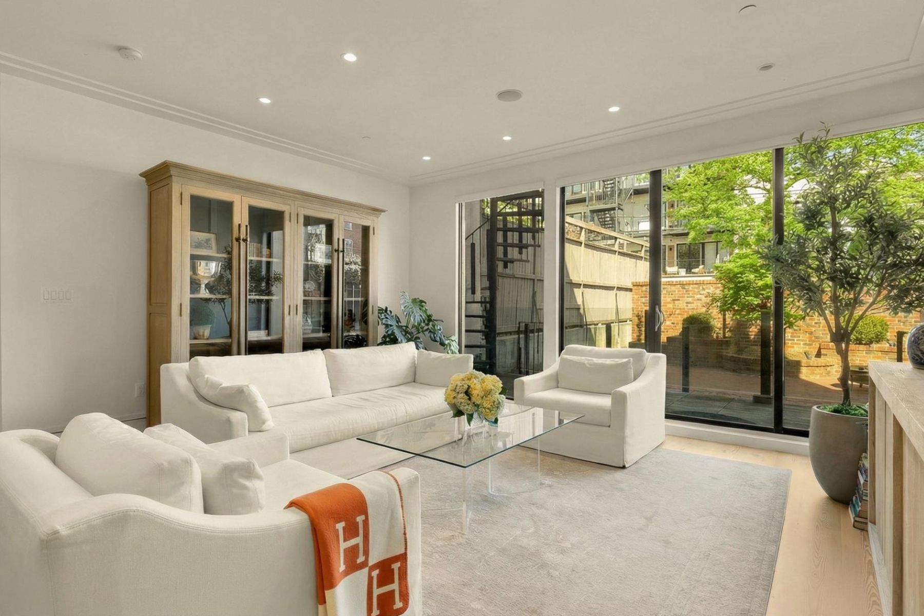 1837 Wyoming Avenue is located on a tranquil block, straddling the boundary between the prestige of Kalorama and the energy of Adams Morgan, a boutique building comprising of luxury condominiums finished to the highest degree. The façade of the building evokes reserved elegance with its inlaid red brick and classic dormers. Amongst this distinguished company is Unit B, a private rear duplex spanning a generous 1,633 square feet of elegant living space. The main level is a fully open concept space encompassing living, dining, and kitchen areas. High ceilings, wide-plank white oak floors, recessed lighting, and a floor-to-ceiling glass wall opening onto the rear patio. The chef’s kitchen combines form and function, with Italian cabinetry complementing a herringbone marble backsplash and contrasting Dekton center island and suite of Miele appliances, including a commercial-grade gas range and built in espresso machine. The outdoor space, with its brick paver patio, and uplit landscaping, is a coveted amenity in such a central location. A glass-railed staircase leads down to the bedroom level, where the primary bedroom showcases herringbone white oak floors. Double doors open into the ensuite bath with contrasting dark and light marble, featuring heated floors, a double floating vanity, freestanding soaking tub, and oversized walk-in glass shower. A walk-in custom California Closet completes the suite. The second bedroom also features ample storage and a marble ensuite bath with radiant floor heating. Glistening Emtek hardware and a surround sound system are found throughout. Convenient in-unit laundry, a separate powder room, and available RENTAL PARKING are additional desirable features. A second rental space is also available. The location is truly incomparable, being steps from the natural retreat of Kalorama Park, and vibrant dining scene including Lapis, Maison Bar a Vin, Cana, and Tatte.