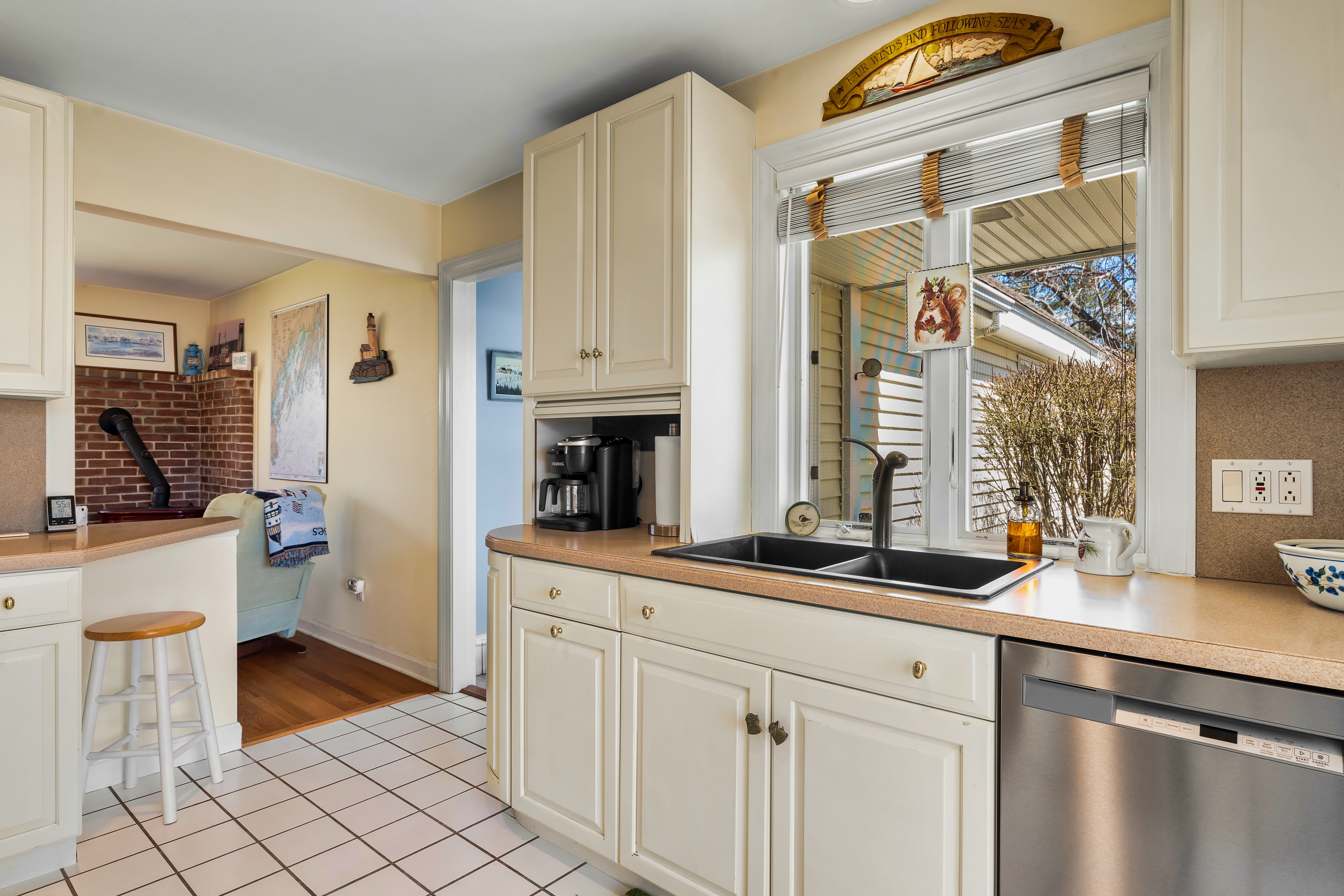 Inside, the home welcomes you with vaulted ceilings and sun-filled spaces that include a connected living room, dining area, and a cozy sunroom featuring a daybed, perfect for afternoon reading, morning coffee, or a quiet nap after a day in the sun. Large southern-facing windows let in soft natural light all day, creating a warm and airy atmosphere that embraces the ease of summer living. With three spacious bedrooms—one on the first floor and two on the second floor—this home offers a flexible layout ideal for families, couples, or multi-generational guests. Each bedroom is thoughtfully appointed for comfort and privacy, making it easy to settle in and feel at home.