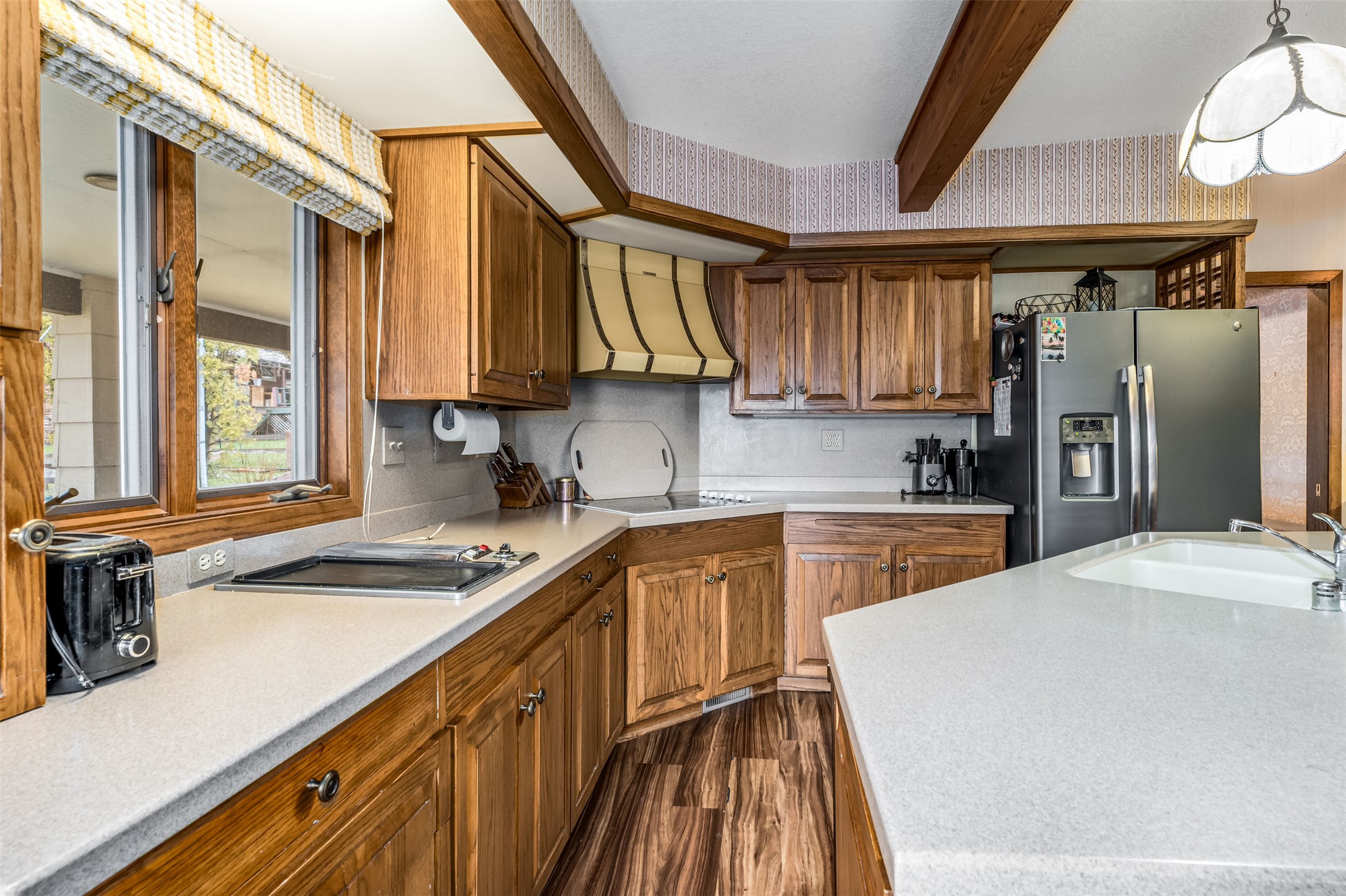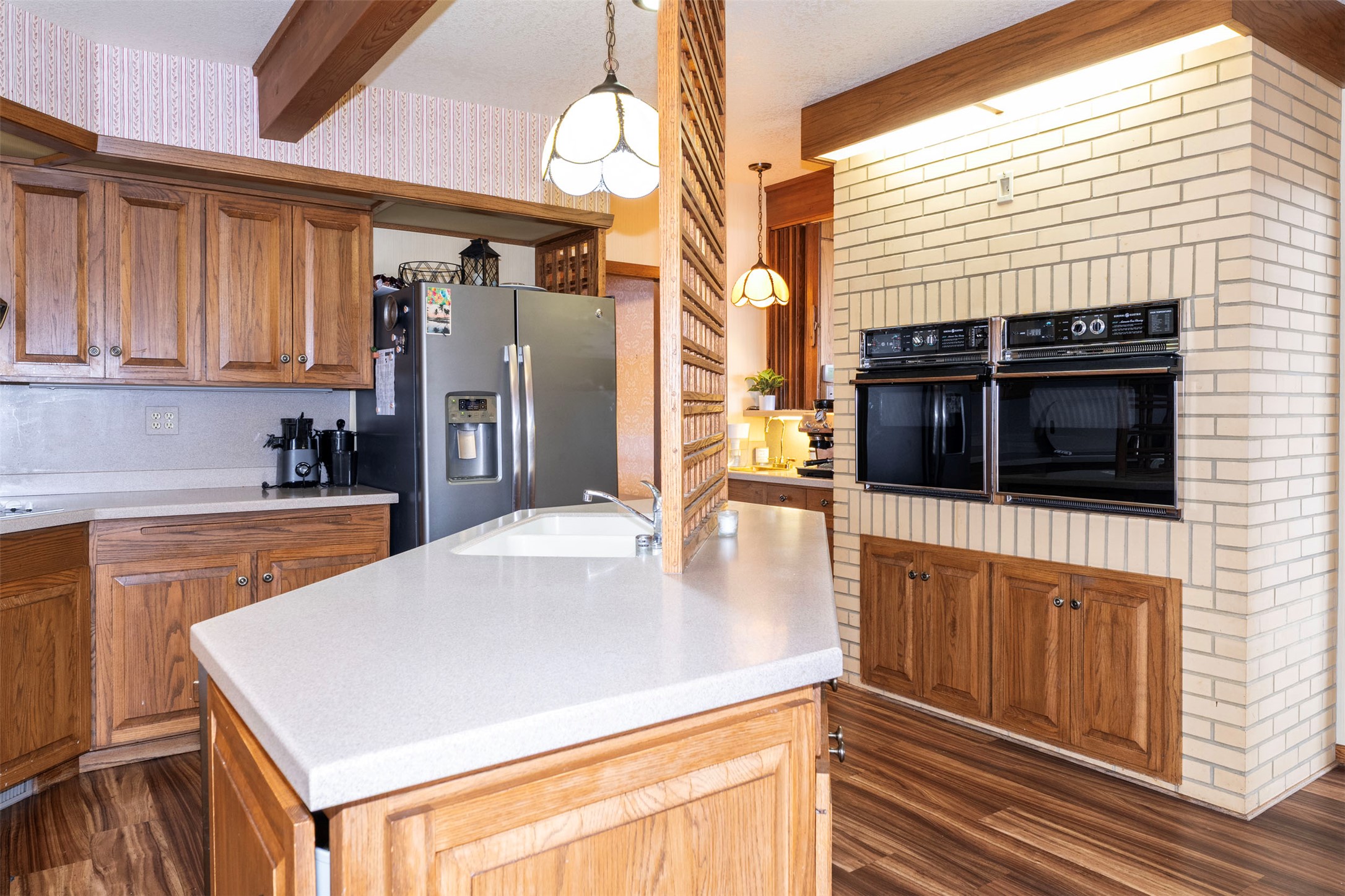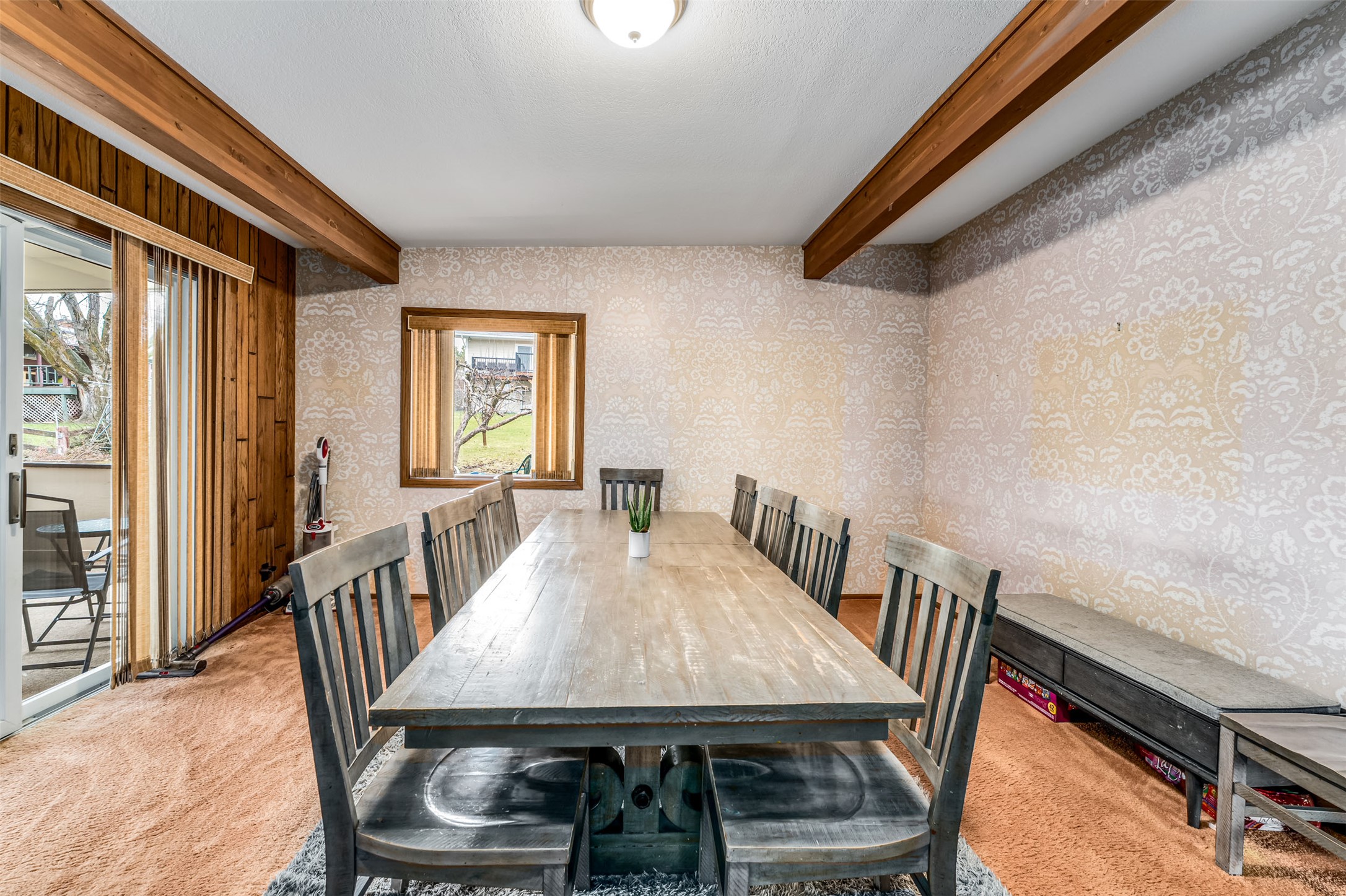 Welcome home to 312 Crestview Rd. This spacious single-family residence offers comfort and character throughout. The main-level living room is the heart of the home, featuring large picture windows that fill the space with natural light, a stone-surround fireplace, and vaulted ceilings with exposed beams that create an open, airy feel. A distinctive wood accent wall adds warmth and rustic charm. The well-appointed kitchen is designed for both everyday living and entertaining, complete with a large island, double ovens, and a wall-mounted chimney range hood. The kitchen and dining area both provide access to the covered back patio, making indoor-outdoor living easy and enjoyable. The bathrooms offer comfort and functionality, with two located on the main level and one on the lower level. The main level also features the primary suite with an attached bathroom and two closets, along with an additional guest bedroom with its own attached bathroom. The lower-level walk-out basement expands your living space with a large family room, bonus room, additional bedrooms, storage room, mechanical room, and a workshop area with a garage door for added convenience. Step outside to enjoy the outdoor living spaces, including a private covered patio. The covered carport also includes a large storage area. With room to spread out and spaces to gather, this residence provides both comfort and versatility for everyday living.