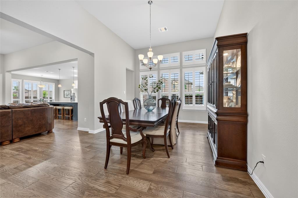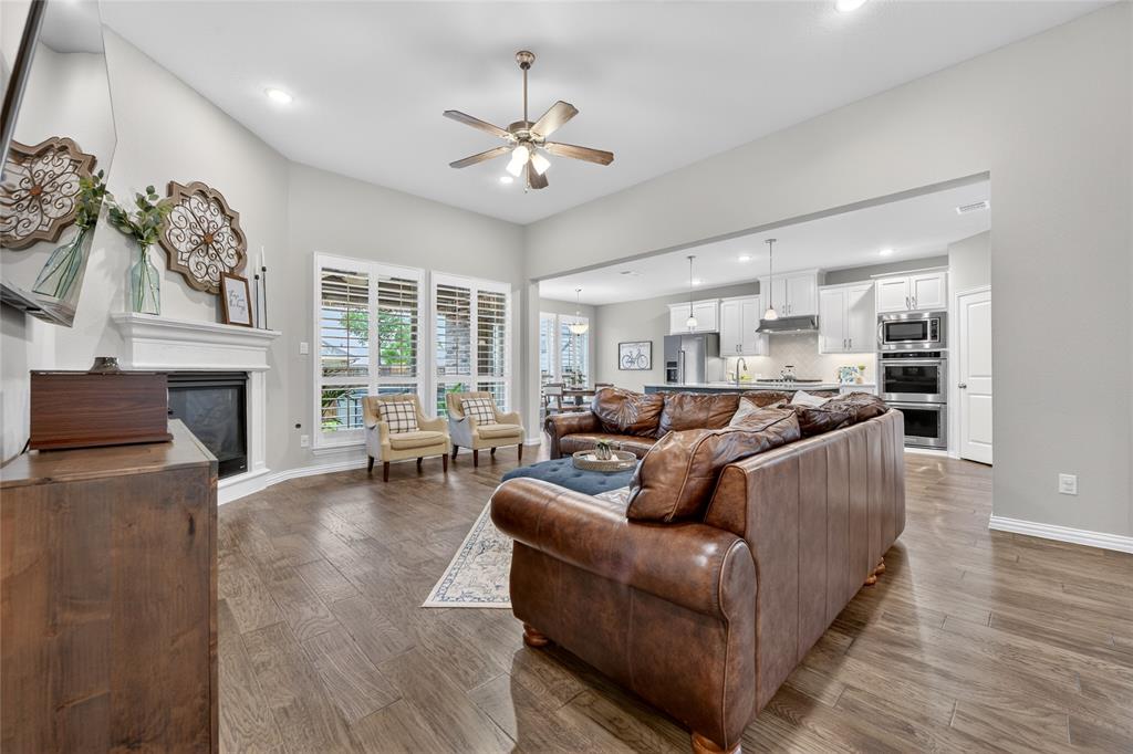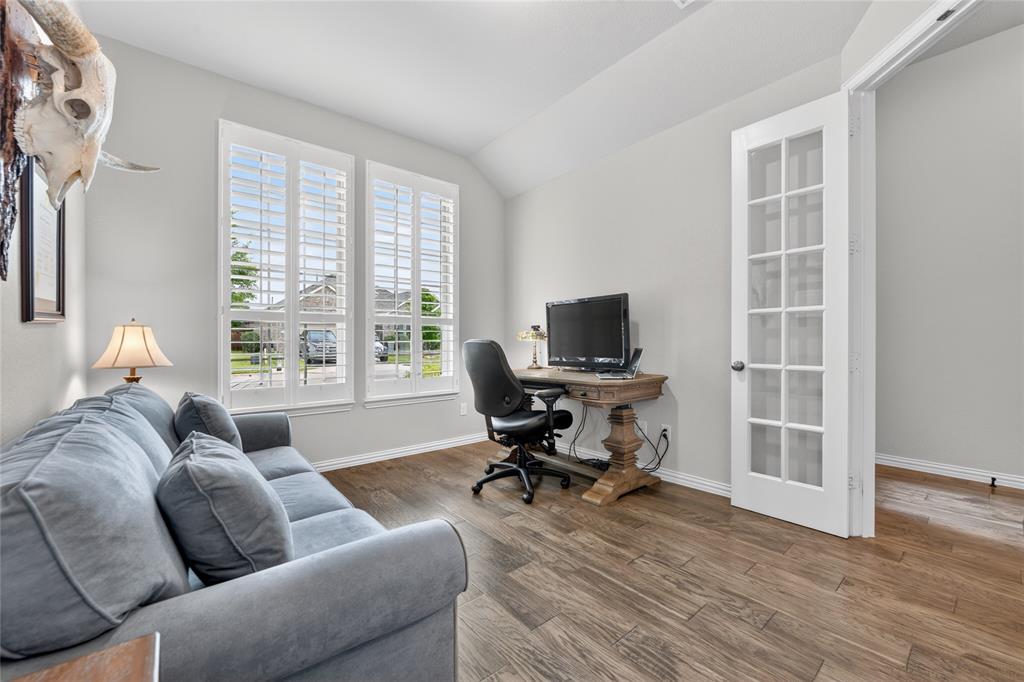 Natural light streams through elegant plantation shutters to illuminate this sprawling single-story nestled on a large corner lot, where tall ceilings and extensive wood flooring set a tone of airy sophistication. Unwind in the open-concept living area featuring a cozy gas log fireplace and flat screen wiring, perfect for both quiet evenings and grand entertaining. Culinary dreams come alive in the modern kitchen boasting crisp white cabinets, quartz counters, a farmhouse sink, and a stylish herringbone patterned backsplash. Equipped for the serious chef, the space features a double oven, gas cooktop, a walk-in pantry, and a social island with a breakfast bar. Productivity meets versatility in the dedicated home office, where French doors and a private closet offer a quiet workspace or a fourth bedroom flex space. Escape to the secluded primary suite, a spa-like retreat featuring separate granite vanities, dual linen closets, and a massive walk-in closet with custom built-ins and seasonal storage. This private haven offers an ingenious laundry room pass-through, streamlining your daily routine with unparalleled convenience. Entertainment is elevated in the windowless, dedicated media room, fully equipped with a projector, screen, and built-in speakers for the ultimate cinema experience. The low-maintenance backyard features a huge covered patio with a remote-controlled awning and a cozy hot tub, ideal for year-round relaxation. Modern essentials abound, including a smart doorbell, whole-house WiFi extenders, a tankless water heater, and a spacious garage with epoxy flooring. Neighborhood amenities include the Canyon Falls Club for gatherings and social activities, multiple pools, a fitness center, dog park, the Hay Barn and Porch for events, and miles of trails, with the benefit of attending the highly sought-after Byron Nelson High School in this turnkey Northlake gem. Take a first-person look at this gorgeous home! Click the Virtual Tour link to see the 3D Tour!
