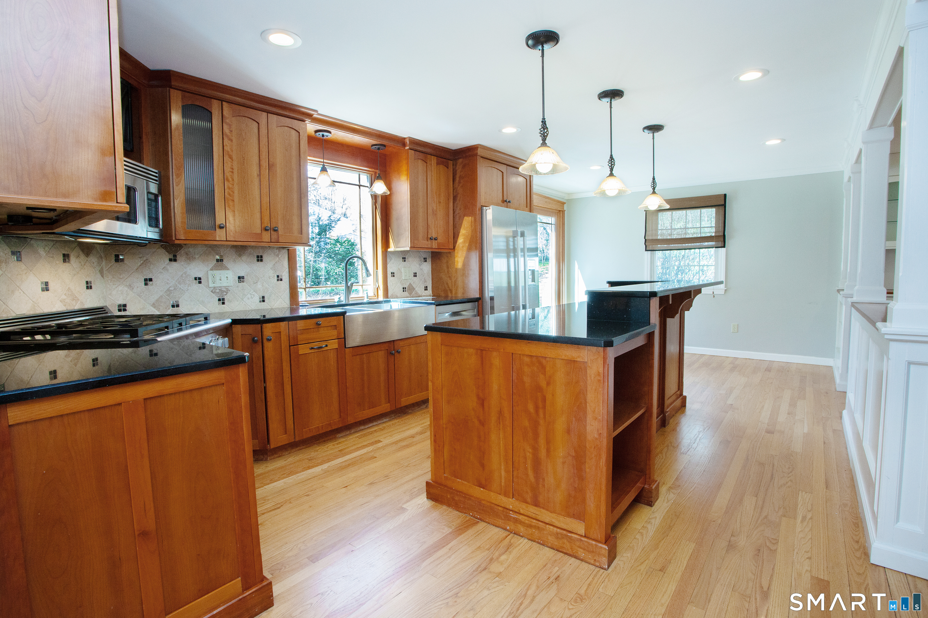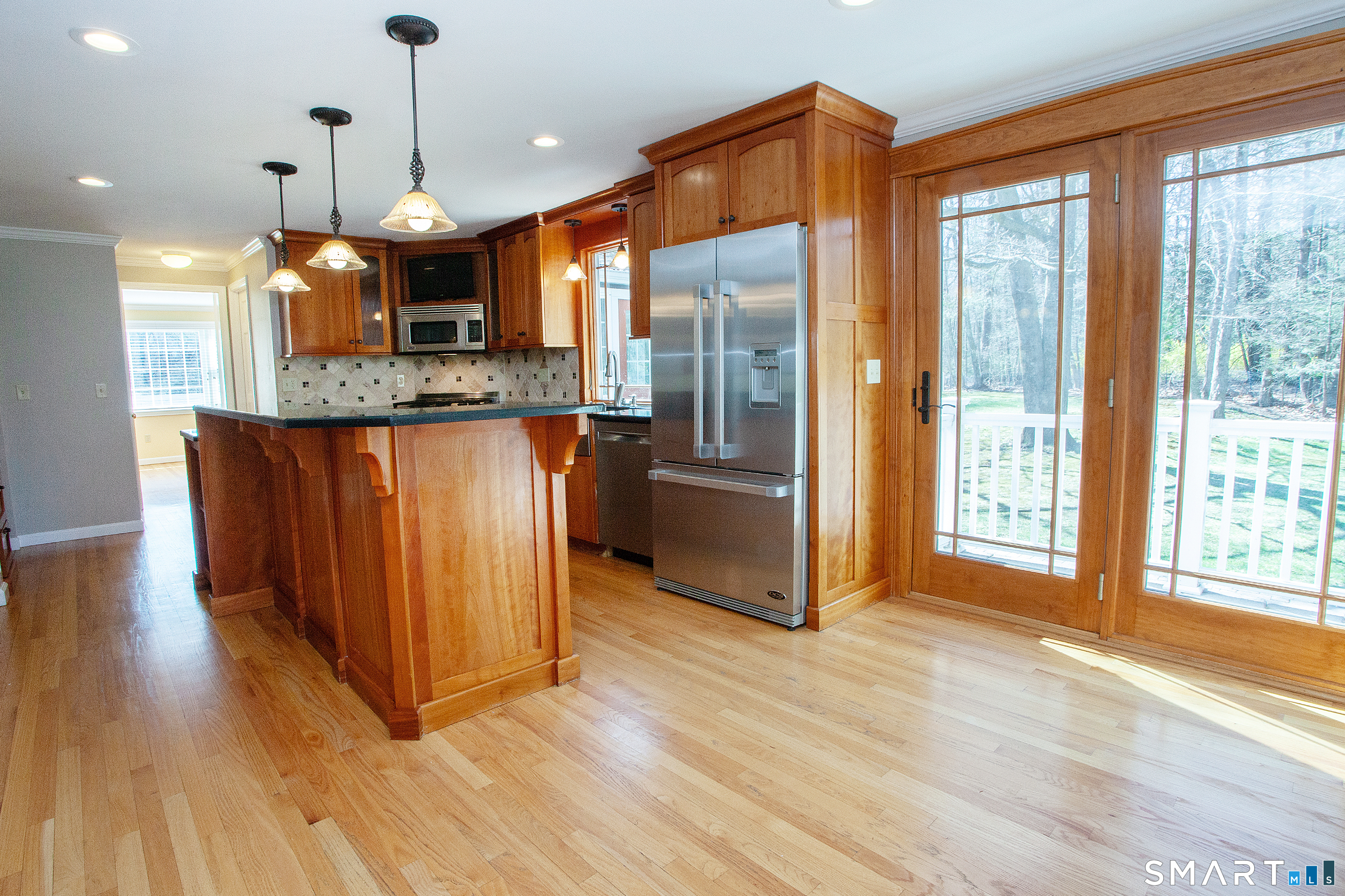 Beautifully maintained 4-bedroom home offering a perfect blend of classic charm and modern updates! This spacious property features gleaming wood floors throughout, new windows, and updated 6-panel doors. The bright kitchen boasts granite countertops, stainless steel appliances, a new dishwasher, and an island with bar seating, plus French doors leading to a private patio-ideal for indoor/outdoor entertaining. Enjoy multiple living spaces including a cozy family room with garage access and a stunning 4-season porch (added 2025) with heat, A/C, providing year-round enjoyment. The dining area features a wood-burning stove and connects to a charming butler's pantry with cherry cabinetry. Upstairs offers 4 generously sized bedrooms, including a primary suite with walk-in closet and a private fireplace. Bathrooms feature tile finishes, with both a full bath and an additional tiled shower. The partially finished basement includes a workshop area, storage shelving, sump pump, and bulkhead access. Updates include exterior paint (2024), gutter guards (2025), chimney liner (2020) and recent cleaning (2025). Additional highlights include natural gas heat with central air, 200-amp electrical, a whole-house automatic generator, public utilities, and a 2-car garage. Outdoor features include granite front steps, patio with lighting, and a storage shed. A wonderful opportunity to own a well-cared-for home with space, functionality, and thoughtful updates throughout.