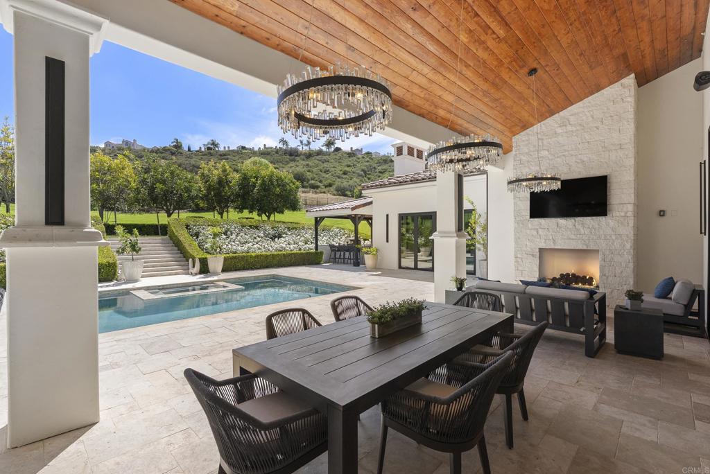 Set within the prestigious guard-gated Del Mar Country Club, this estate is defined by scale, natural light, and a design that reveals itself from the moment you enter. A dramatic two-story entry and sweeping staircase draw you in, crowned by a cascading glass globe chandelier and framed by a wall of glass opening to the pool and private grounds. A curated palette carries throughout with DuChateau Savanna wide-plank European white oak flooring, striking feature walls, and sculptural lighting. New Pella Impervia windows and Black Diamond steel doors featured throughout. The kitchen is anchored by a large island with Wolf and Sub-Zero appliances, flowing to the daily dining area, where glass doors open to the California room. The formal dining room offers its own patio with fairway views. The family room is defined by a full quartzite slab fireplace, a statement wine display wall, and French doors opening to the patio. The main-level primary suite features a floor-to-ceiling stone fireplace, two custom walk-in closets, and a full wall of glass opening to the outdoors. The spa bath is exceptional, with a soaking tub, walk-in shower, and dual vanities set against a dramatic full quartzite slab wall. An office with its own fireplace opens to a private patio. The powder room earns its own moment with a fluted Calacatta marble floating vanity, a diamond mosaic marble tile wall, and brushed brass fixtures. Upstairs: a theater room, two en-suite bedrooms with private balconies, and two additional rooms joined by a Jack-and-Jill bath, one appointed as a gym with an infrared sauna. A detached casita offers private guest accommodation with its own entrance and garage. Outdoors, a California room with a fireplace, pool, spa, and outdoor kitchen opening to an expansive yard and fruit trees. This property includes exclusive use of an additional 0.59 acres of Lot 7. Ultimately a home that reveals itself gradually and stays with you long after you leave.