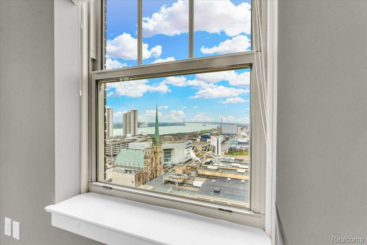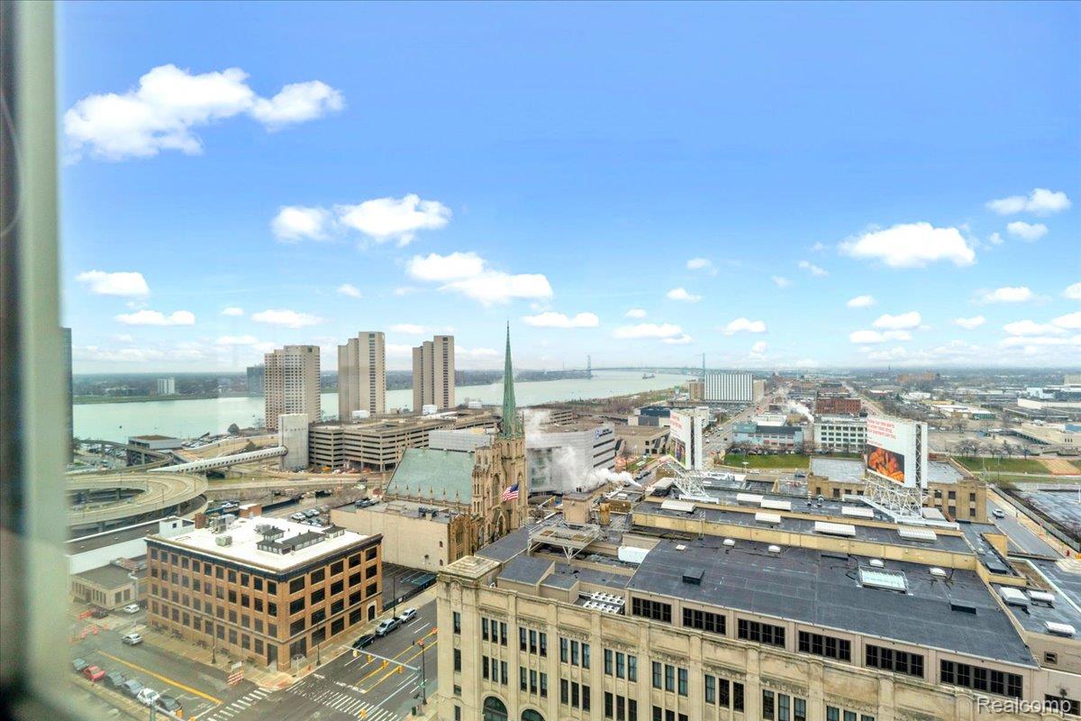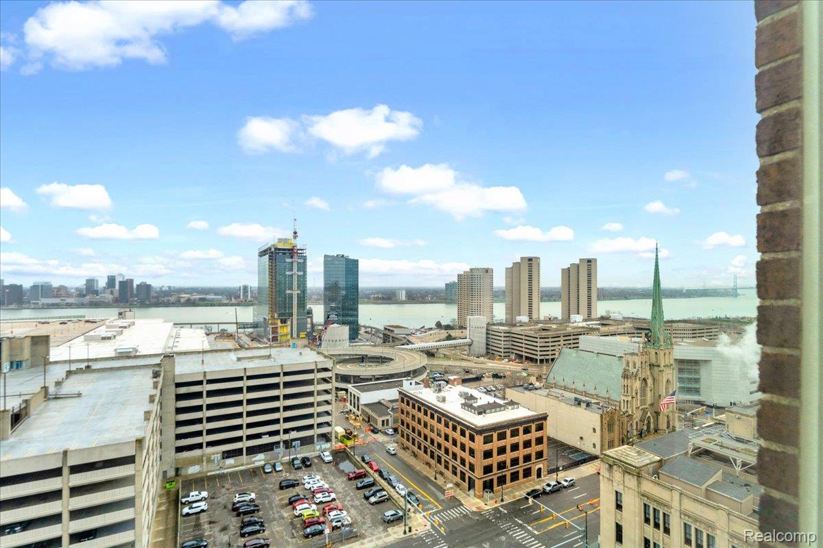 Experience elevated downtown living in this expansive 1,443 sq ft double-corner home located in the iconic Albert Kahn-designed building at 525 W Lafayette Blvd. Situated on the 16th floor, this 2-bedroom, 2-bath condo offers sweeping panoramic views of the Detroit River and Canadian skyline. Abundant natural light by day and a truly unique views at night. Views: River/Canada (south) from the primary bedroom, living room and bay window, Bridges/City (east) from LR and 2nd bedroom, City/Building (north) from the 2nd bedroom. End unit = Very little foot traffic outside your door, and limited common walls for privacy. The open-concept layout features a large living and dining area with beautiful flooring and over-sized window exposures - perfect for entertaining or relaxing while enjoying the view. The updated kitchen is equipped with stainless steel appliances, ample cabinetry, sleek countertops, and a spacious island with seating. The primary suite offers a generous footprint, walk-in closet, and a private en-suite bath with dual vanities, granite countertops, and a tiled walk-in shower. The second bedroom and full bath provide flexibility for guests, office space, or roommates. Added conveniences: In-unit full size laundry, keyless entry, reserved gated parking, one basement storage cage. Attached to the DoubleTree Suites by Hilton, residents enjoy access to hotel-style amenities, such as the beautiful lobby, restaurant/bar, coffee shop, and the hotel fitness center. Investor-friendly and ideal for owner-occupants alike, this unit also benefits from low NEZ-R taxes through 2033 - providing significant long-term savings. Unbeatable location just steps from Campus Martius, the Detroit Riverwalk, Huntington Place, Ford Field, Comerica Park, the People Mover, and some of Detroit's best dining, nightlife, and entertainment. A rare opportunity to own a spacious, move-in ready high-rise condo with incredible views in one of downtown Detroit's most historic and sought-after buildings.