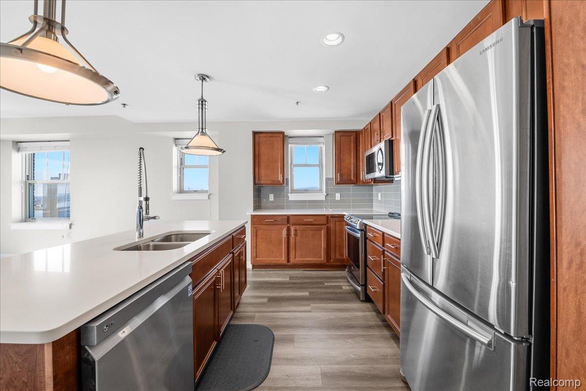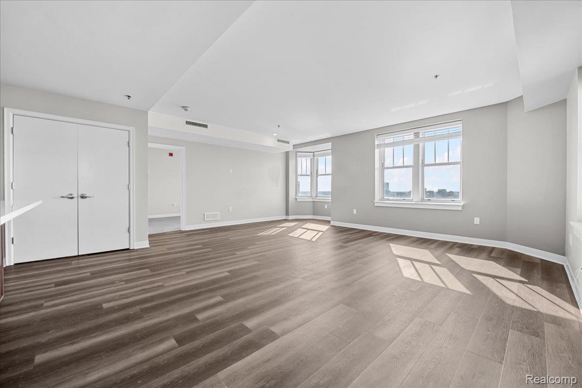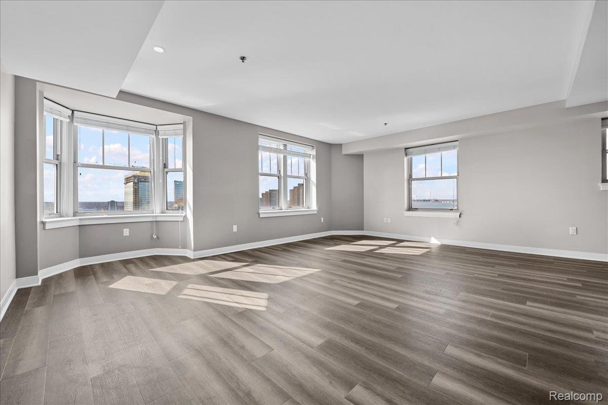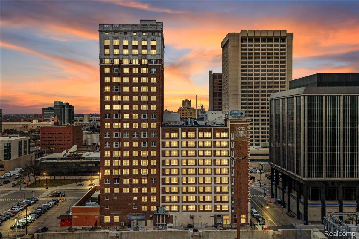 Experience elevated downtown living in this expansive 1,443 sq ft double-corner home located in the iconic Albert Kahn-designed building at 525 W Lafayette Blvd. Situated on the 16th floor, this 2-bedroom, 2-bath condo offers sweeping panoramic views of the Detroit River and Canadian skyline. Abundant natural light by day and a truly unique views at night. Views: River/Canada (south) from the primary bedroom, living room and bay window, Bridges/City (east) from LR and 2nd bedroom, City/Building (north) from the 2nd bedroom. End unit = Very little foot traffic outside your door, and limited common walls for privacy. The open-concept layout features a large living and dining area with beautiful flooring and over-sized window exposures - perfect for entertaining or relaxing while enjoying the view. The updated kitchen is equipped with stainless steel appliances, ample cabinetry, sleek countertops, and a spacious island with seating. The primary suite offers a generous footprint, walk-in closet, and a private en-suite bath with dual vanities, granite countertops, and a tiled walk-in shower. The second bedroom and full bath provide flexibility for guests, office space, or roommates. Added conveniences: In-unit full size laundry, keyless entry, reserved gated parking, one basement storage cage. Attached to the DoubleTree Suites by Hilton, residents enjoy access to hotel-style amenities, such as the beautiful lobby, restaurant/bar, coffee shop, and the hotel fitness center. Investor-friendly and ideal for owner-occupants alike, this unit also benefits from low NEZ-R taxes through 2033 - providing significant long-term savings. Unbeatable location just steps from Campus Martius, the Detroit Riverwalk, Huntington Place, Ford Field, Comerica Park, the People Mover, and some of Detroit's best dining, nightlife, and entertainment. A rare opportunity to own a spacious, move-in ready high-rise condo with incredible views in one of downtown Detroit's most historic and sought-after buildings.