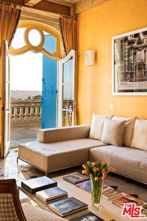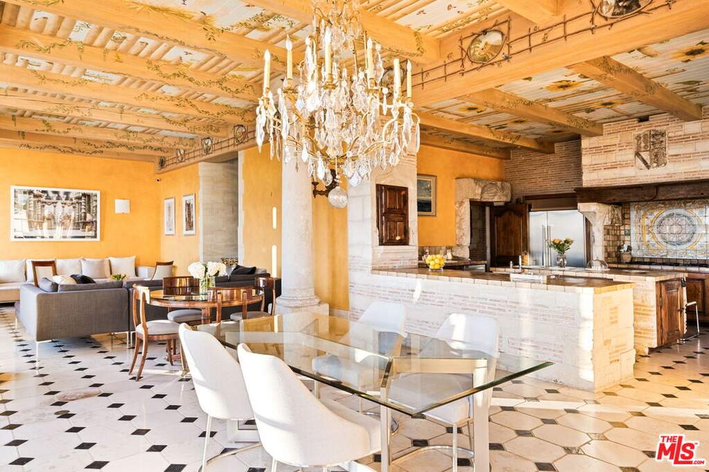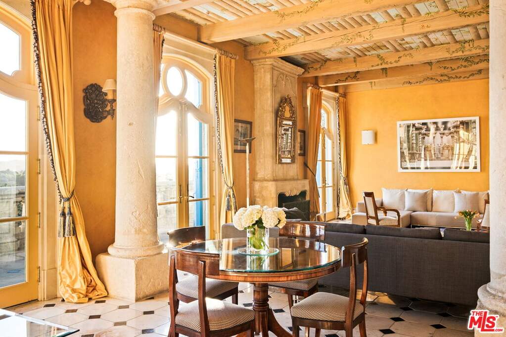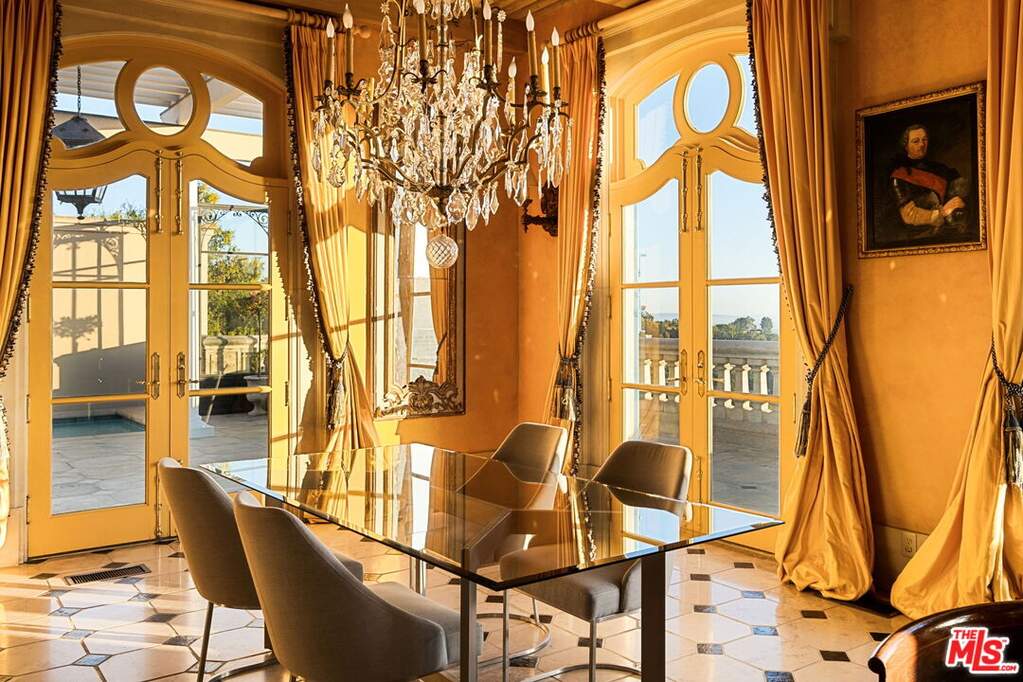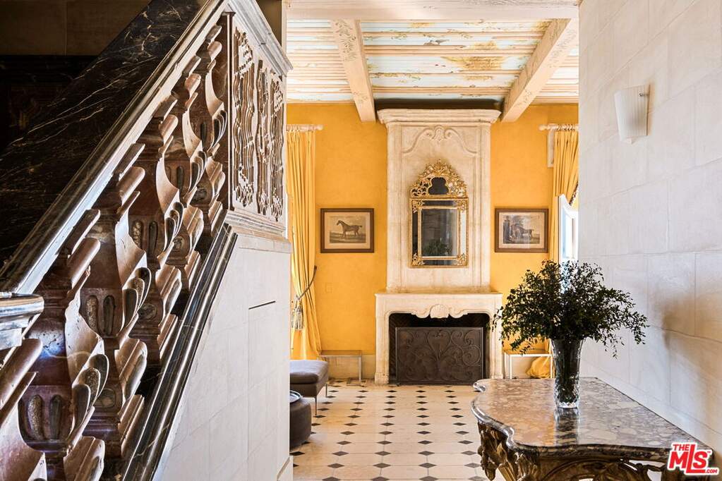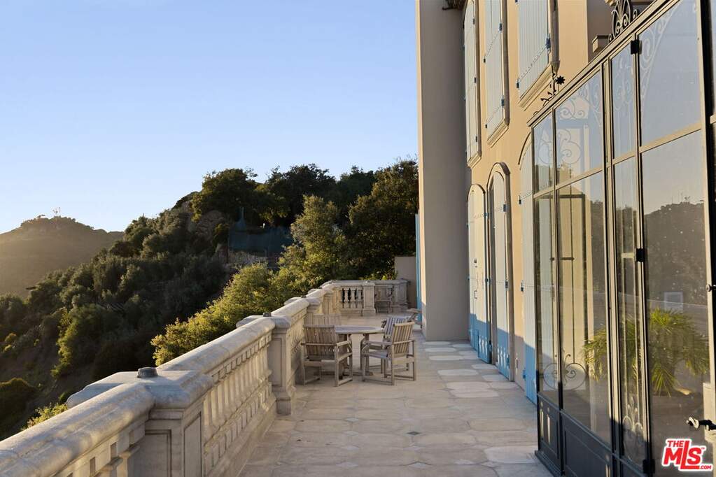 Step into the romance of the French countryside right in the heart of the Hollywood Hills. This fully furnished French Renaissance inspired chateau, perched high above Mulholland Drive, offers sweeping city, canyon, and ocean views that define California luxury. Cloaked in ivy, the residence's facade evokes centuries of history, adorned with authentic 15th-century hand-carved stone angels and gargoyles imported from France. Beyond the grand entrance, time seems to stand still. Inside, exquisite craftsmanship and timeless elegance abound. A stately 16th-century marble staircase ascends to the upper level, where three sumptuous bedrooms await. The grand primary suite serves as a true sanctuary, complete with an en-suite salon featuring a painted and gilded boiserie masterpiece. A fourth guest suite, with a private entrance, lies downstairs. Designed for effortless entertaining and refined living, the home seamlessly blends indoor and outdoor spaces. French doors flood the interiors with natural light, while the painted stone walls and graceful architectural details exude old-world charm. Expansive terraces provide inviting spaces for lounging or al fresco dining, all framed by panoramic vistas that stretch from the canyon to the glittering skyline and out to the ocean beyond.
