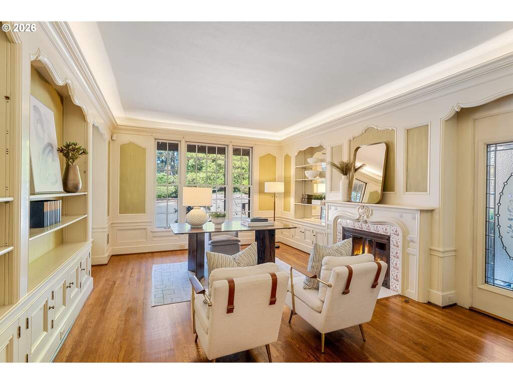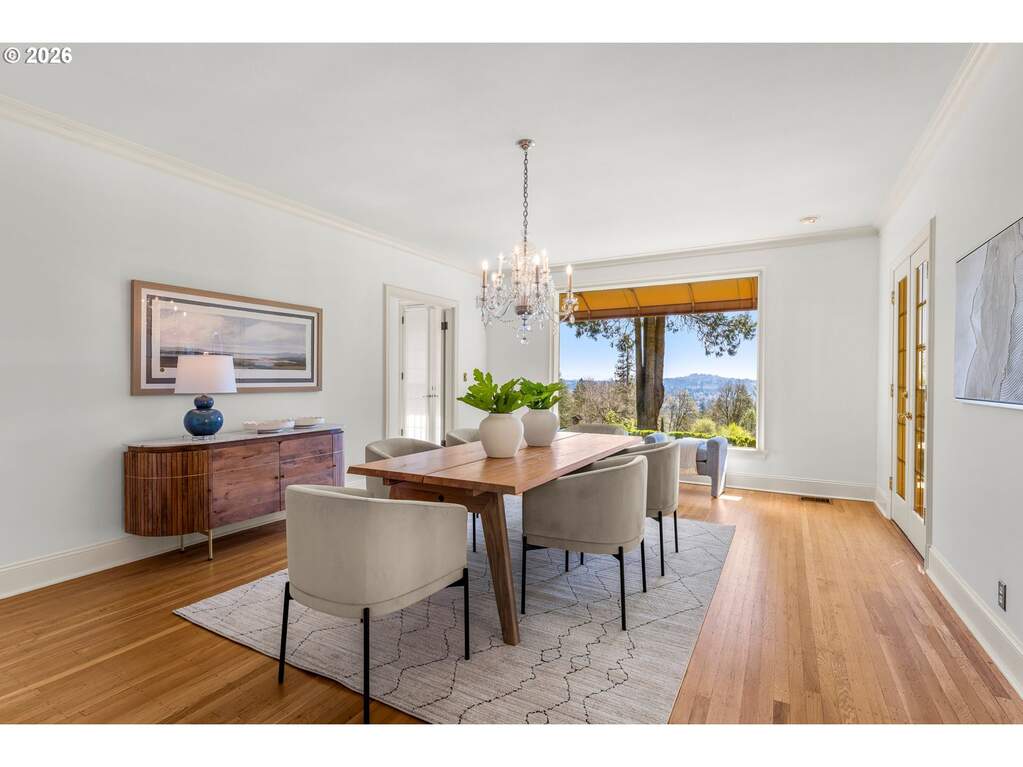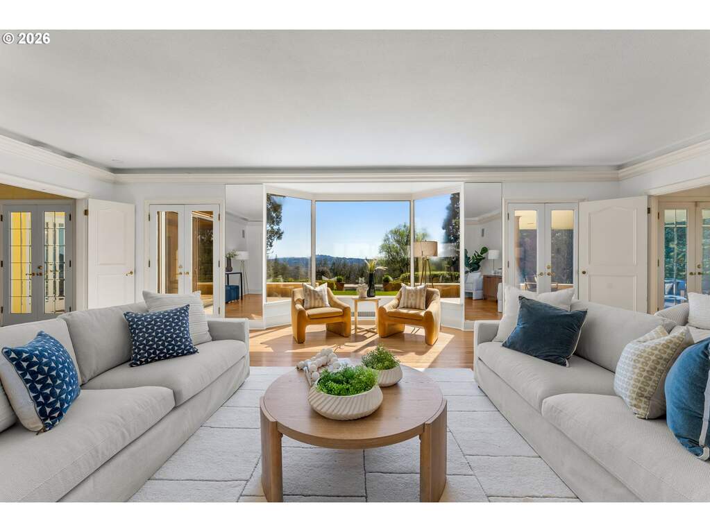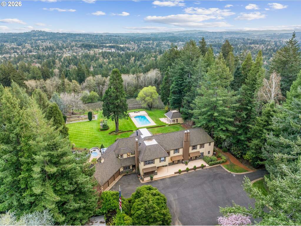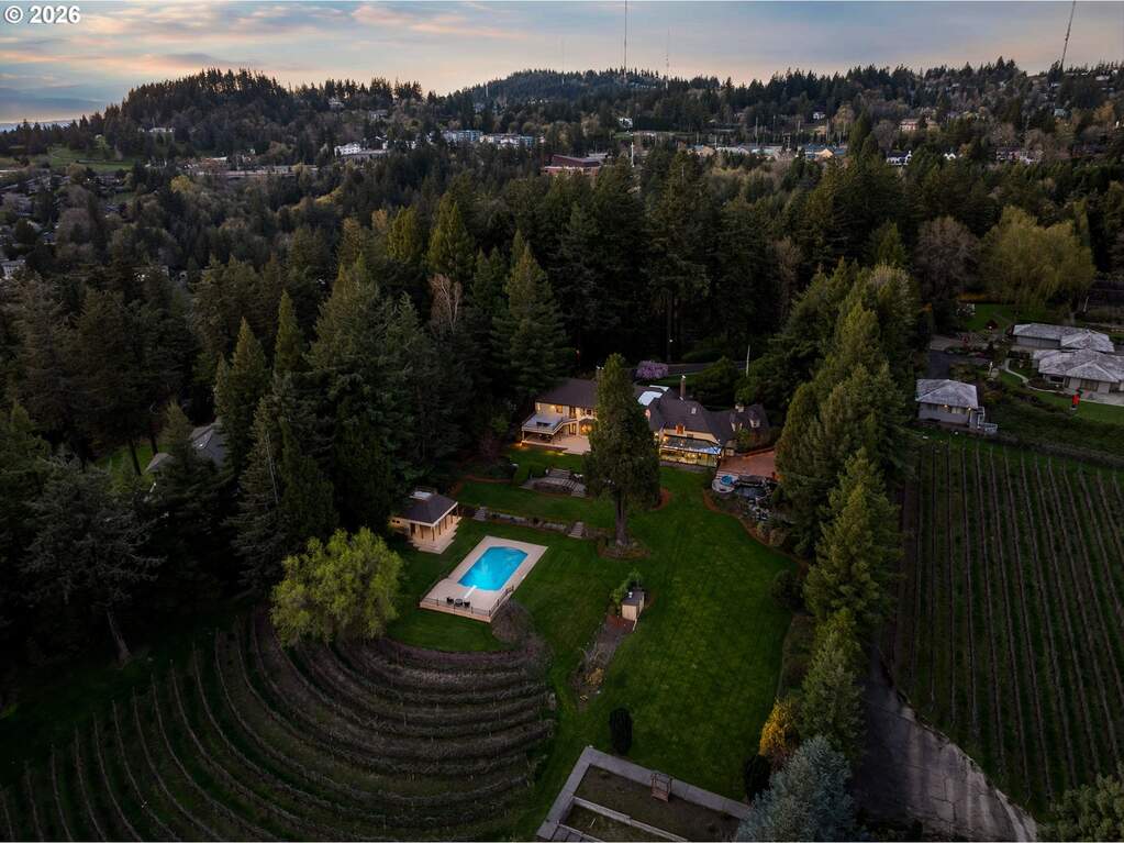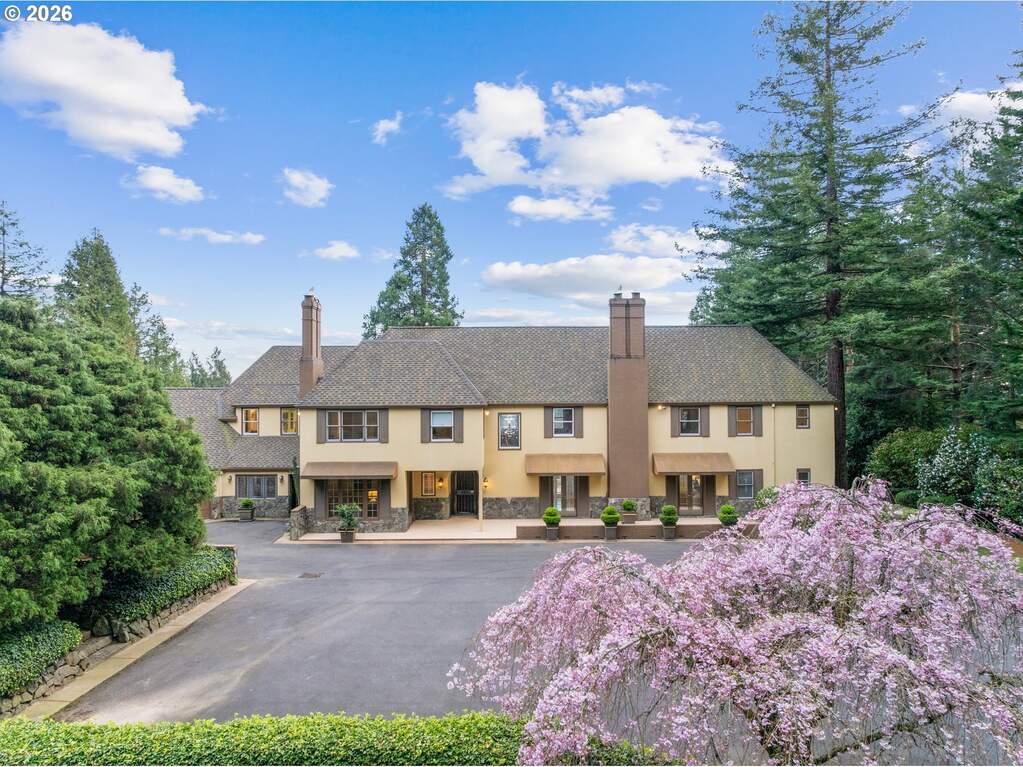 Set on an incredibly rare eight private acres in Portland's prestigious Southwest Hills, the historic Merlo Estate offers a once-in-a-generation opportunity to experience timeless Pacific Northwest elegance in a breathtaking vineyard setting designed for unforgettable entertaining. Built in 1939, this stately residence was home to influential Portlanders whose business, civic, and philanthropic legacies helped shape the city.Set behind a gated entrance in unincorporated Multnomah County, the estate blends classic architectural character with the natural beauty of the surrounding landscape. Expansive grounds showcase sweeping vineyard views, including three acres of private vineyards, along with resort-style amenities such as a saltwater pool with adjacent hot tub and fully equipped outdoor kitchen, a lighted tennis court, and bocce ball court, perfect for gatherings large and small.The home's architecture reflects a refined yet grounded aesthetic, with a stucco exterior, copper accents, painted shutters, and a striking arched entryway. Inside, warmth and craftsmanship define the spaces, featuring custom millwork designed specifically for the Merlo family, generous room sizes, and abundant natural light.Large formal living and dining spaces capture incredible views of the pool and vineyards, creating an elegant setting for entertaining. Just off the kitchen, a spacious sitting room with floor-to-ceiling windows brings the outdoors in and offers a bright, inviting place to gather.Designed for both everyday living and entertaining, the main floor living room opens seamlessly to an expansive patio, offering stunning views, an idyllic backdrop for hosting and relaxation alike. The primary suite is a true retreat, complete with a fireplace and dual bathrooms, offering both comfort and privacy.The lower level enhances the home's resort-like feel with a sauna, hot tub and wine storage while a 3 car attached garage and 1070 sq ft outbuilding offer flexibility for events
