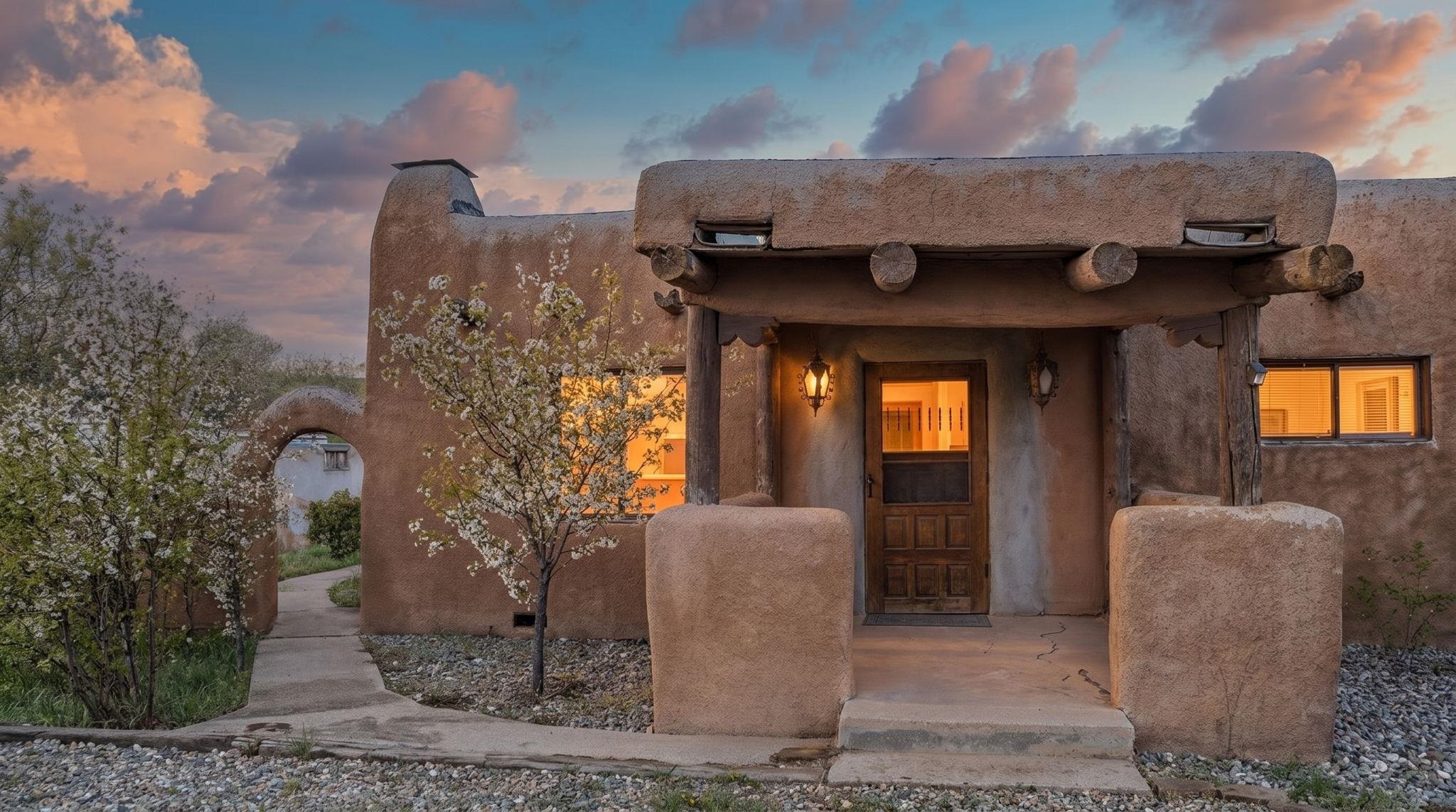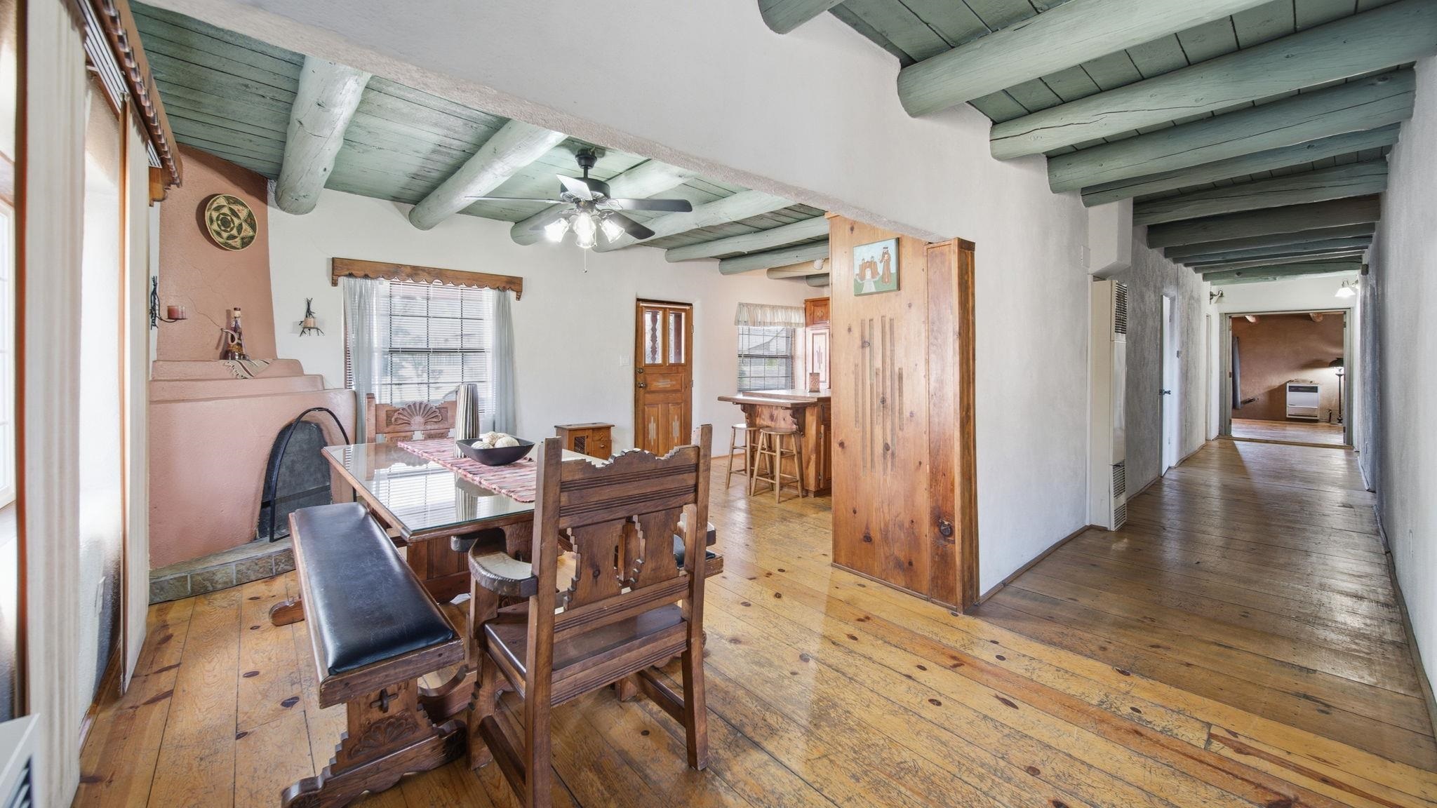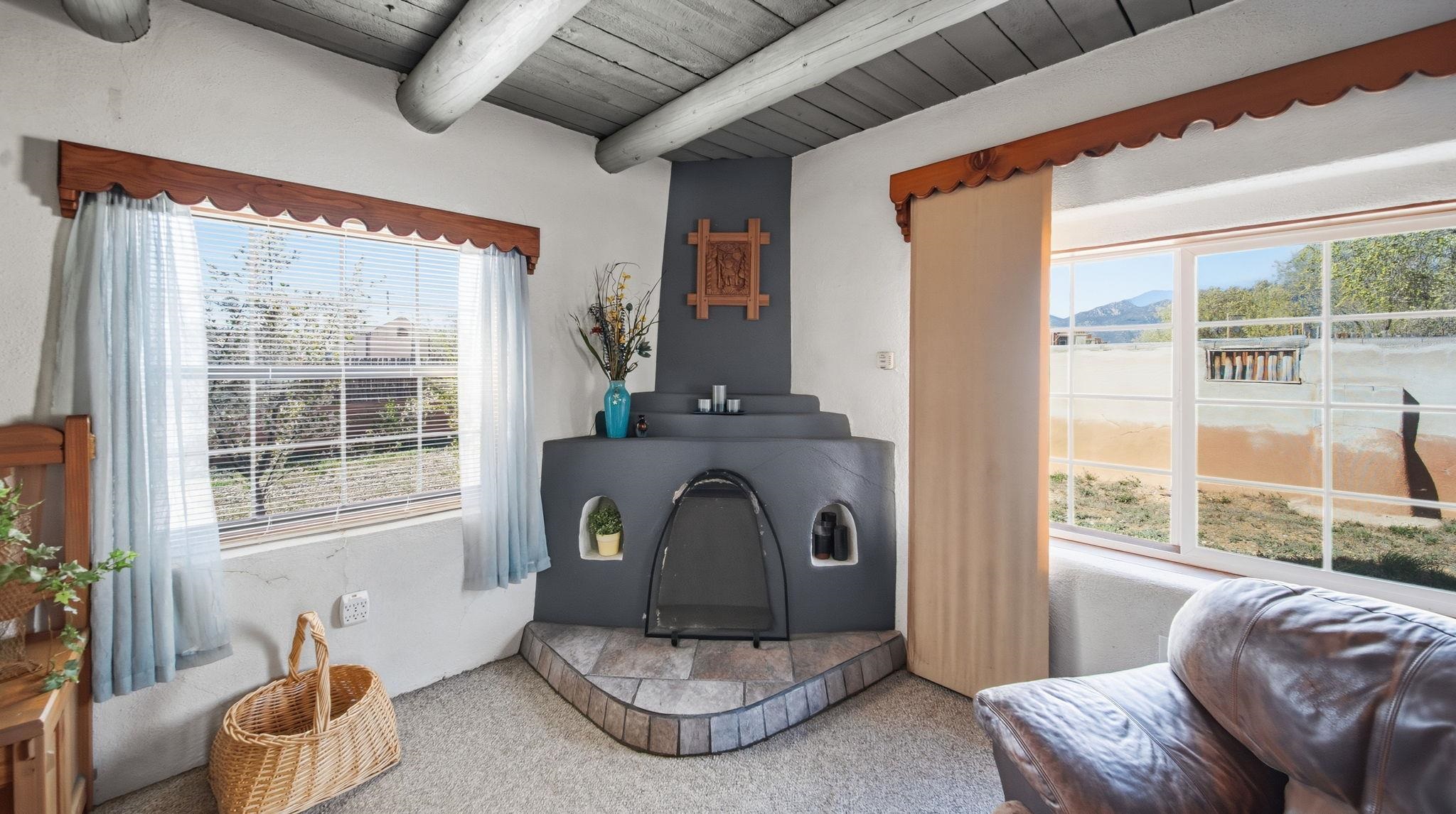 Hand-Carved Adobe Fortress in the Heart of Taos ~ In the very heart of Taos, New Mexico, you will find a residence with a home that is a true piece of art. Inside, almost everything has been meticulously hand-carved by the artist-owner. Constructed with solid, thick adobe walls that act as a private, peaceful fortress, this home naturally stays cool during the warm summer months and wonderfully retains its heat through the winter. Upon entering the kitchen, you are greeted by awe-inspiring, Spanish-colonial inspired carved cabinets stretching from floor to ceiling around the center island, and a special theme that continues through the home, along with creative storage throughout. Traditional, tough hardwood floors flow seamlessly into the dining room, which features the first of two cozy kiva fireplaces under ceilings adorned with tasteful Taos turquoise vigas and planks. The inviting living room boasts the home's second fireplace, creating the ultimate gathering space for family year-round and especially during the holidays. Each of the 4 spacious bedrooms offers a comfortable retreat, but the enormous primary suite is a true standout, with a convenient in-room laundry with willow-etched doors, big closets, and direct egress to the yard. Throughout the home, you will discover custom hand-carved doors and special touches like clever hidden bathroom vanity doors and gorgeous handmade built-in cabinets beside a classic clawfoot tub. Outside, the yard invites you to relax among budding fruit trees and charming walking paths, all centered around a traditional horno for authentic outdoor baking. Conveniently located off Gusdorf Road near the historic Taos Plaza, the unbeatable proximity makes this an ideal residence if you work in town, and it is especially perfect for teachers at one of the excellent nearby schools. Whether you are looking for a highly accessible part-time Land of Enchantment getaway or the perfect starter home ready for you to add your own finishing exterior touches, this adobe gem places you minutes from world-class skiing at Taos Ski Valley, vibrant local art galleries, and breathtaking Rio Grande river adventures. This home is priced well, and ready for you to make it your very own!