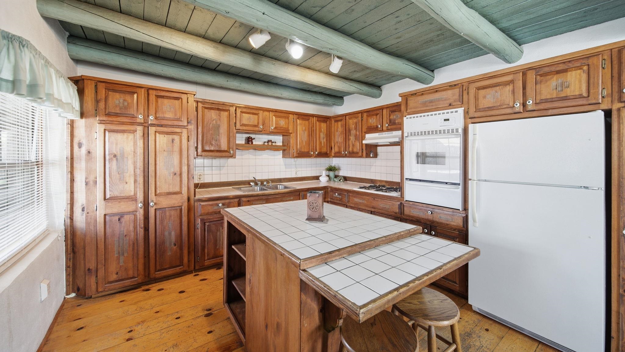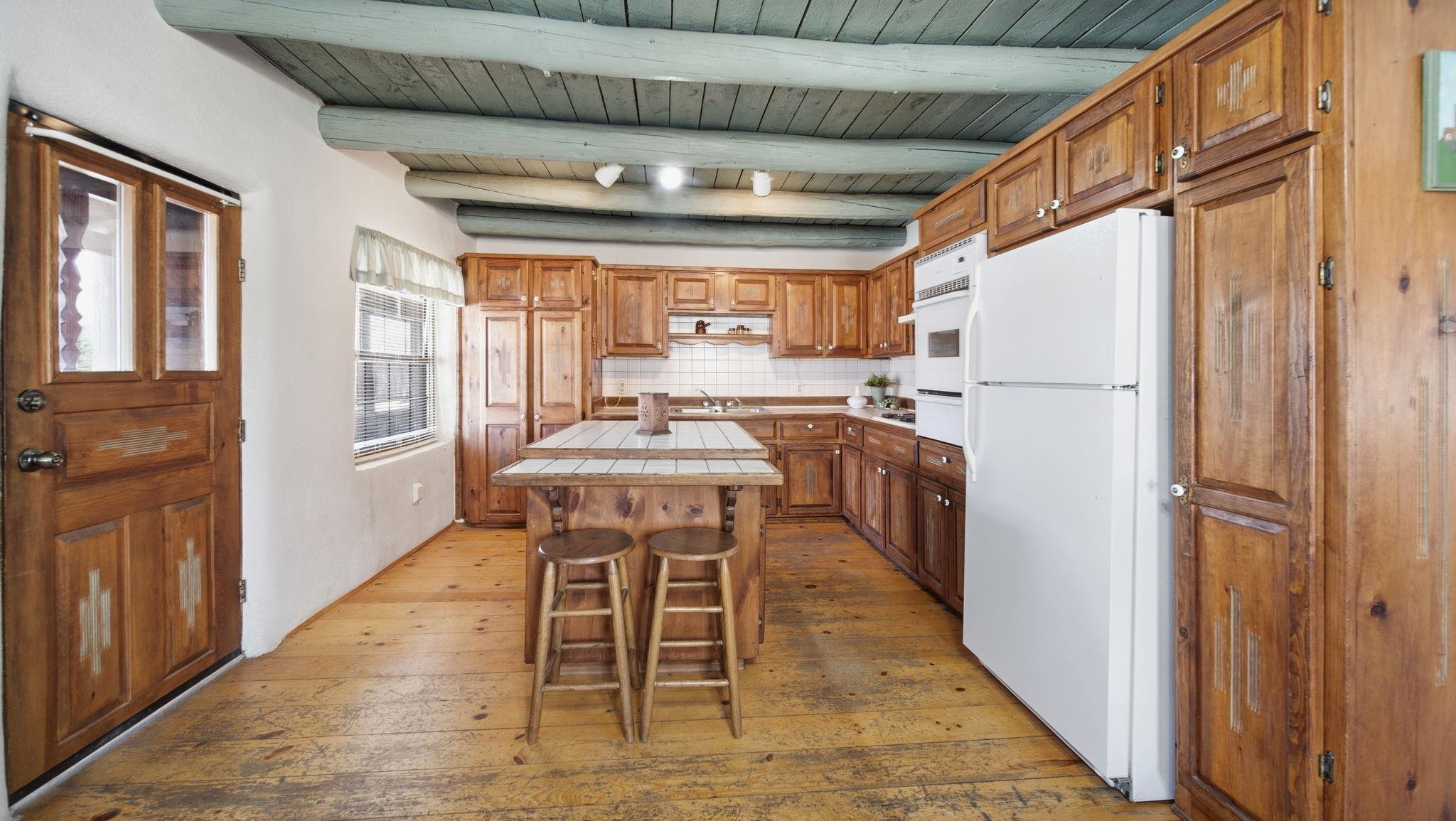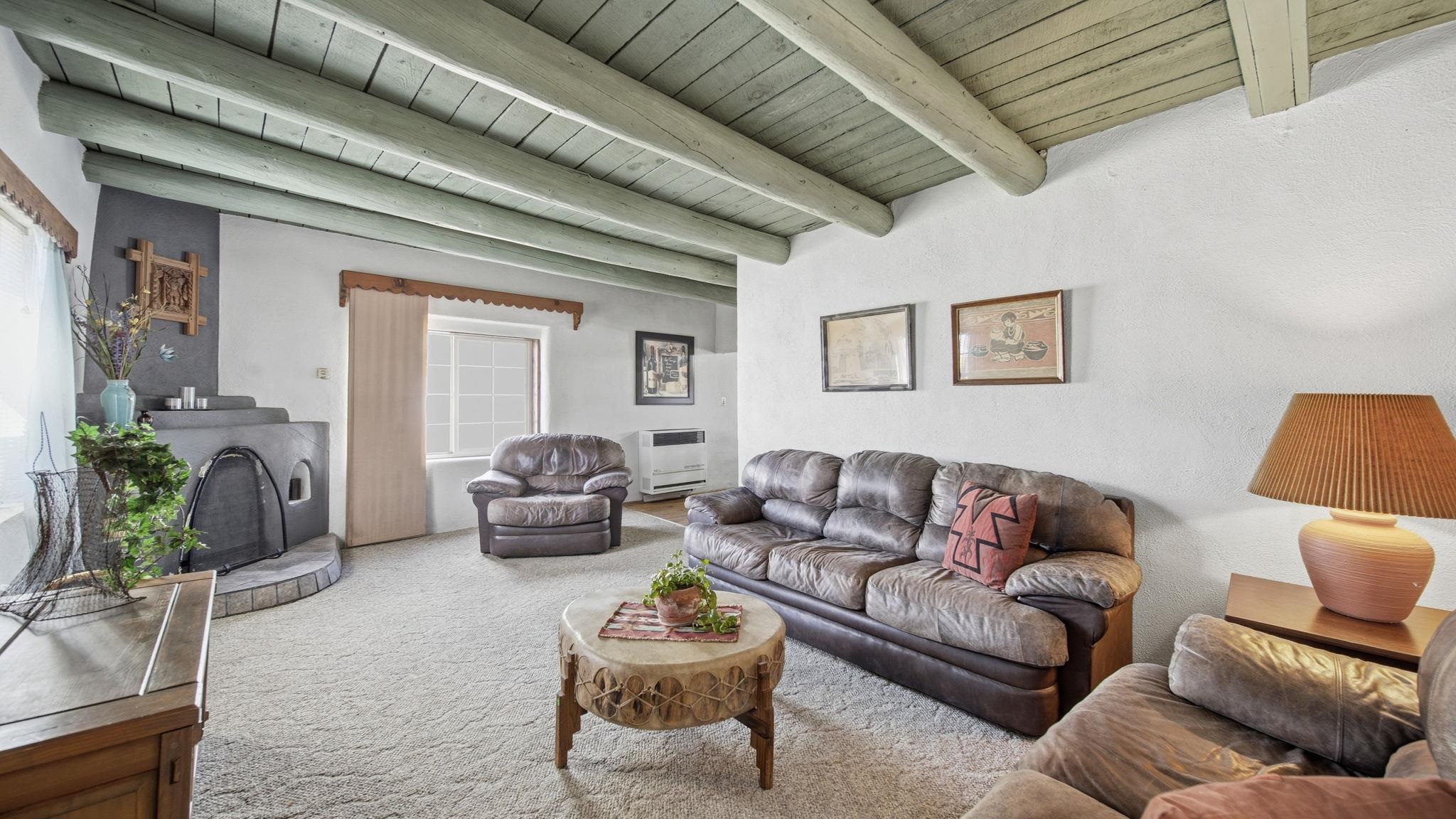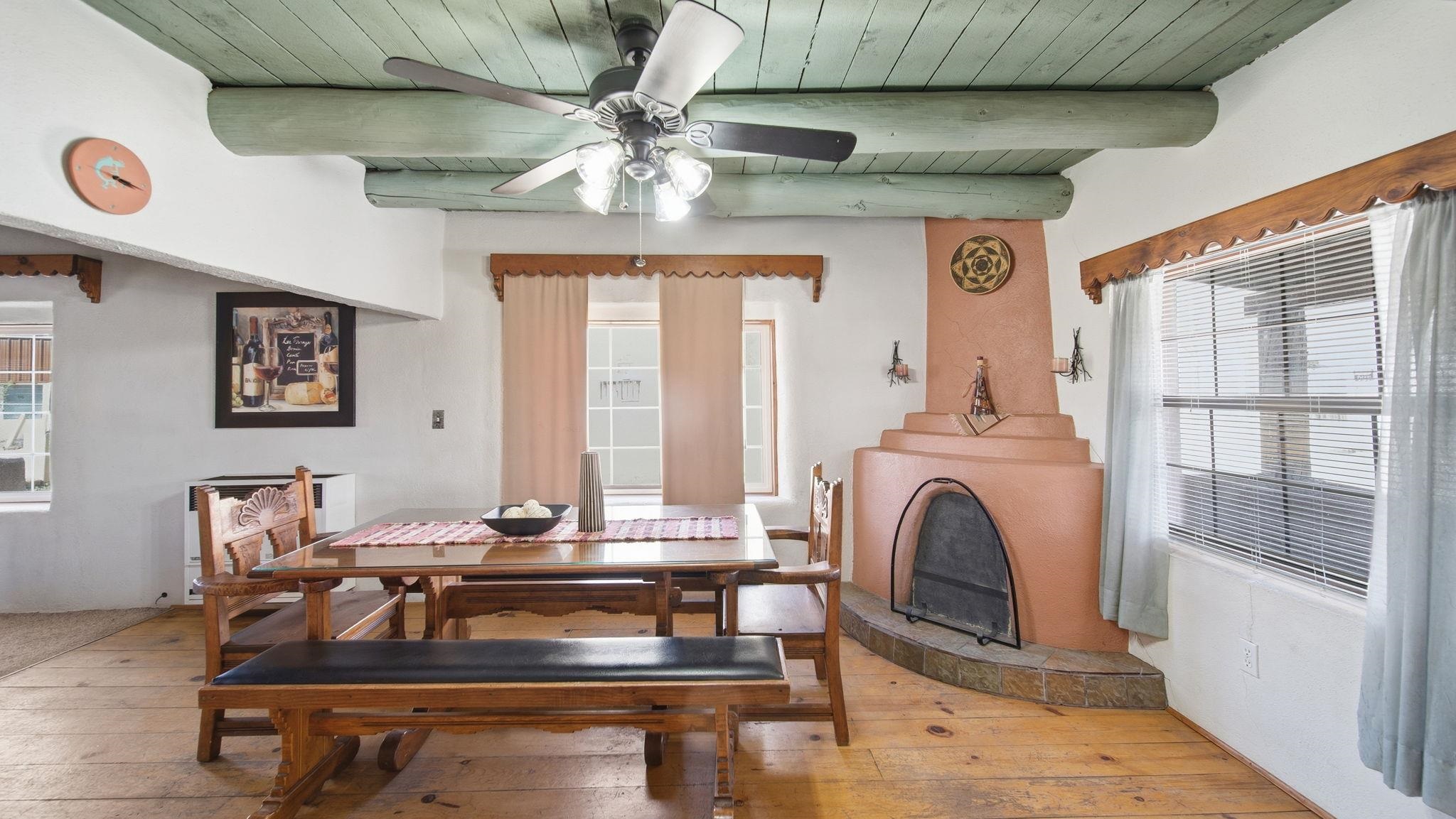 Hand-Carved Adobe Fortress in the Heart of Taos ~ In the very heart of Taos, New Mexico, you will find a residence with a home that is a true piece of art. Inside, almost everything has been meticulously hand-carved by the artist-owner. Constructed with solid, thick adobe walls that act as a private, peaceful fortress, this home naturally stays cool during the warm summer months and wonderfully retains its heat through the winter. Upon entering the kitchen, you are greeted by awe-inspiring, Spanish-colonial inspired carved cabinets stretching from floor to ceiling around the center island, and a special theme that continues through the home, along with creative storage throughout. Traditional, tough hardwood floors flow seamlessly into the dining room, which features the first of two cozy kiva fireplaces under ceilings adorned with tasteful Taos turquoise vigas and planks. The inviting living room boasts the home's second fireplace, creating the ultimate gathering space for family year-round and especially during the holidays. Each of the 4 spacious bedrooms offers a comfortable retreat, but the enormous primary suite is a true standout, with a convenient in-room laundry with willow-etched doors, big closets, and direct egress to the yard. Throughout the home, you will discover custom hand-carved doors and special touches like clever hidden bathroom vanity doors and gorgeous handmade built-in cabinets beside a classic clawfoot tub. Outside, the yard invites you to relax among budding fruit trees and charming walking paths, all centered around a traditional horno for authentic outdoor baking. Conveniently located off Gusdorf Road near the historic Taos Plaza, the unbeatable proximity makes this an ideal residence if you work in town, and it is especially perfect for teachers at one of the excellent nearby schools. Whether you are looking for a highly accessible part-time Land of Enchantment getaway or the perfect starter home ready for you to add your own finishing exterior touches, this adobe gem places you minutes from world-class skiing at Taos Ski Valley, vibrant local art galleries, and breathtaking Rio Grande river adventures. This home is priced well, and ready for you to make it your very own!