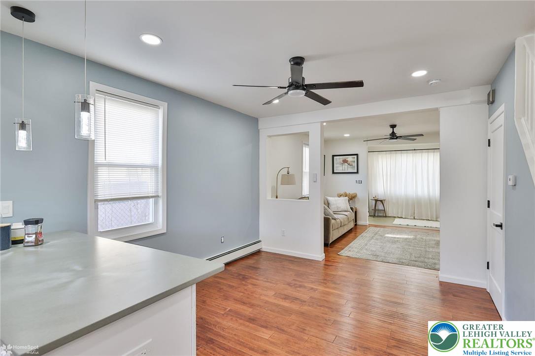 Beautifully updated and immaculate Slatington twin offering the perfect blend of comfort, modern style, and functionality. Step into a versatile flex space ideal for a home office or den, leading into a cozy living room featuring a stunning built-in modern electric fireplace. The flow continues to the dining room and into a gorgeous kitchen boasting stainless steel appliances, quartz countertops, and a peninsula breakfast bar perfect for casual meals. The second floor features two bedrooms and a full bath enhanced with floor radiant hear for ultimate comfort. A third bedroom occupies the finished third floor, offering flexibility for guest or additional living space. Downstairs, a full basement includes laundry and convenient outside access. Enjoy economical gas hot water heat throughout the home. Step outside to your two-level deck, perfect for entertaining or relaxing, overlooking a flat, fenced backyard. A large one-car detached garage provides excellent storage and workspace. Move-in ready and beautifully maintained--this home combines classic charm with thoughtful updates, creating a truly inviting place to call home.