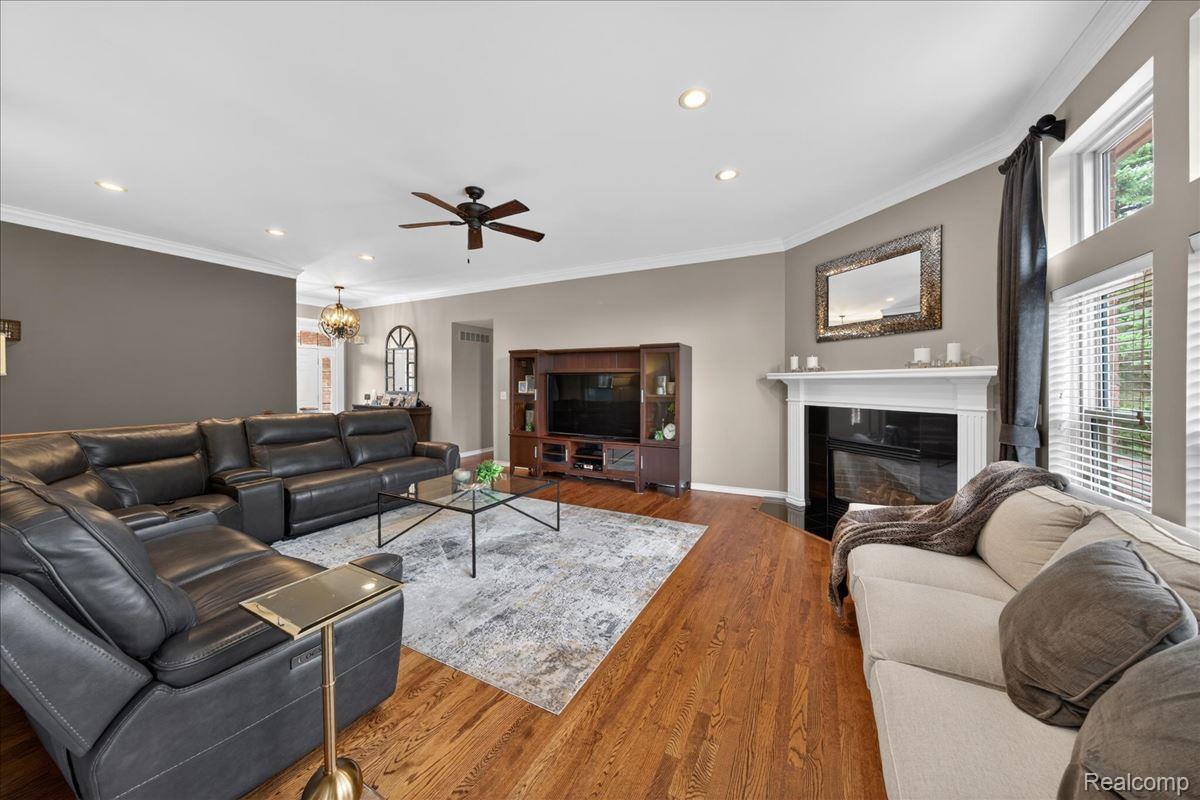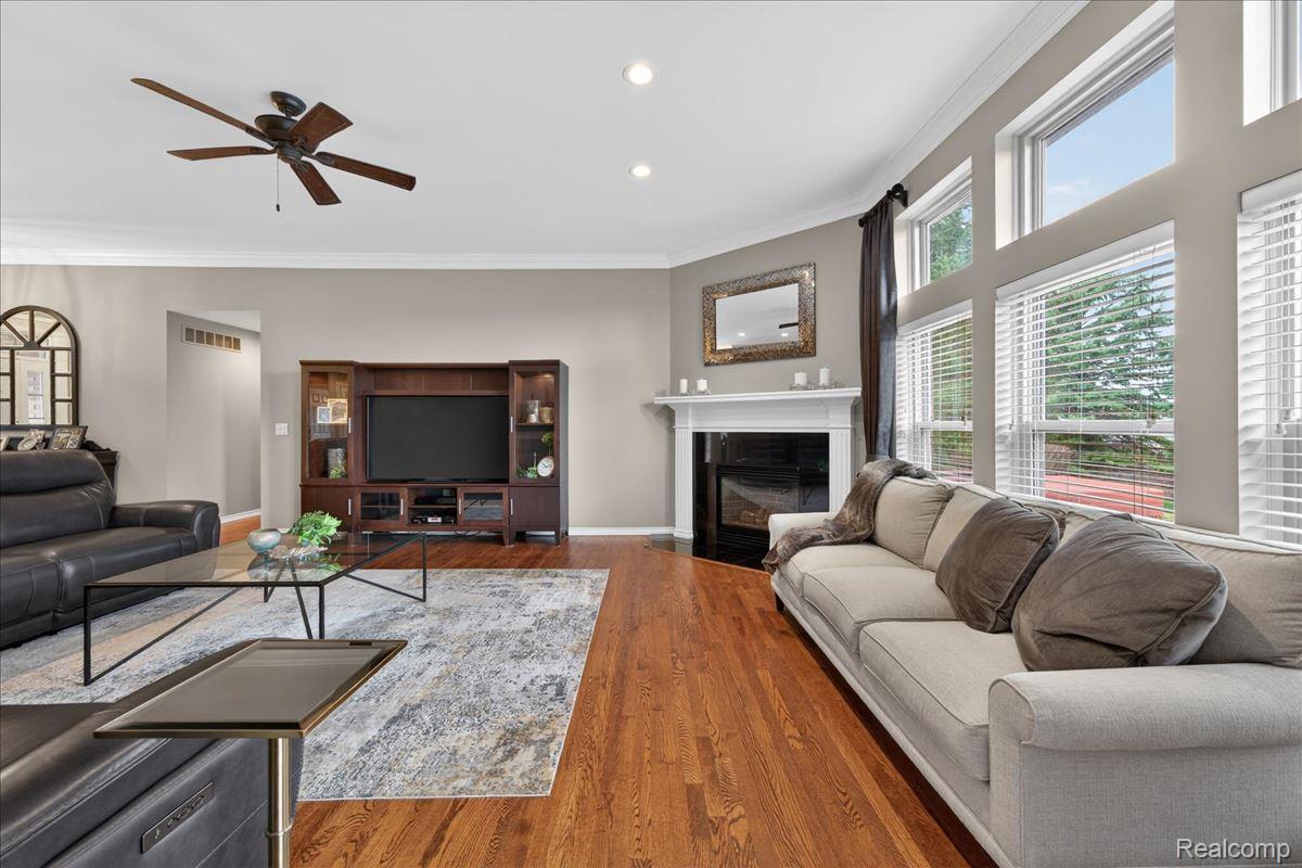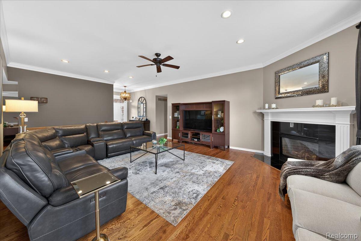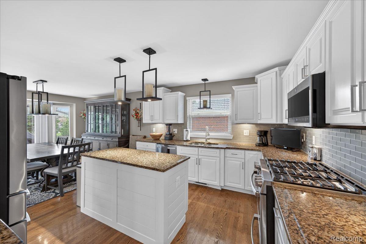 Welcome to this stunning 4-bedroom, 3.5-bath brick ranch nestled within the highly sought-after River Pointe Estates gated community in Clinton Township, Michigan. This beautifully updated home offers a perfect blend of elegance, comfort, and modern convenience. Step inside to discover rich hardwood flooring and a fully updated white kitchen featuring granite countertops, a stylish tile backsplash, center island, stainless steel appliances, and a gas stove - ideal for both everyday living and entertaining. The spacious great room is highlighted by a custom gas fireplace and complemented by fresh interior paint and updated lighting throughout. All bathrooms have been tastefully renovated, including the primary suite, which showcases a designer vanity with granite finishes. A convenient half bath is located just off the kitchen. Recent exterior upgrades include a new roof and gutters (2022), Anderson windows, and a beautifully stamped concrete patio and walkway. Enjoy outdoor living in the professionally landscaped yard, complete with a hot tub and sprinkler system. The 3-car garage is a standout feature with epoxy floors, insulated doors, new paint, built-in storage, and cabinetry. The finished lower level offers exceptional additional living space, including a custom bar with ice maker, recreation room, bedroom, full bath, and integrated sound system - perfect for entertaining or extended stays. Additional updates include a new sump pump with water backup system and new glass block windows for added peace of mind. Proudly owned by the original owner, this home reflects true pride of ownership throughout. Located within the award-winning Chippewa Valley School District and close to shopping, dining, and everyday conveniences - this home truly earns a perfect 10!