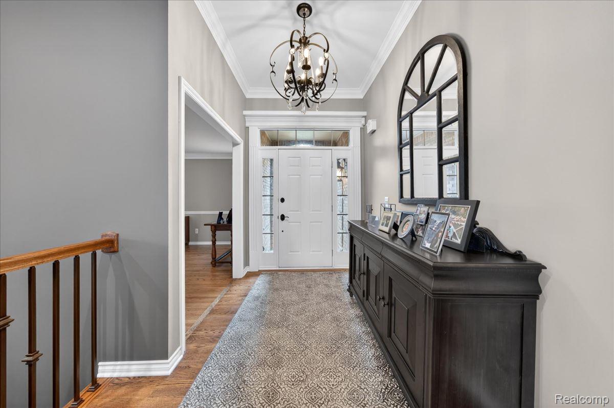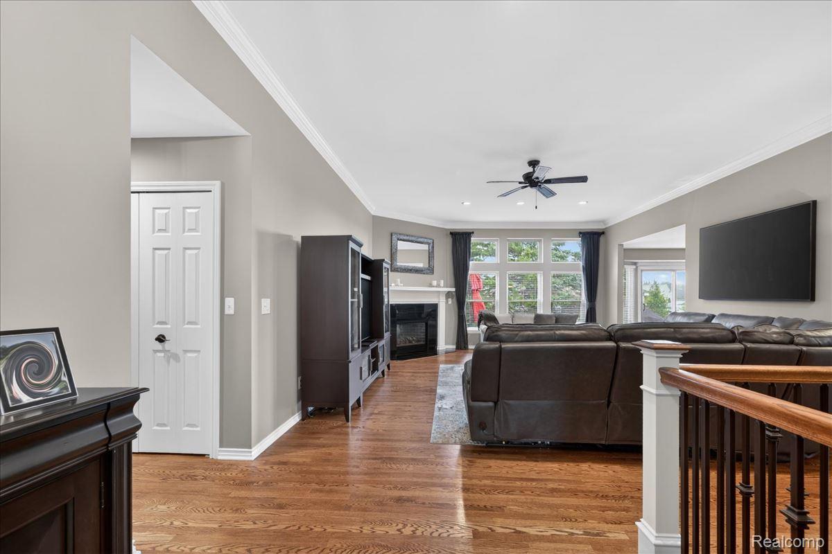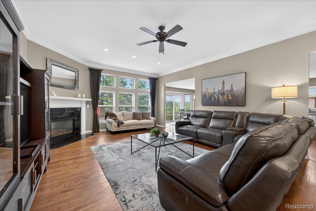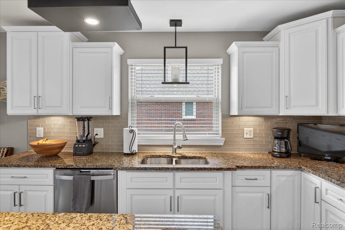 Welcome to this stunning 4-bedroom, 3.5-bath brick ranch nestled within the highly sought-after River Pointe Estates gated community in Clinton Township, Michigan. This beautifully updated home offers a perfect blend of elegance, comfort, and modern convenience. Step inside to discover rich hardwood flooring and a fully updated white kitchen featuring granite countertops, a stylish tile backsplash, center island, stainless steel appliances, and a gas stove - ideal for both everyday living and entertaining. The spacious great room is highlighted by a custom gas fireplace and complemented by fresh interior paint and updated lighting throughout. All bathrooms have been tastefully renovated, including the primary suite, which showcases a designer vanity with granite finishes. A convenient half bath is located just off the kitchen. Recent exterior upgrades include a new roof and gutters (2022), Anderson windows, and a beautifully stamped concrete patio and walkway. Enjoy outdoor living in the professionally landscaped yard, complete with a hot tub and sprinkler system. The 3-car garage is a standout feature with epoxy floors, insulated doors, new paint, built-in storage, and cabinetry. The finished lower level offers exceptional additional living space, including a custom bar with ice maker, recreation room, bedroom, full bath, and integrated sound system - perfect for entertaining or extended stays. Additional updates include a new sump pump with water backup system and new glass block windows for added peace of mind. Proudly owned by the original owner, this home reflects true pride of ownership throughout. Located within the award-winning Chippewa Valley School District and close to shopping, dining, and everyday conveniences - this home truly earns a perfect 10!