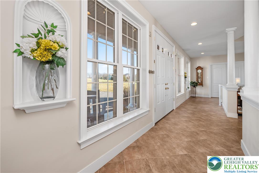 Experience REFINED COUNTRY LIVING in this one-of-a-kind sprawling ranch, perfectly positioned on a 3.22-acre lot. This CUSTOM BUILT HOME captures the essence of tranquility, offering a front-row seat to the beauty of nature with serene, PANORAMIC VIEWS of a neighboring HORSE FARM. From the moment you arrive, the DOUBLE-DOOR ENTRY sets the stage for a home defined by elegance and meticulous detail. The interior features a total OPEN CONCEPT LAYOUT, anchored by stunning Brazilian Cherry HARDWOOD FLOORS paired with ceramic tile that flows beautifully throughout the main living areas. The spacious Great Room boasts soaring cathedral ceilings, elegant architectural pillars, and a cozy fireplace designed for large-scale entertaining. Elevate your lifestyle with a fully integrated, whole-home SONOS SOUND SYSTEM, offering seamless audio perfection in every room. Flooded with natural light, every room is strategically designed to invite the views of the rolling mountains and valley inside. The stylish kitchen features premium GRANITE COUNTERTOPS and high-end finishes. Storage is unparalleled with a massive walk-in pantry that even houses an extra refrigerator for seamless hosting. Transition easily from the bright and airy Breakfast Room to the expansive TREX DECK where you can enjoy outdoor dining against a backdrop of pristine Pennsylvania countryside. The PRIMARY SUITE serves as a true PRIVATE RETREAT, offering generous dimensions and direct deck access. Its SPA-LIKE BATH featuring a ROMAN WALK-IN SHOWER, a large jacuzzi tub, and custom ceramic tile work, is complemented by a spacious WALK-IN CLOSET & first level Washer and Dryer. The LARGE WALK-OUT FINISHED LOWER LEVEL provides incredible versatility, already featuring a bedroom and full bath. Beyond the spacious 2-car garage, a side storage shed handles all your larger equipment. Located in the desirable Northwestern Lehigh School District, this home offers the perfect balance of RURAL PRIVACY and MODERN LUXURY. Enjoy the peace of the countryside while being minutes from LOCAL FAVORITE WINERIES and major commuting routes. A rare opportunity to own a custom home where luxury meets a breathtaking landscape.