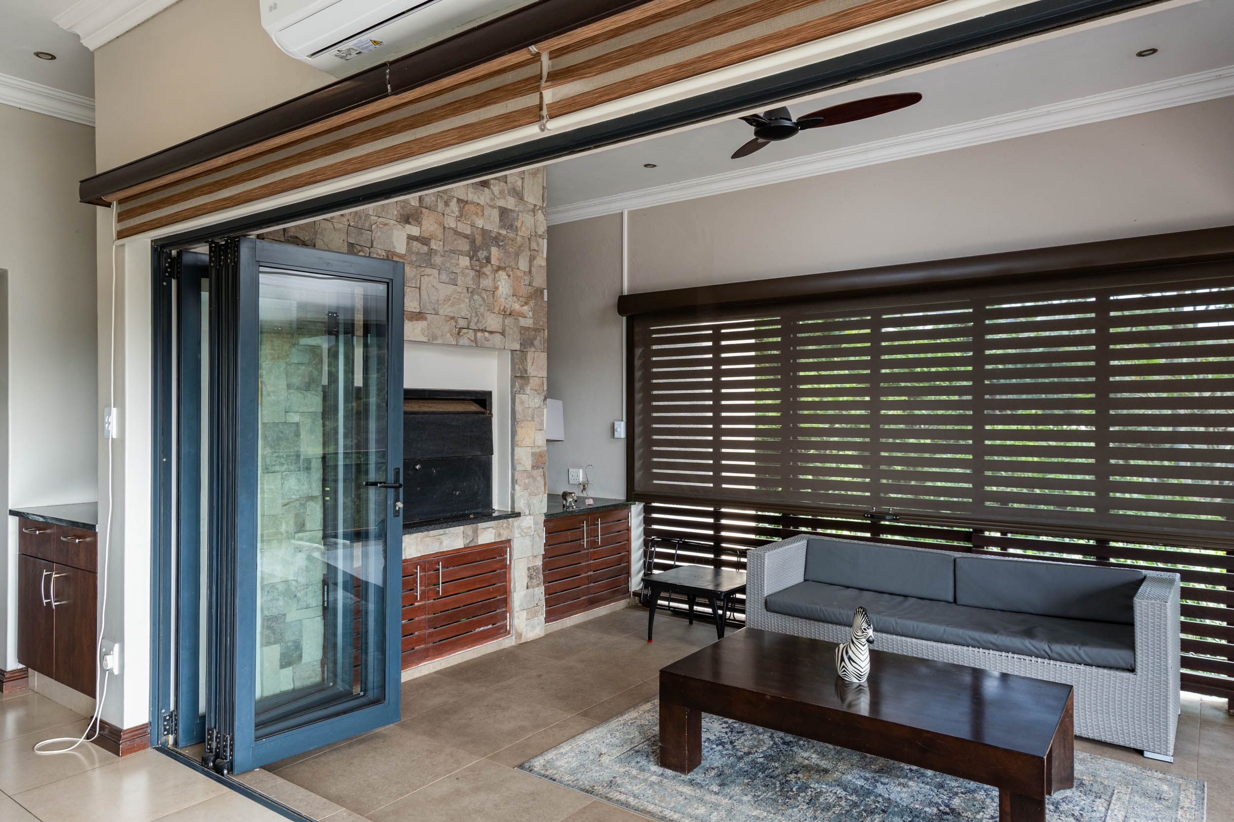 Designed for seamless indoor-outdoor living, the home features expansive open-plan interiors with elevated ceilings, integrating the kitchen, dining, and main living areas. These flow effortlessly onto a covered entertainment terrace complete with a built-in braai and weather-protected balcony—ideal for year-round entertaining.