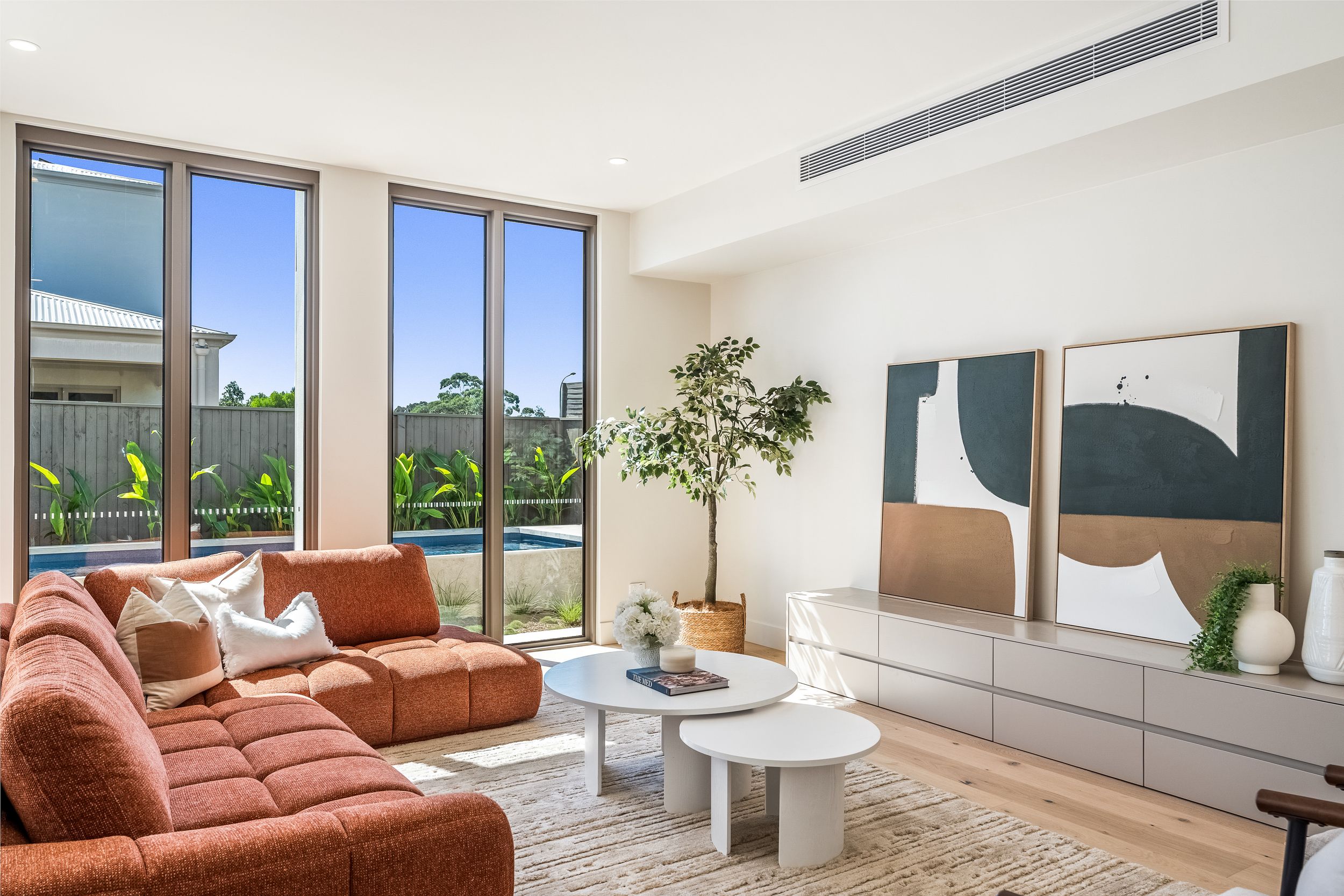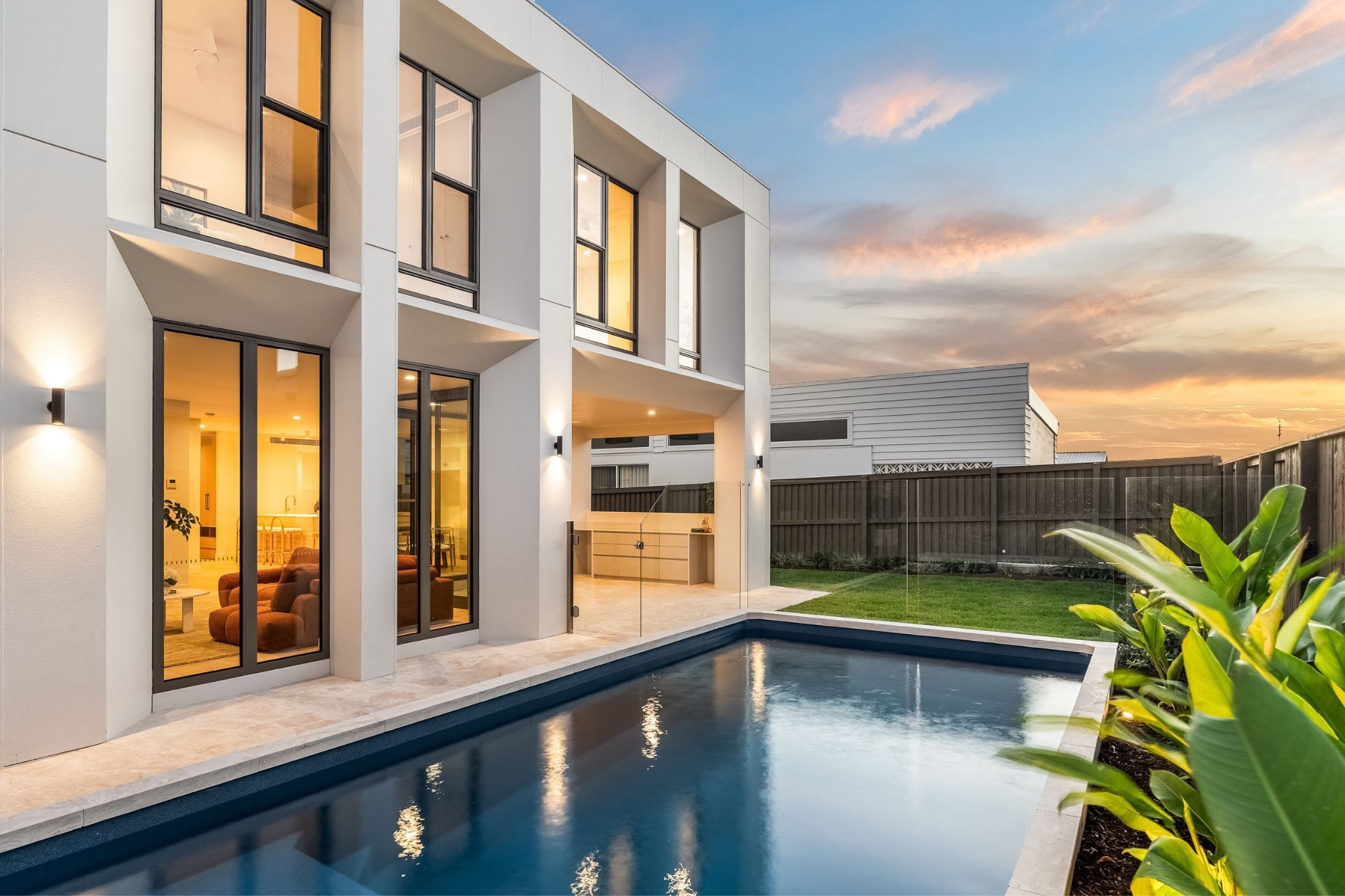 A striking statement in contemporary design, 9 Blue Water Place sets a new benchmark for luxury living within Byron Bay's coveted Harvest estate. Showcasing bespoke architecture with interiors by acclaimed designer Brahman Perera, the home is defined by an exquisite natural travertine façade, sculptural detailing and custom crazy paving that extends from the driveway through to the alfresco and pool surrounds. From the statement pivot entry door with fluted glass to the free-standing travertine mailbox, every element has been meticulously curated to deliver a refined, resort-inspired aesthetic of enduring quality.