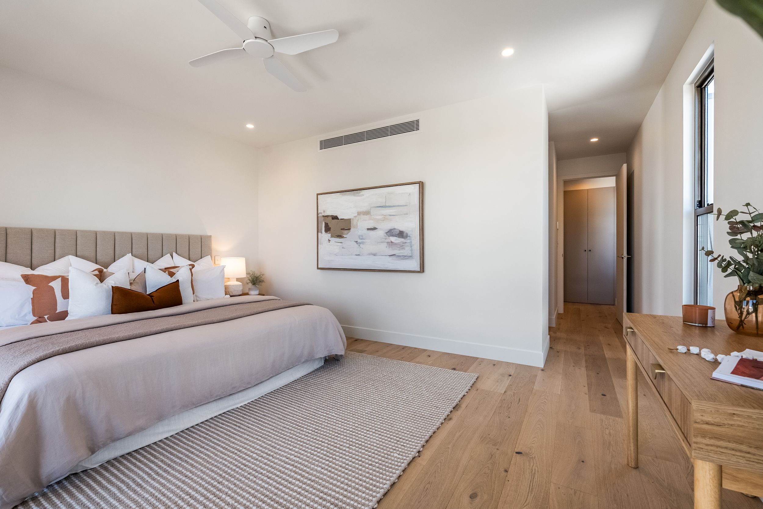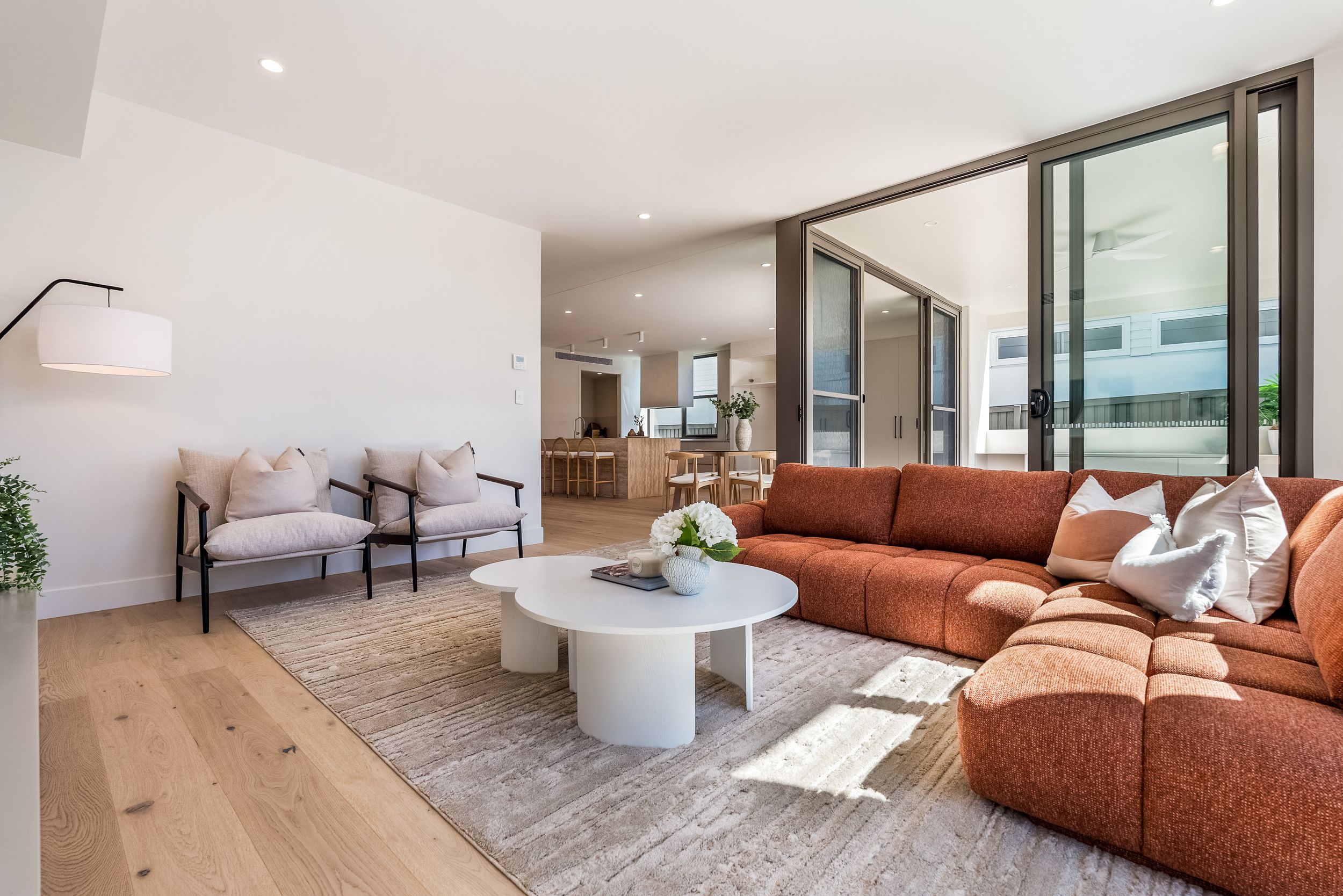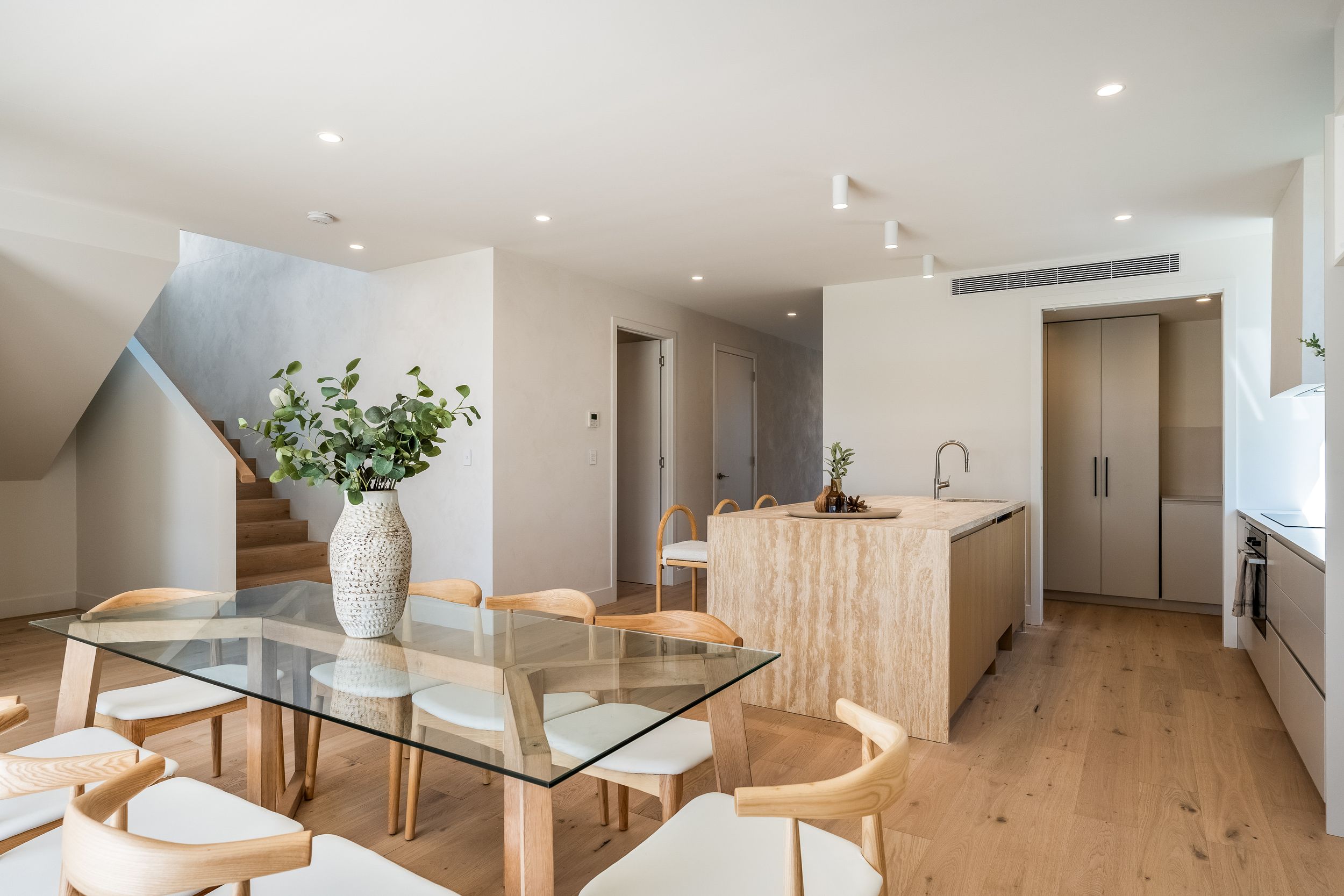 - Statement pivot entry door with fluted glass, high ceilings and full-height doors throughout
