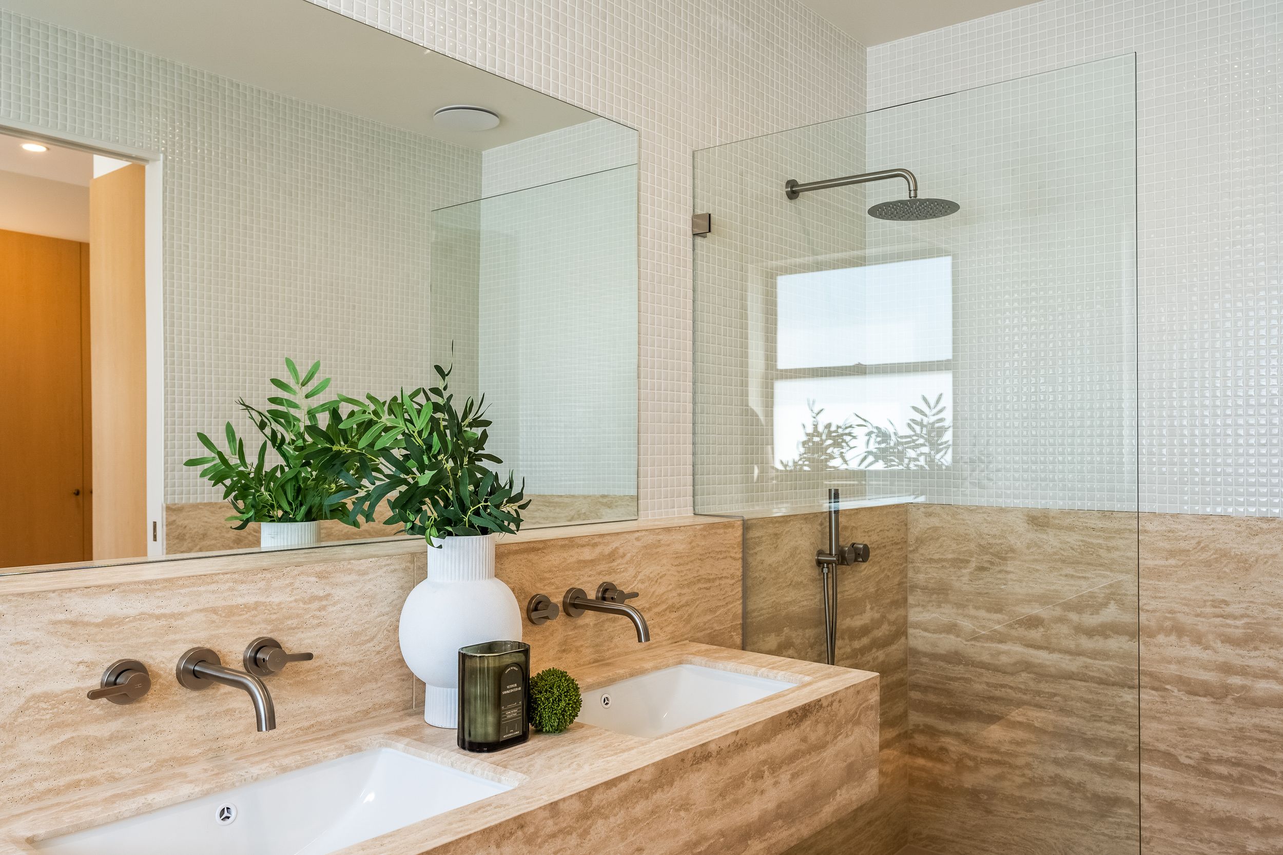 - Four designer bathrooms plus powder room, all with full-height travertine and mosaic finishes