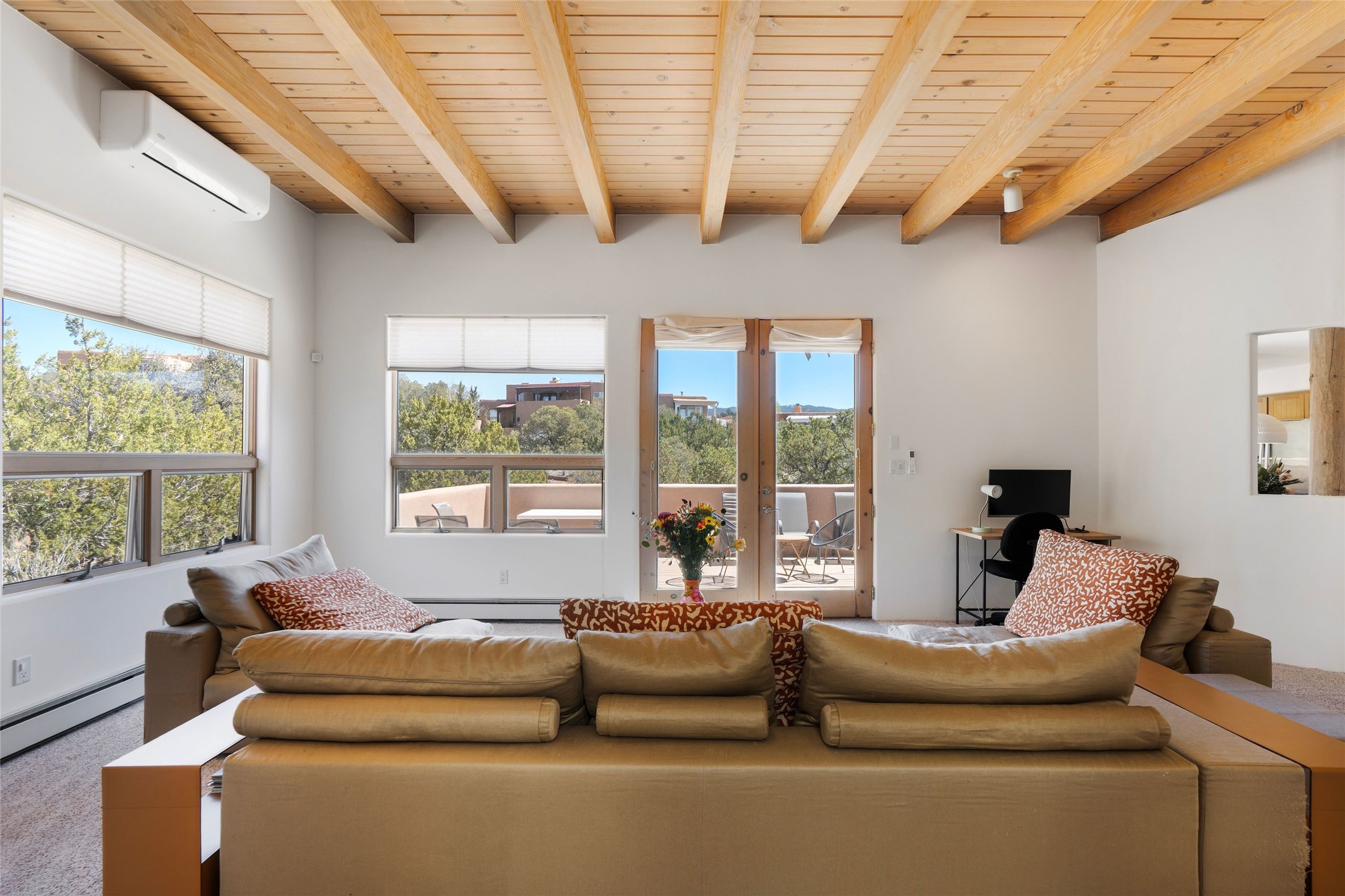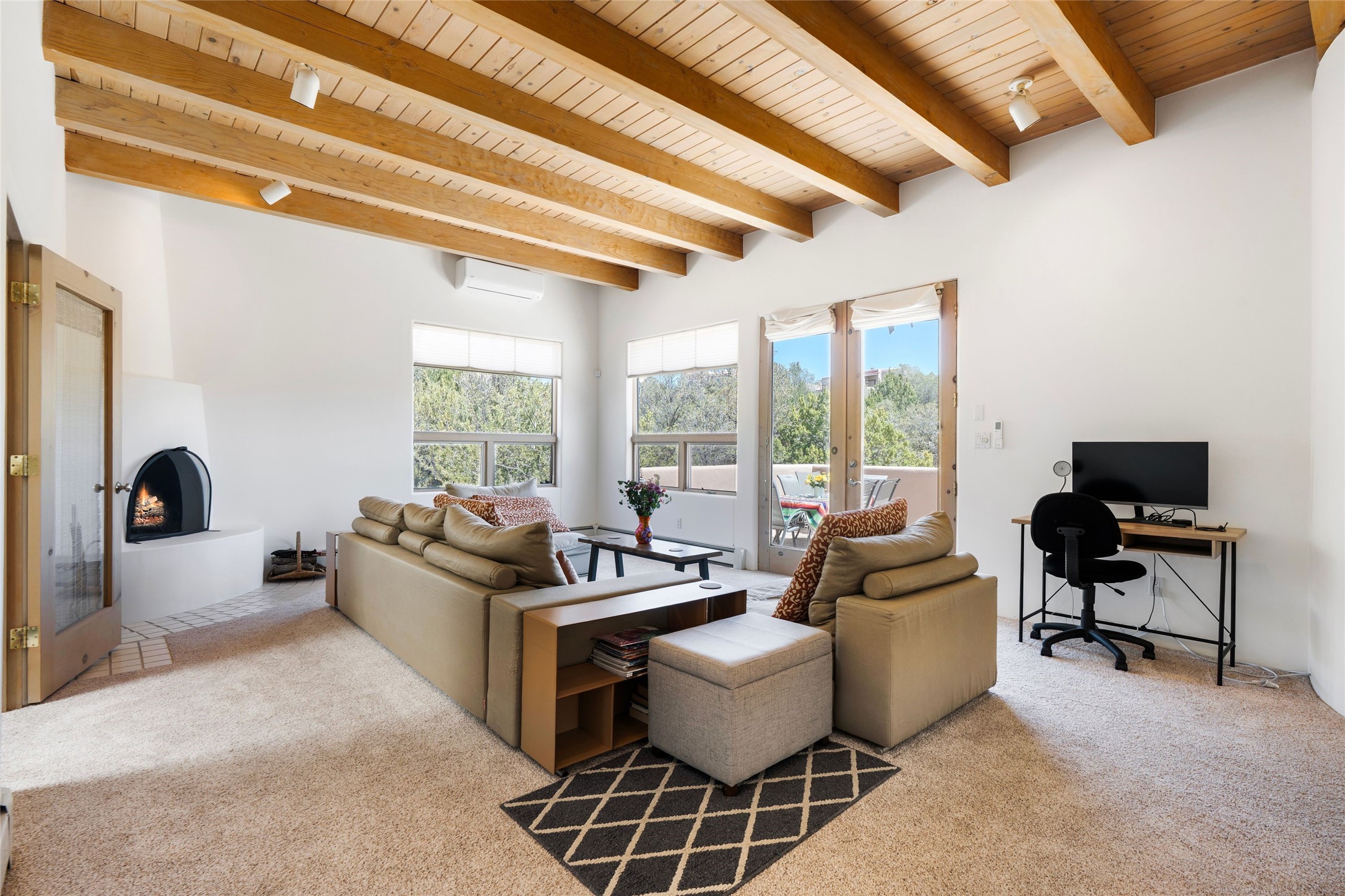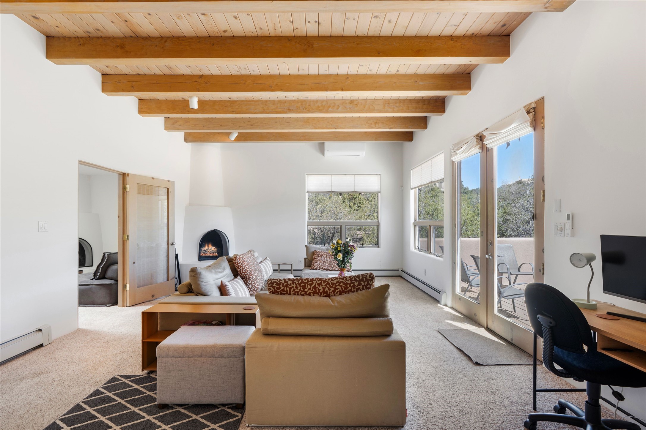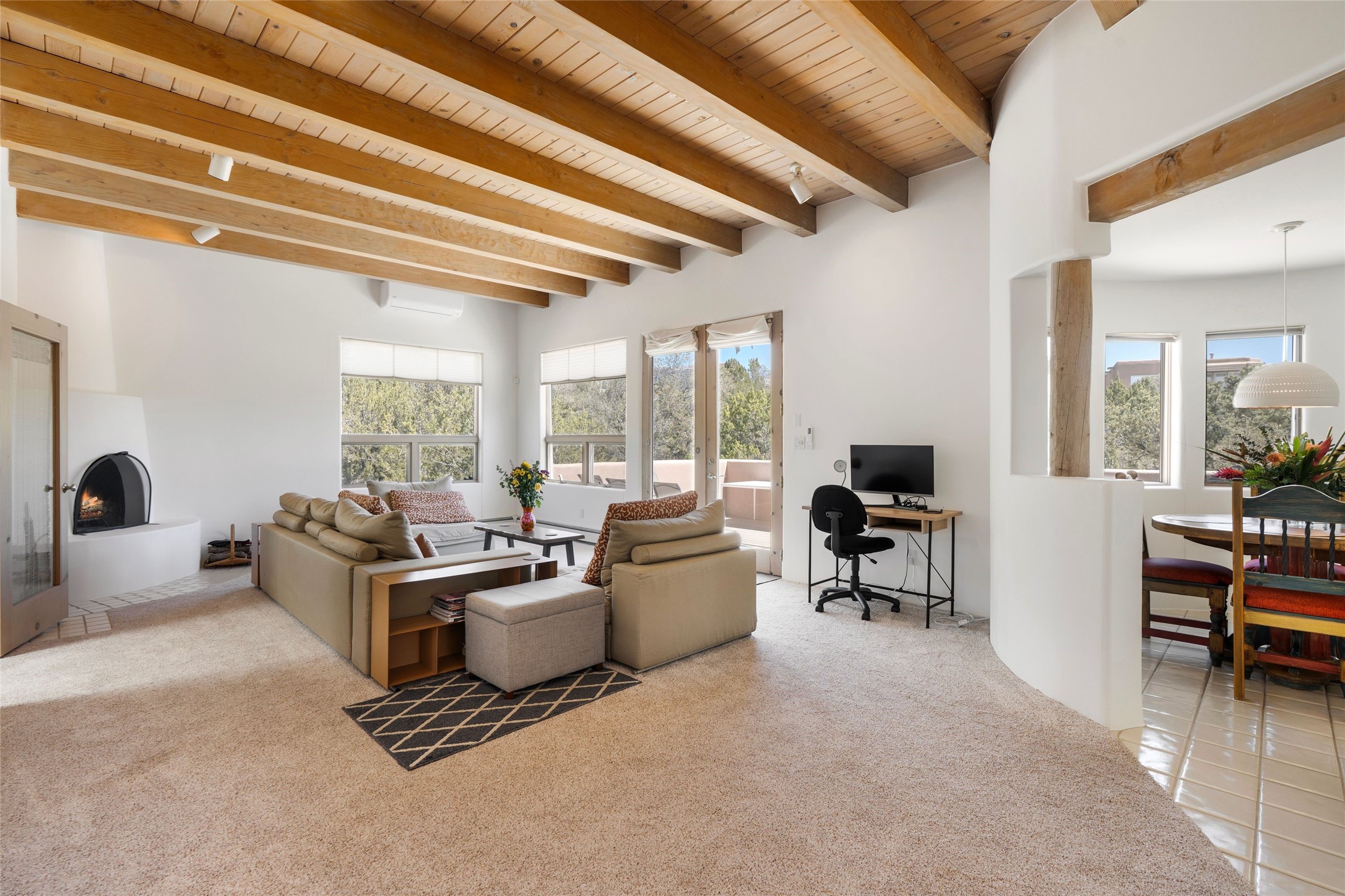 Just moments from the historic Santa Fe Plaza and a short stroll to the new Fort Marcy pickleball courts, this warm and light-filled residence blends classic Santa Fe character with modern comfort. High ceilings with exposed beams, abundant natural light, and two traditional kiva wood-burning fireplaces create an atmosphere that feels both timeless and welcoming. The home features 2 bedrooms, 2 baths, and an additional den—perfect as a home office, studio, or easily converted into a third bedroom. The spacious upper-level primary suite is a true retreat, complete with its own private deck overlooking Sun and Moon Mountain. Outdoor living is exceptional here, with two generous decks offering peaceful views of the surrounding hills and mountains. Whether you’re enjoying morning coffee or sunset skies, the setting is pure Santa Fe serenity. A rare 2-car garage, newly added air conditioning, and an on-demand hot water heater round out the home’s practical upgrades, making it as comfortable as it is charming. The furnishings are also available separately from the real property; making this a turnkey property. This is a special opportunity to live in one of Santa Fe’s most desirable walkable locations—close to culture, recreation, and the natural beauty that defines the City Different.