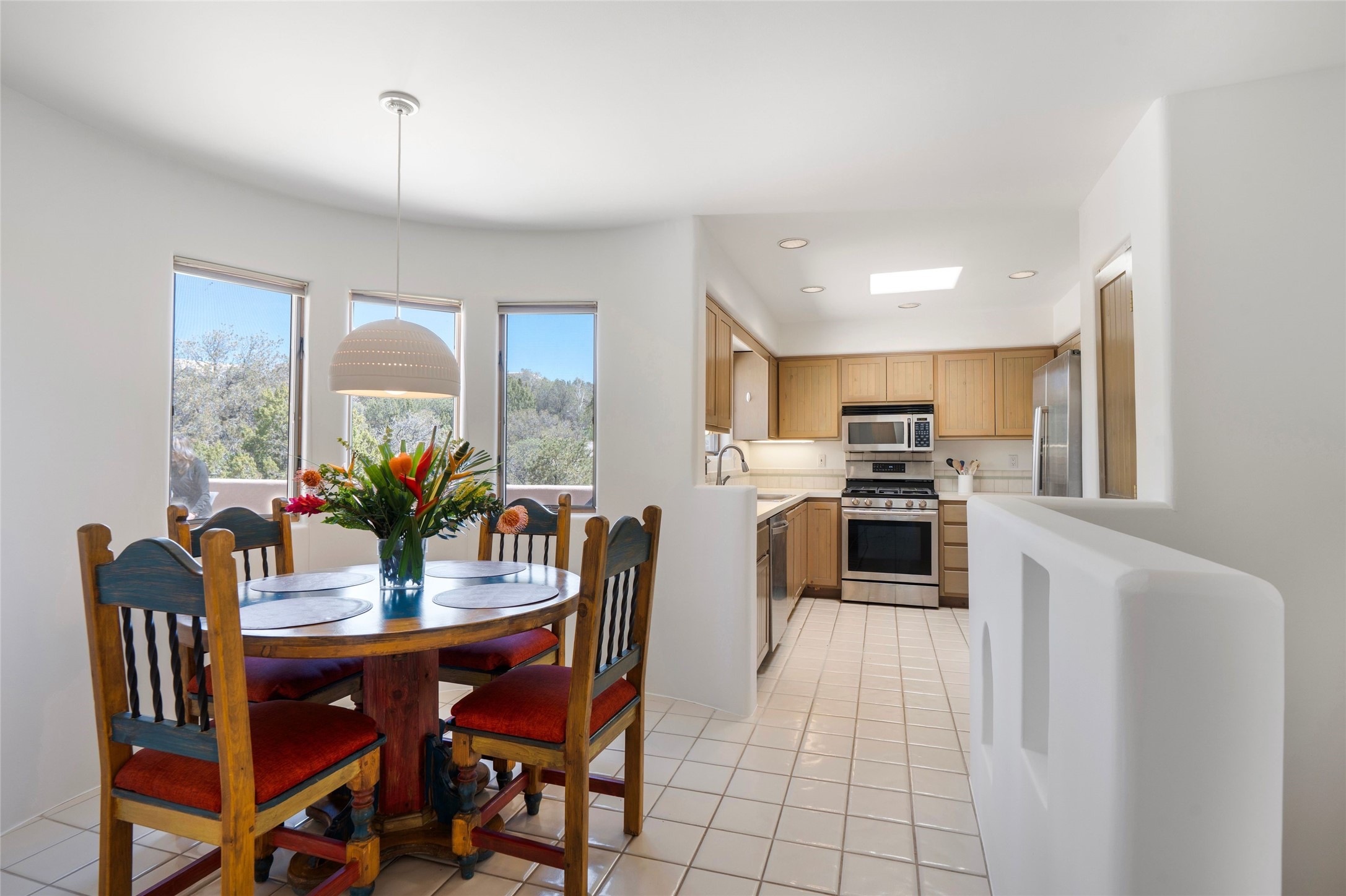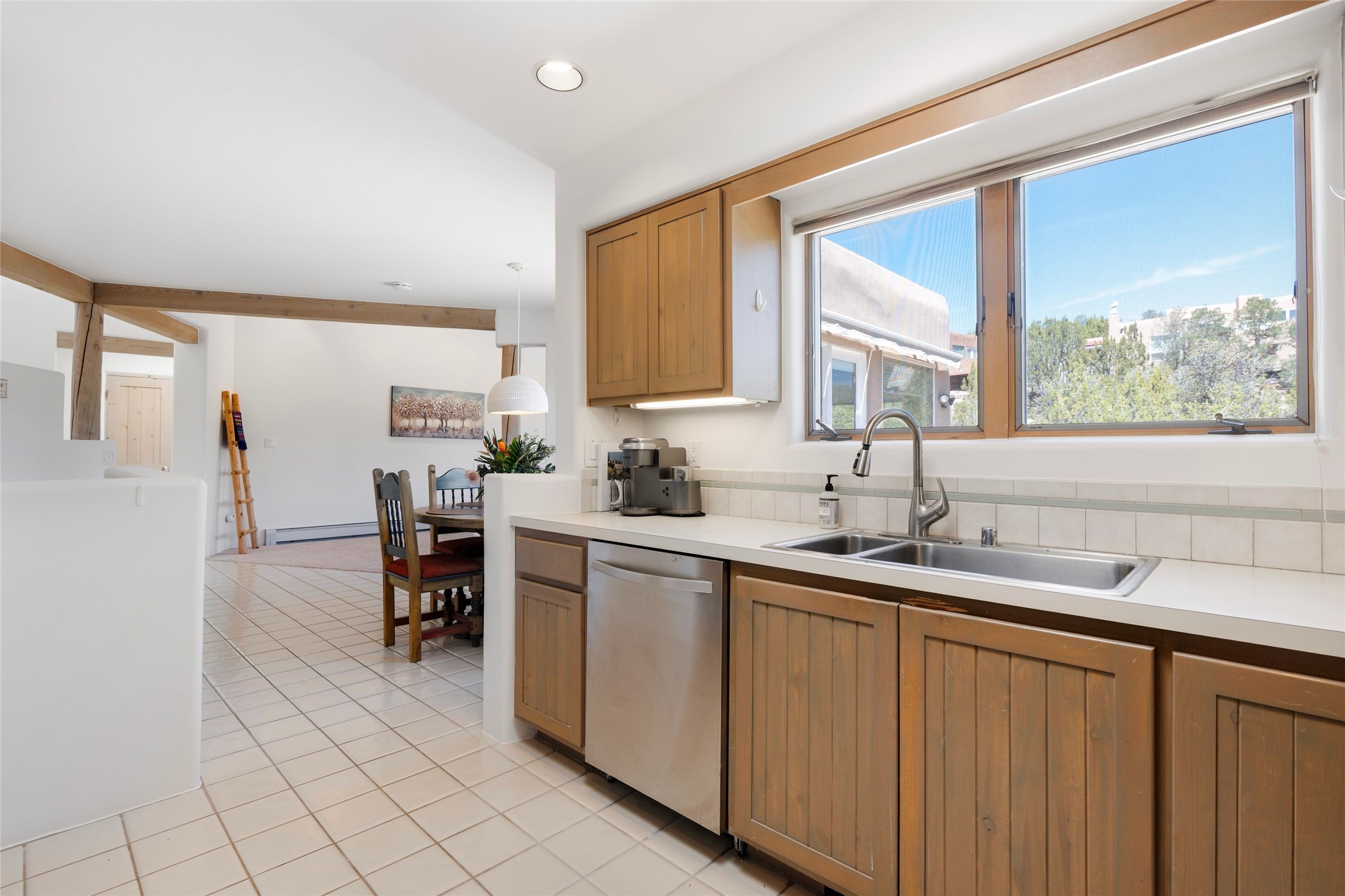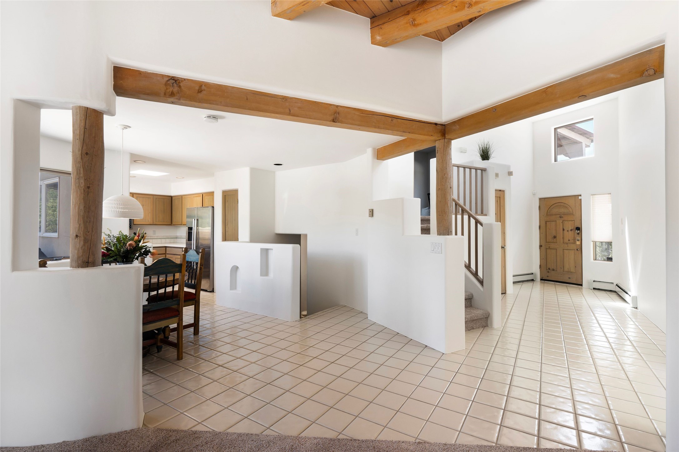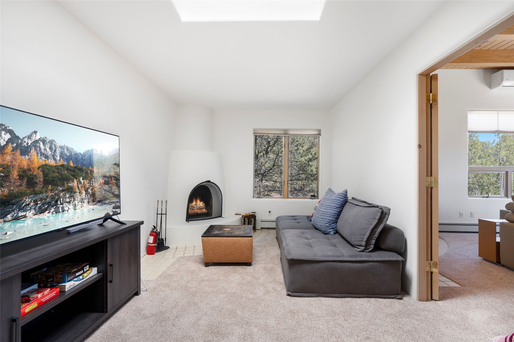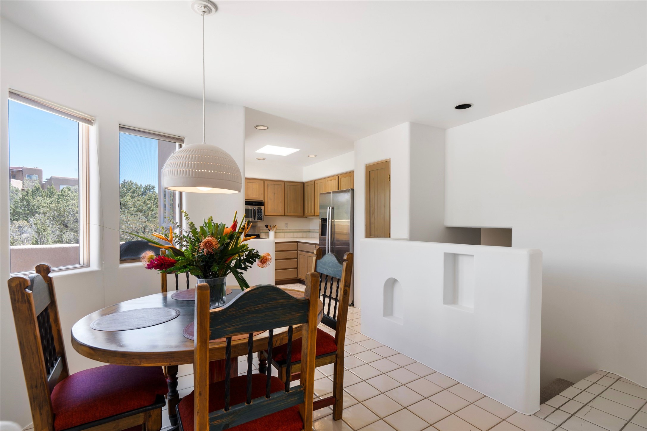Just moments from the historic Santa Fe Plaza and a short stroll to the new Fort Marcy pickleball courts, this warm and light-filled residence blends classic Santa Fe character with modern comfort. High ceilings with exposed beams, abundant natural light, and two traditional kiva wood-burning fireplaces create an atmosphere that feels both timeless and welcoming. The home features 2 bedrooms, 2 baths, and an additional den—perfect as a home office, studio, or easily converted into a third bedroom. The spacious upper-level primary suite is a true retreat, complete with its own private deck overlooking Sun and Moon Mountain. Outdoor living is exceptional here, with two generous decks offering peaceful views of the surrounding hills and mountains. Whether you’re enjoying morning coffee or sunset skies, the setting is pure Santa Fe serenity. A rare 2-car garage, newly added air conditioning, and an on-demand hot water heater round out the home’s practical upgrades, making it as comfortable as it is charming. The furnishings are also available separately from the real property; making this a turnkey property. This is a special opportunity to live in one of Santa Fe’s most desirable walkable locations—close to culture, recreation, and the natural beauty that defines the City Different.