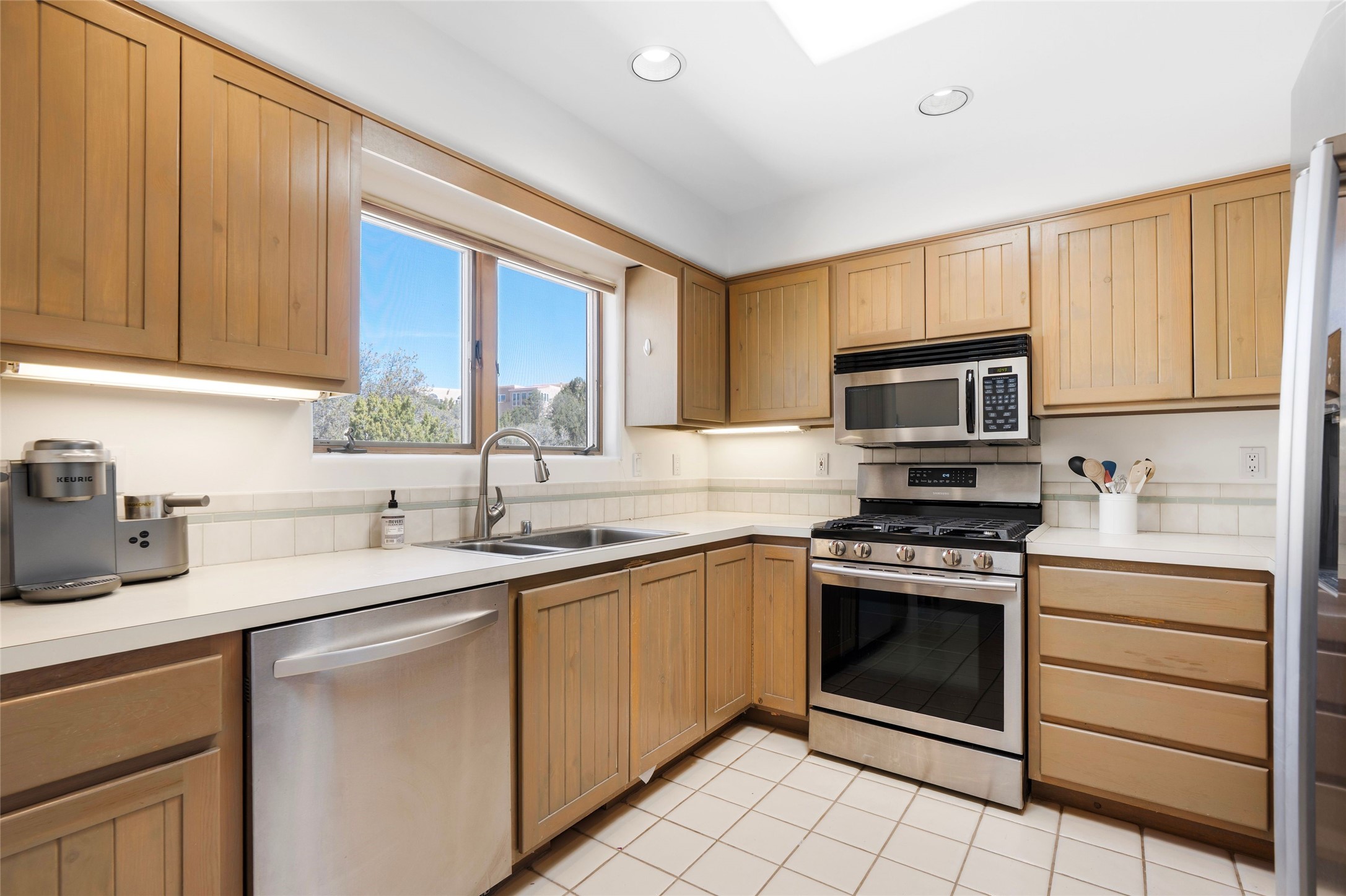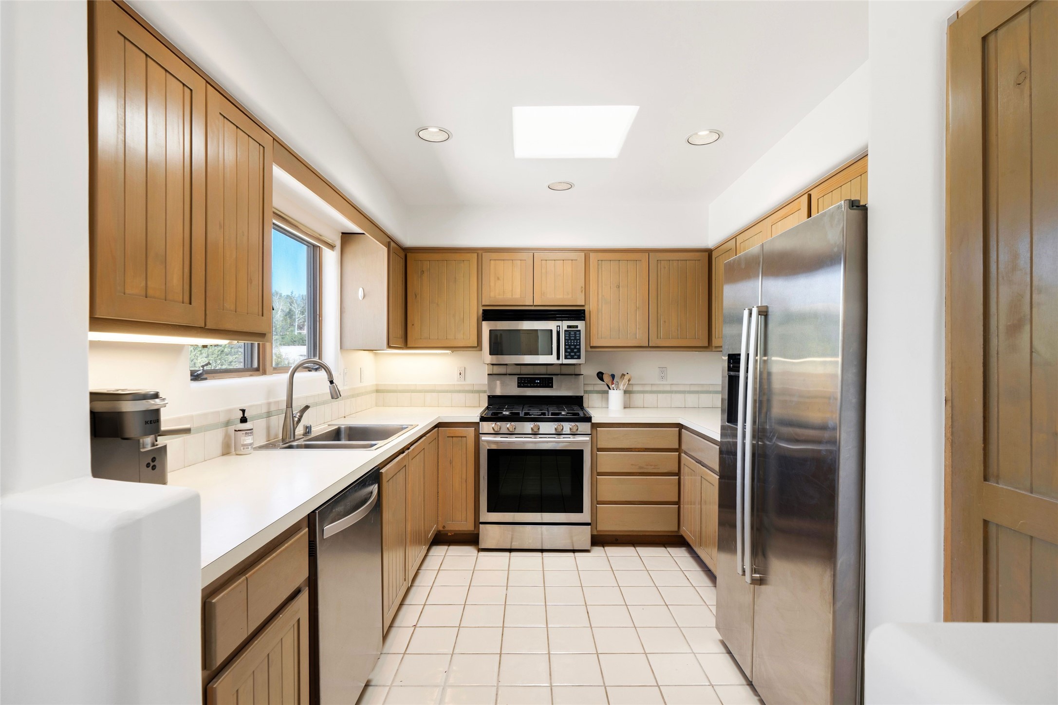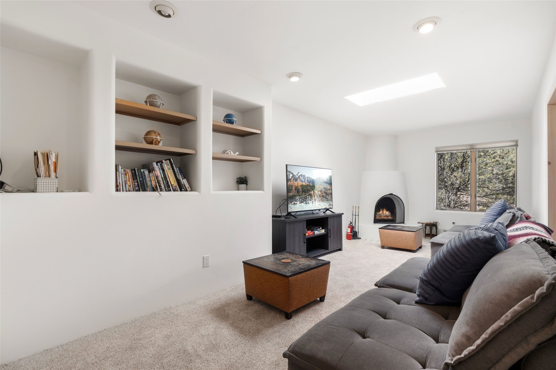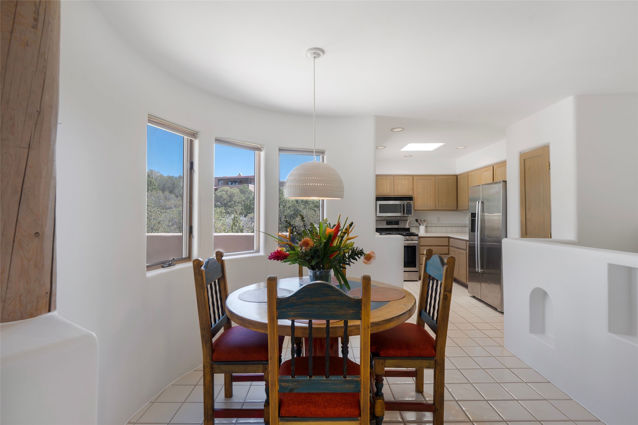 Just moments from the historic Santa Fe Plaza and a short stroll to the new Fort Marcy pickleball courts, this warm and light-filled residence blends classic Santa Fe character with modern comfort. High ceilings with exposed beams, abundant natural light, and two traditional kiva wood-burning fireplaces create an atmosphere that feels both timeless and welcoming. The home features 2 bedrooms, 2 baths, and an additional den—perfect as a home office, studio, or easily converted into a third bedroom. The spacious upper-level primary suite is a true retreat, complete with its own private deck overlooking Sun and Moon Mountain. Outdoor living is exceptional here, with two generous decks offering peaceful views of the surrounding hills and mountains. Whether you’re enjoying morning coffee or sunset skies, the setting is pure Santa Fe serenity. A rare 2-car garage, newly added air conditioning, and an on-demand hot water heater round out the home’s practical upgrades, making it as comfortable as it is charming. The furnishings are also available separately from the real property; making this a turnkey property. This is a special opportunity to live in one of Santa Fe’s most desirable walkable locations—close to culture, recreation, and the natural beauty that defines the City Different.