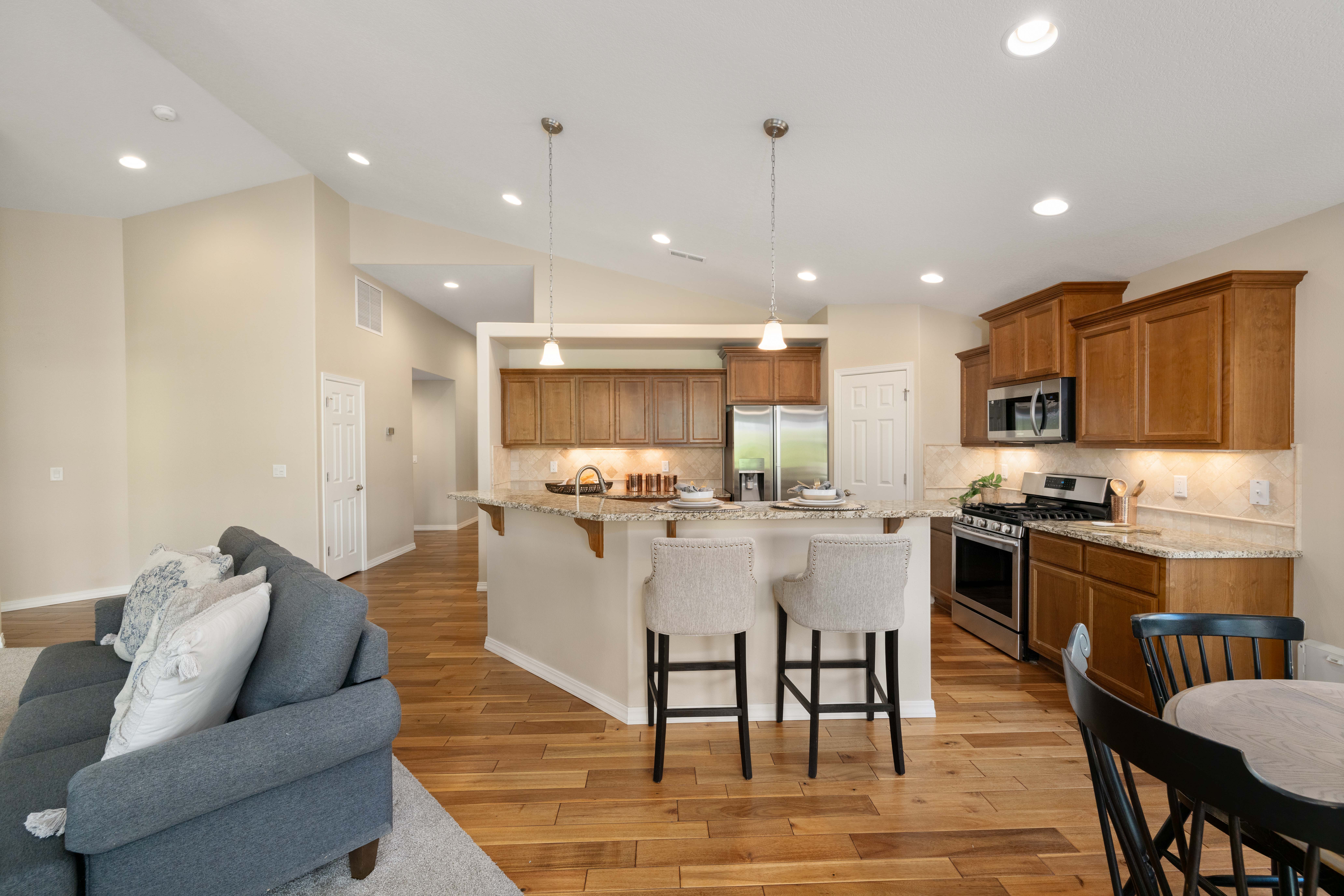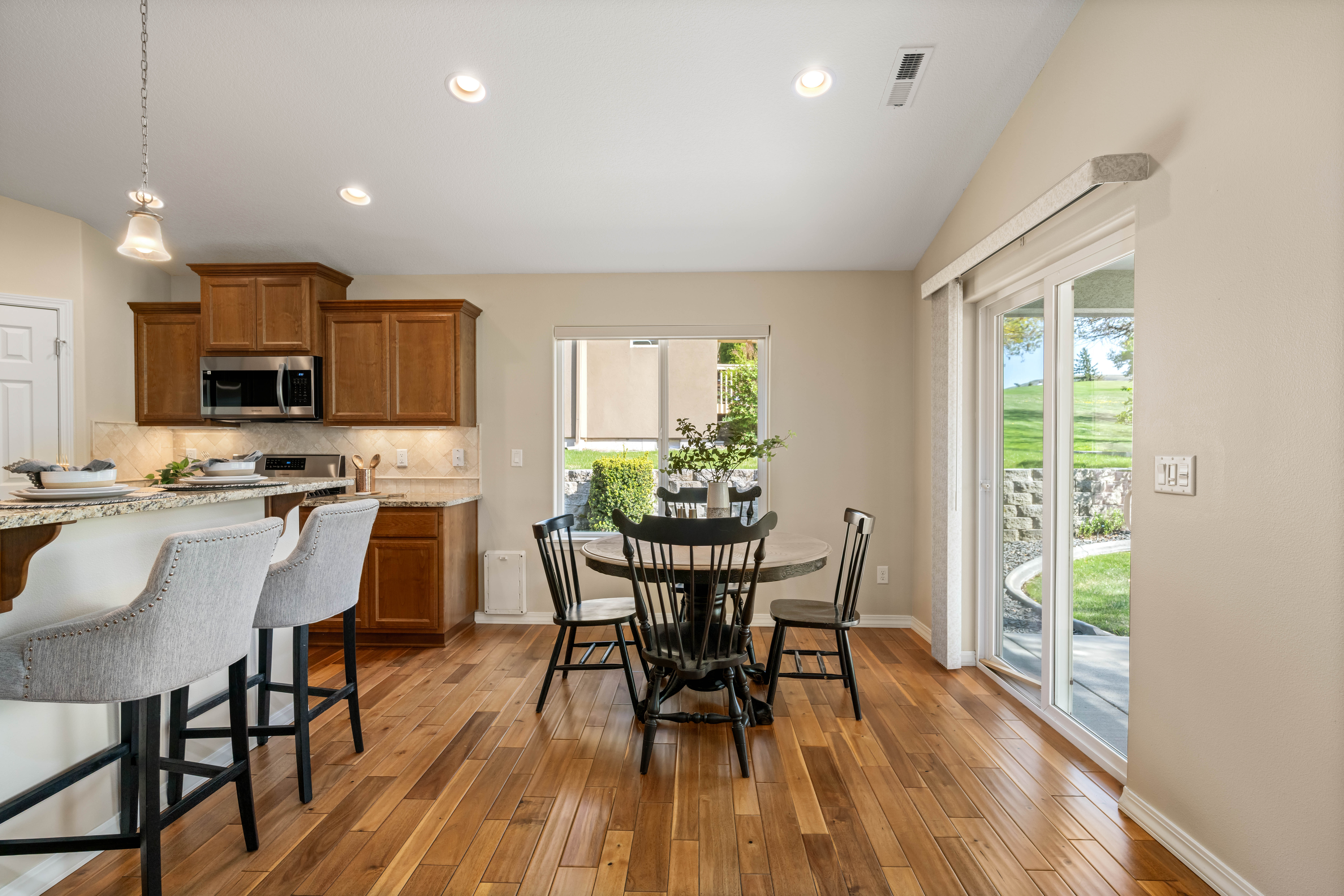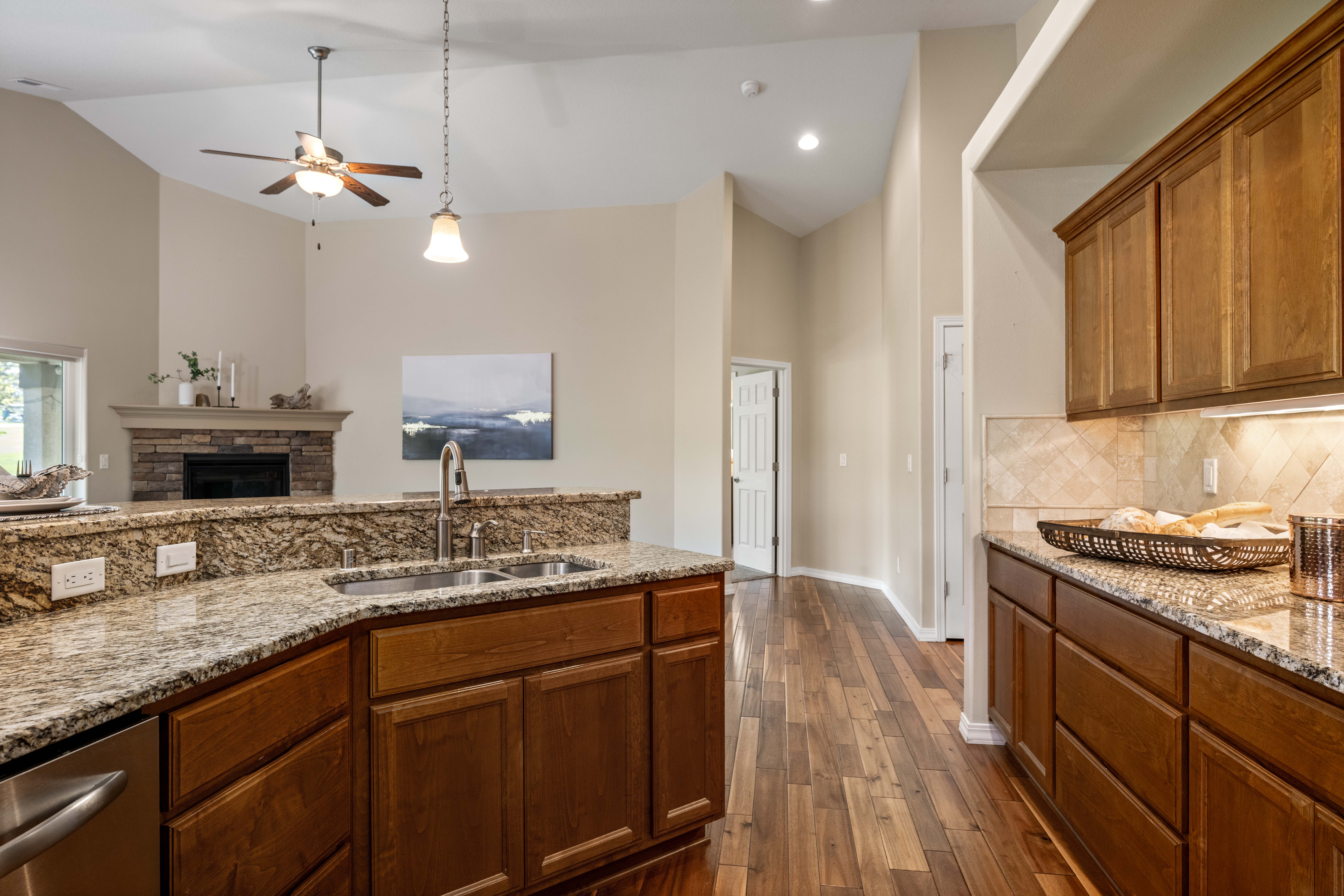 LOCATION! LOCATION! Tucked away in the middle of Canyon Lakes Golf Course is LODEN GREENS. This home sits on the 17th hole with amazing views to enjoy indoors and out. Built in 2016, this impeccably maintained Rambler is waiting for its new owner! Step into the Foyer with vaulted ceilings and you can see all the way through to the stunning view of the golf course. There's plenty of natural light coming in the big front room windows. This home is an open floorplan with Chefs kitchen looking onto the Great Room. Granite counters, Walk in pantry. The large island has breakfast bar seating plus generous size Kitchen dining . All appliances are included. Gas fireplace to enjoy those chilly winter nights. Main floor Mstr Suite includes walk in closet, dual sinks, walk in shower and separate garden tub. Two other BR on the opposite side of the home. One has been a designated office space for the previous owner. The oversized 3 car finished garage has deep bays. This home is handicap accessible. Open and covered patios are perfect for outdoor entertaining and taking in your beautiful golf course views. Enjoy the convenient location close to walking paths, restaurants, shopping and easy access to HWY 395! Call your favorite Realtor today!