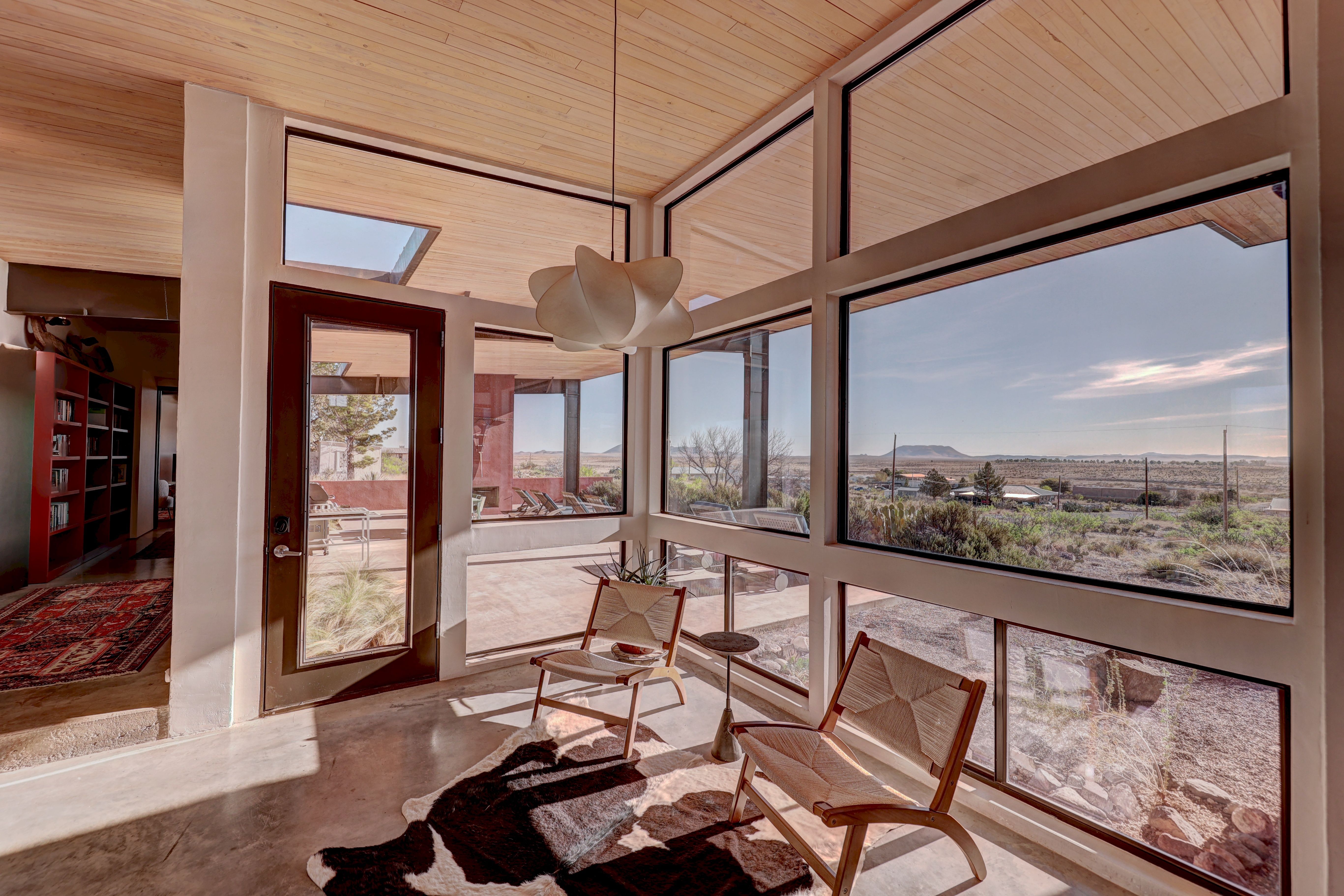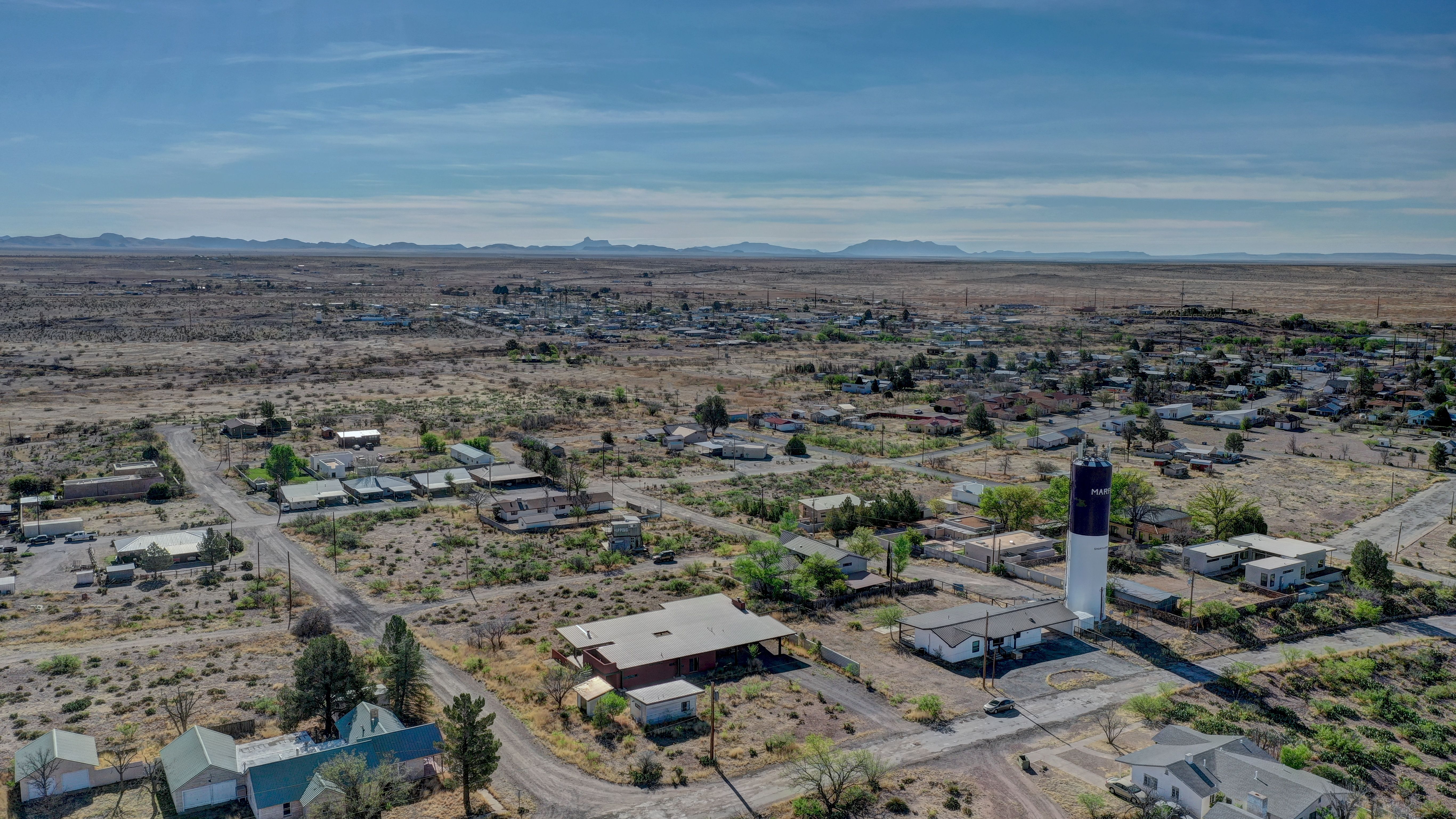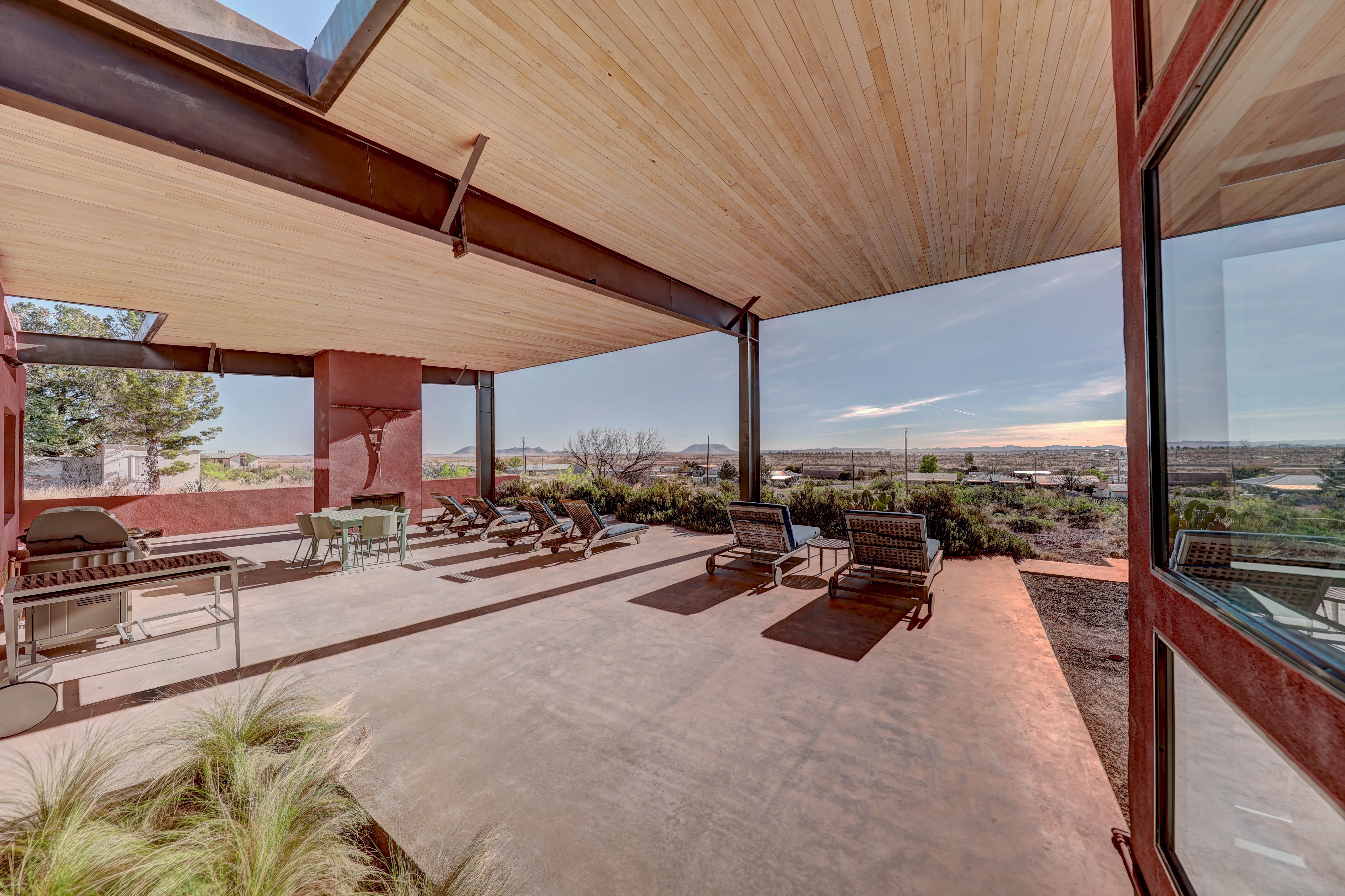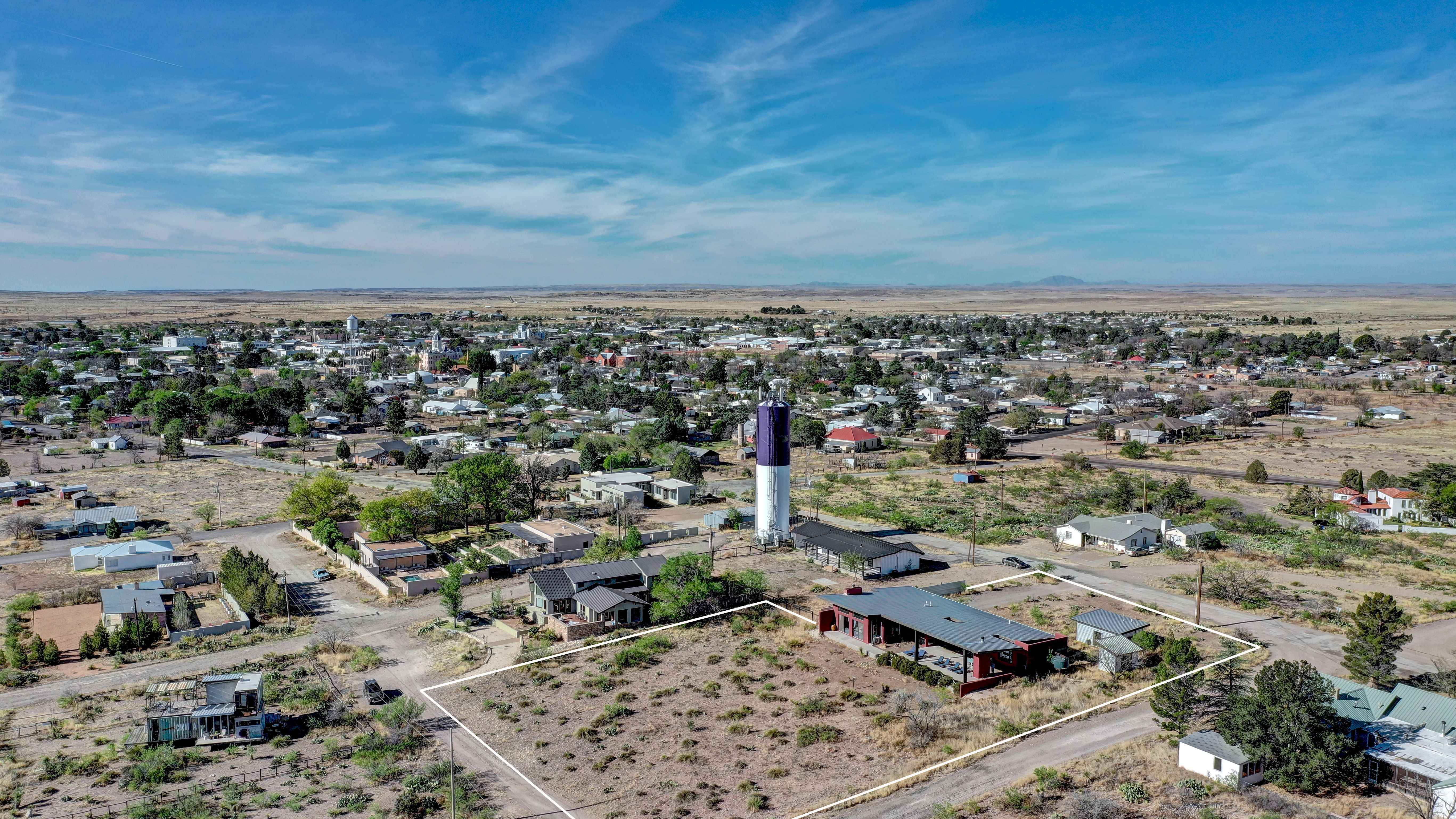 At the very highest point of Marfa sits 1104 North Alamito Street, a celebration of contemporary architecture that perfectly embodies the city surrounding it. The main house, designed by Cameron Armstrong Architects and expertly constructed of Hebel block and structural steel, creates a unique experience with the high desert. Sweeping views of the Haystacks and Puertacita Mountains stretch along the eastern skyline, with the home itself oriented to maximize the incomparable vistas. Comprising seven platted lots, the upper three host the luxurious main home, casita, and outbuildings, while the lower four slope down twenty feet to Hermosa Street and protect the jaw-dropping eastern views. Find your personal oasis in the northern end of the house, where the sprawling primary suite will welcome rest and relaxation. A gorgeous guest suite awaits by the entry, while a detached casita is a home-away-from-home for guests, offering additional flexibility and privacy. The open interior is bathed in light from the massive eastern fenestrations. Entertain outdoors on the expansive covered patio, cuddled up by the outdoor fireplace as the sun rises over the mountain ranges or the stars sparkle in the coal-black Texas sky.