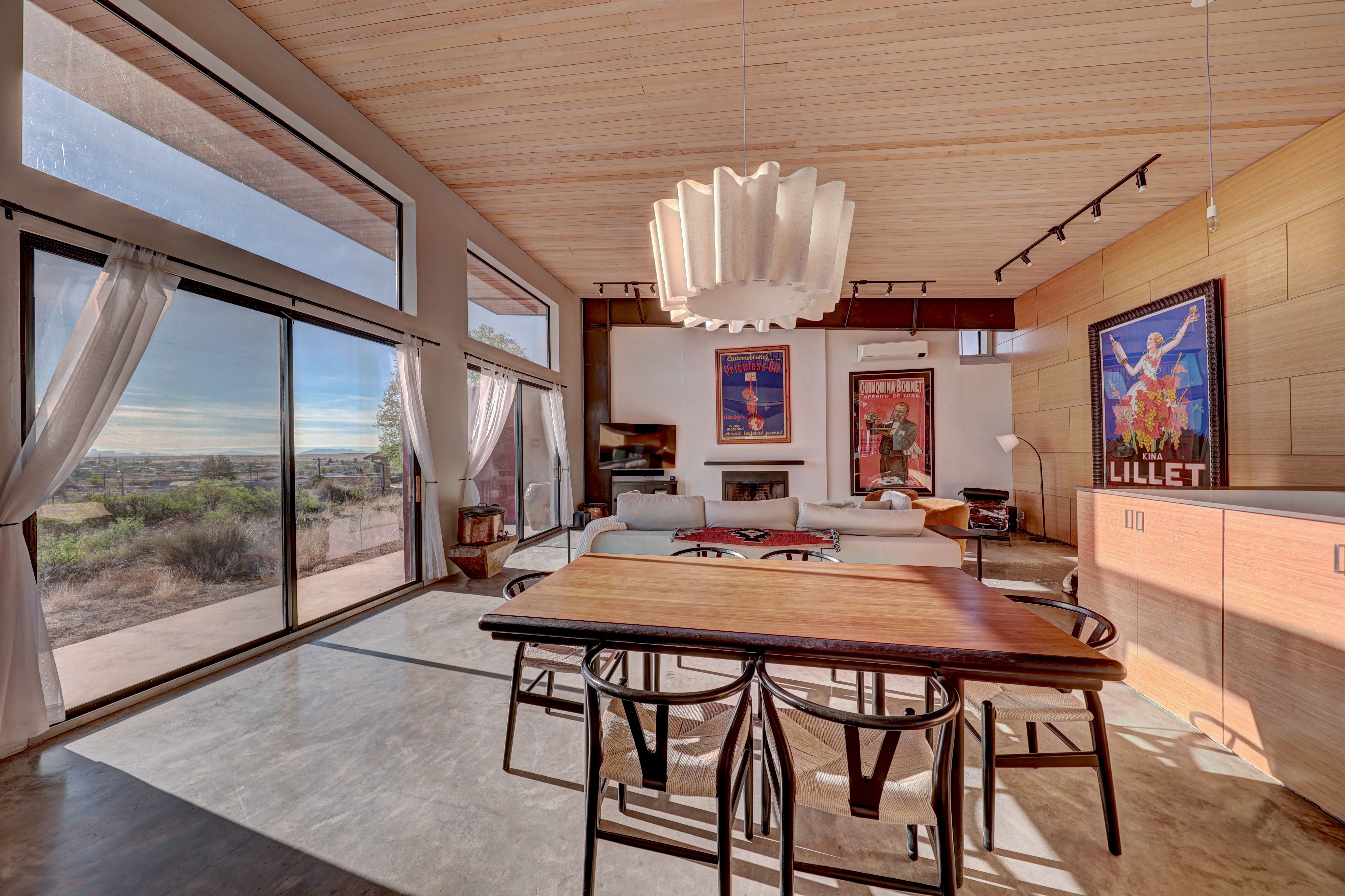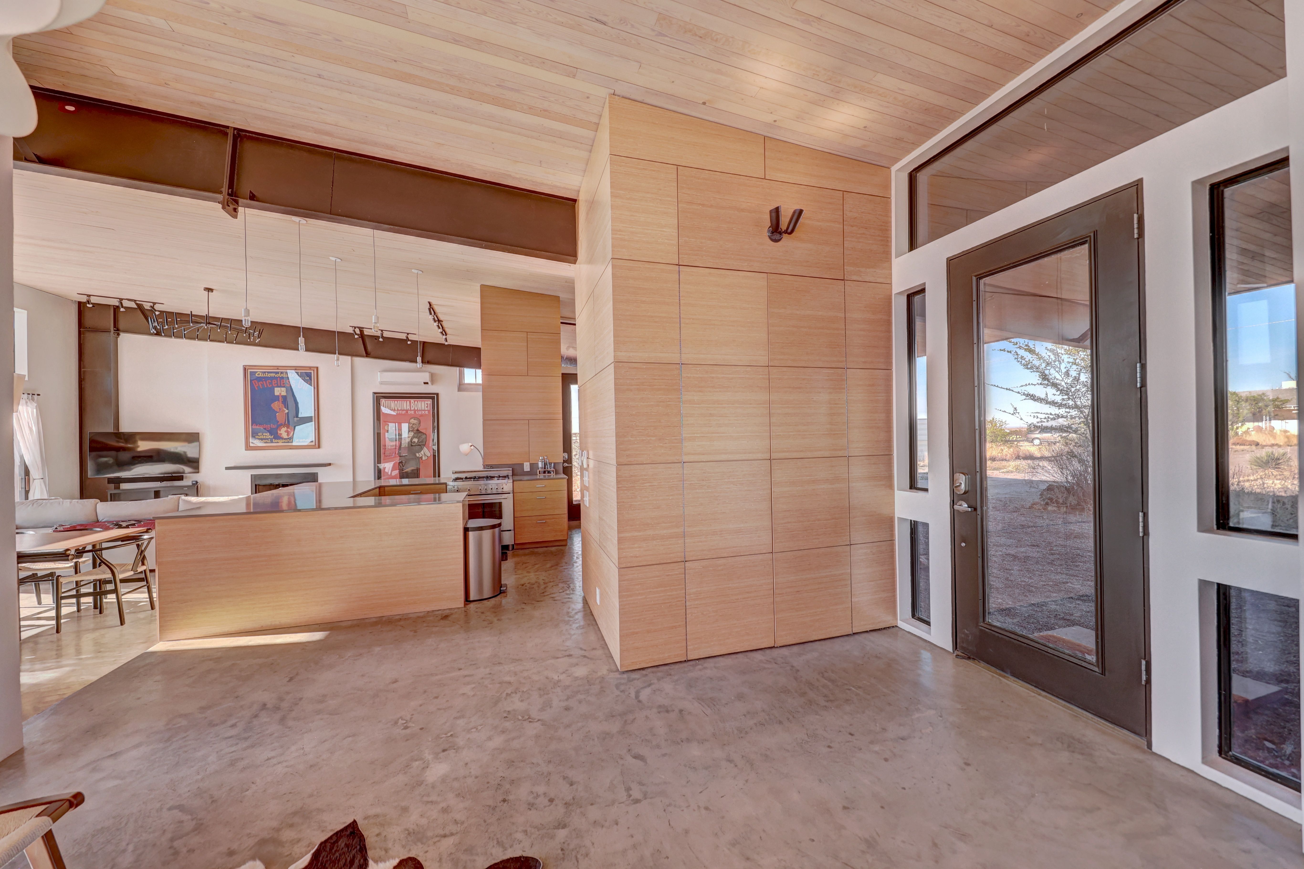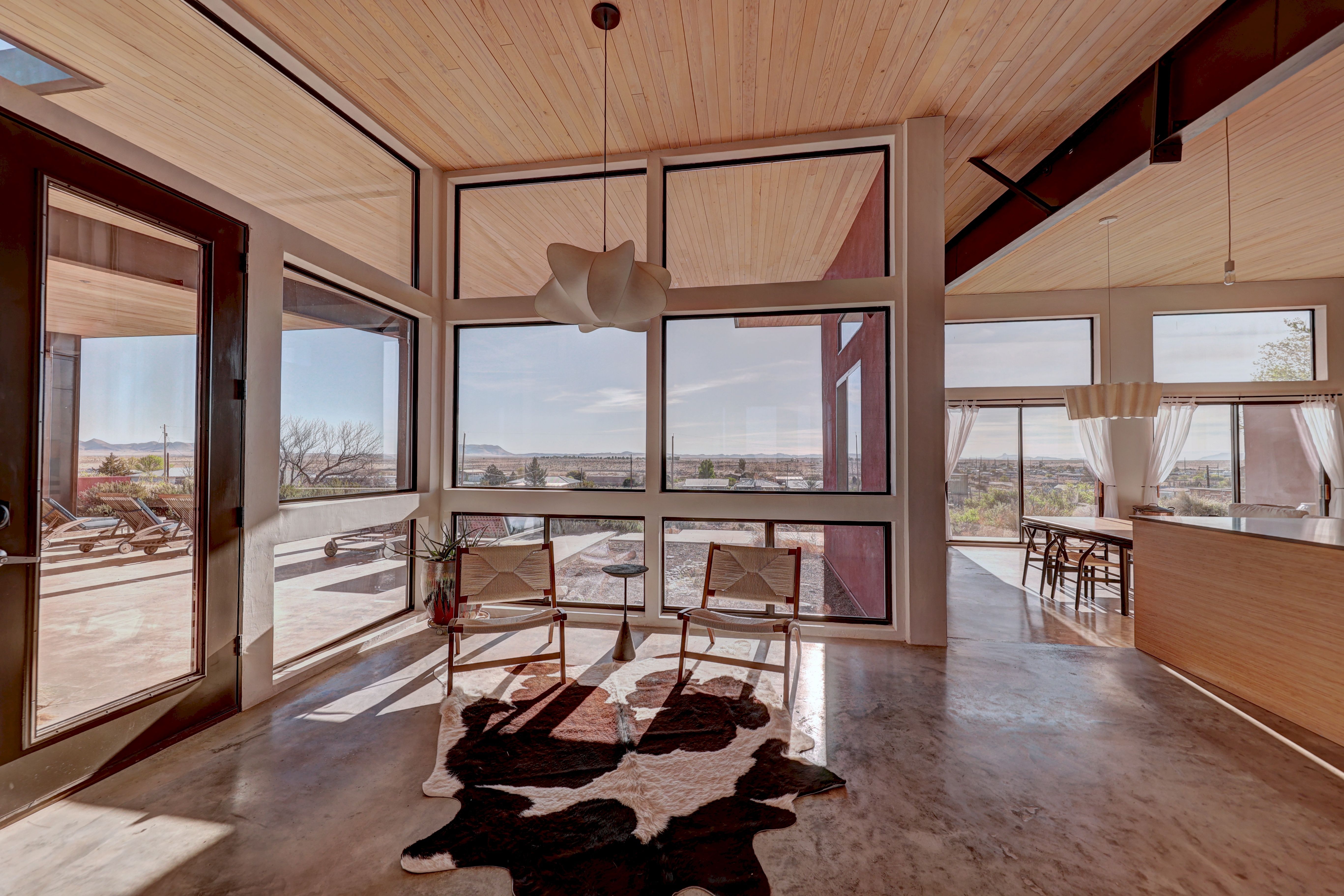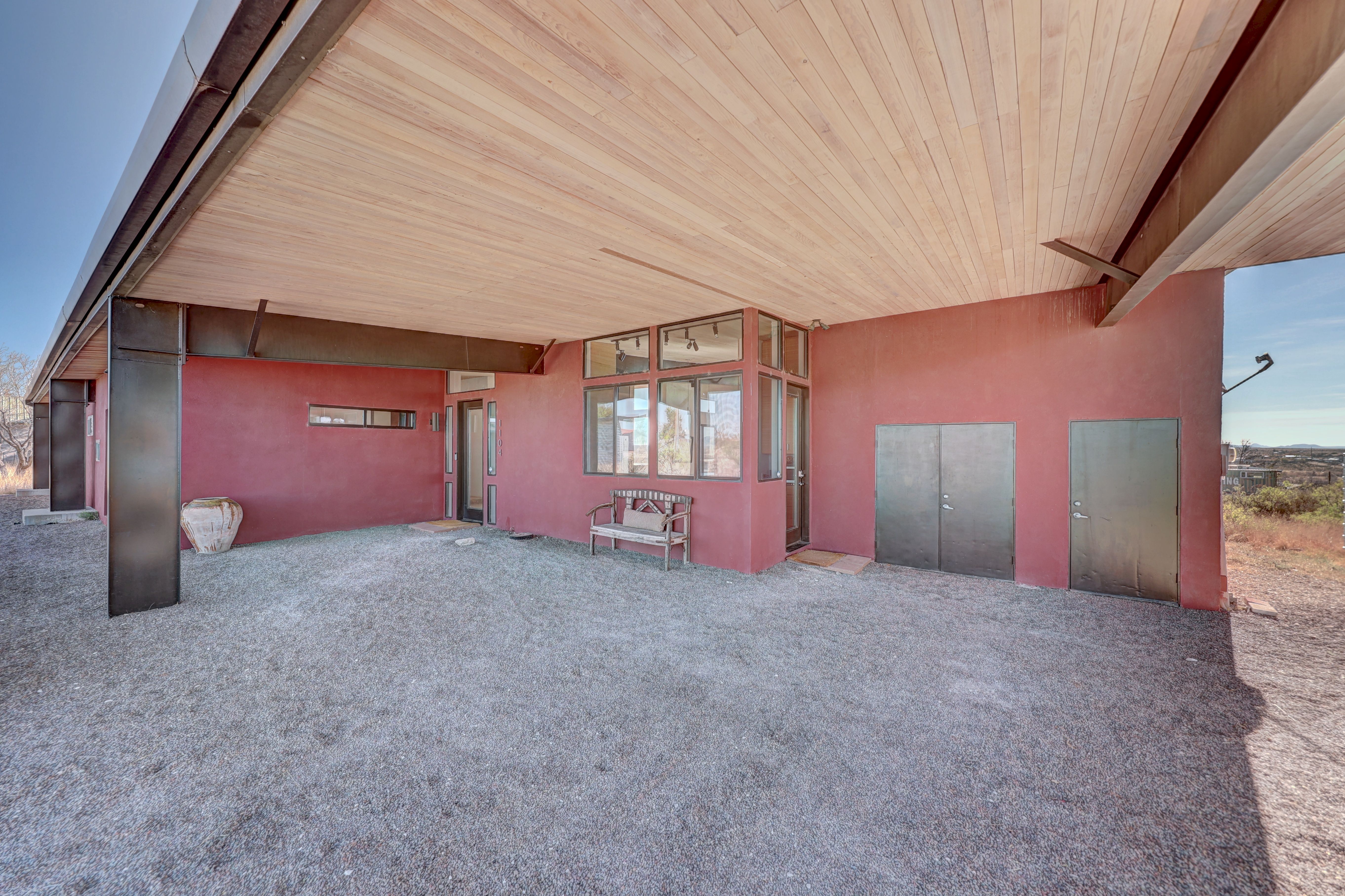At the very highest point of Marfa sits 1104 North Alamito Street, a celebration of contemporary architecture that perfectly embodies the city surrounding it. The main house, designed by Cameron Armstrong Architects and expertly constructed of Hebel block and structural steel, creates a unique experience with the high desert. Sweeping views of the Haystacks and Puertacita Mountains stretch along the eastern skyline, with the home itself oriented to maximize the incomparable vistas. Comprising seven platted lots, the upper three host the luxurious main home, casita, and outbuildings, while the lower four slope down twenty feet to Hermosa Street and protect the jaw-dropping eastern views. Find your personal oasis in the northern end of the house, where the sprawling primary suite will welcome rest and relaxation. A gorgeous guest suite awaits by the entry, while a detached casita is a home-away-from-home for guests, offering additional flexibility and privacy. The open interior is bathed in light from the massive eastern fenestrations. Entertain outdoors on the expansive covered patio, cuddled up by the outdoor fireplace as the sun rises over the mountain ranges or the stars sparkle in the coal-black Texas sky.