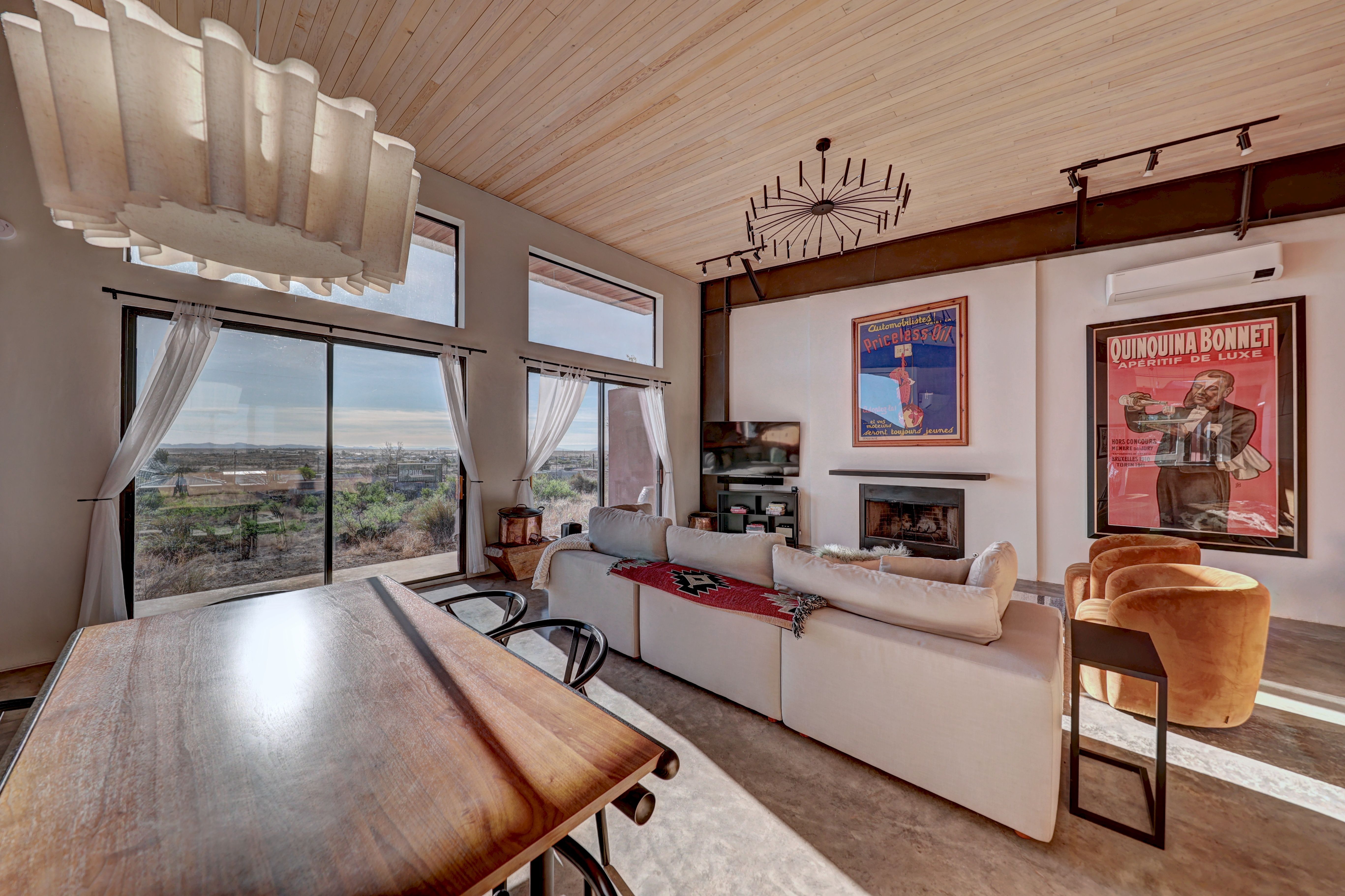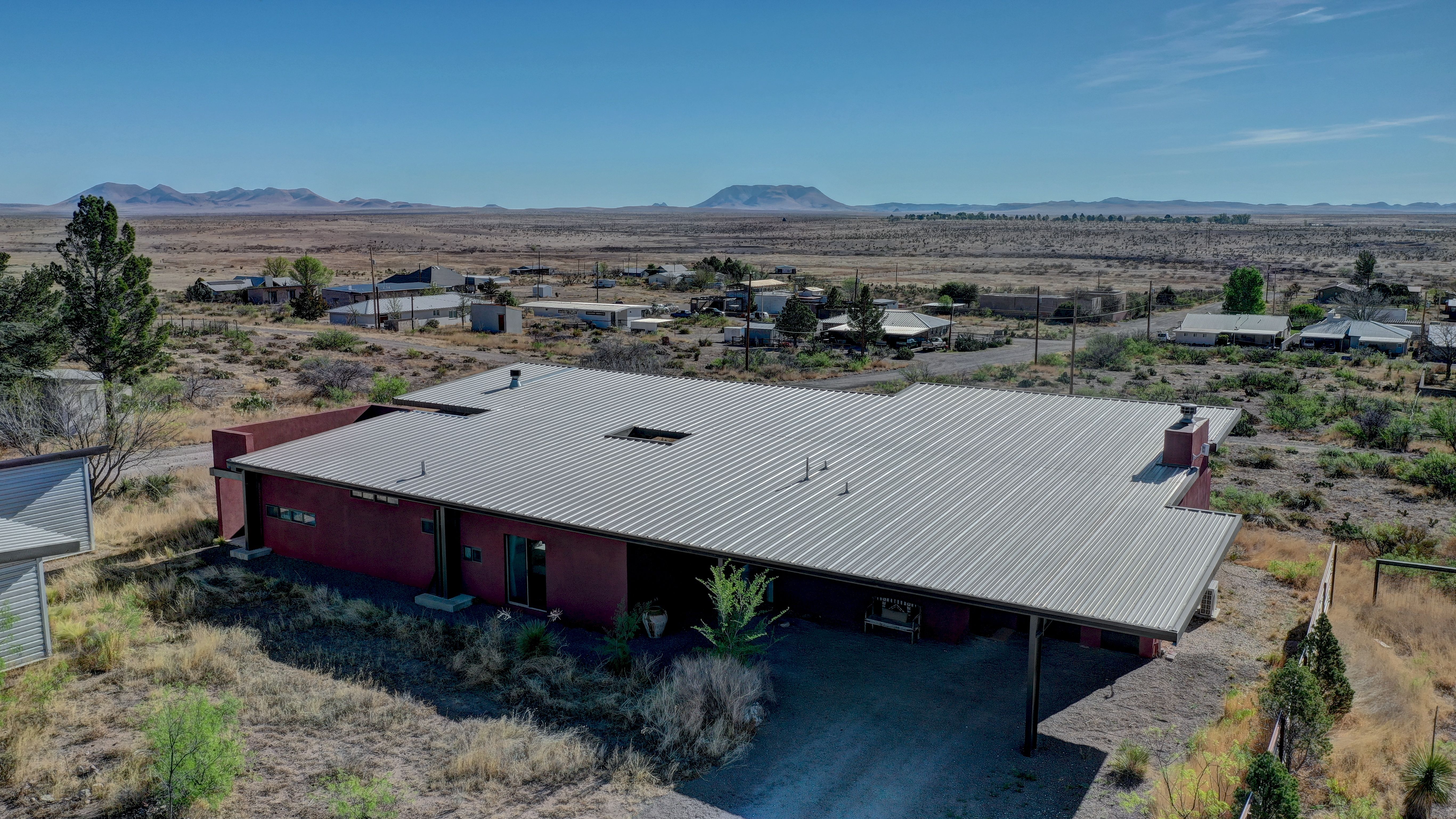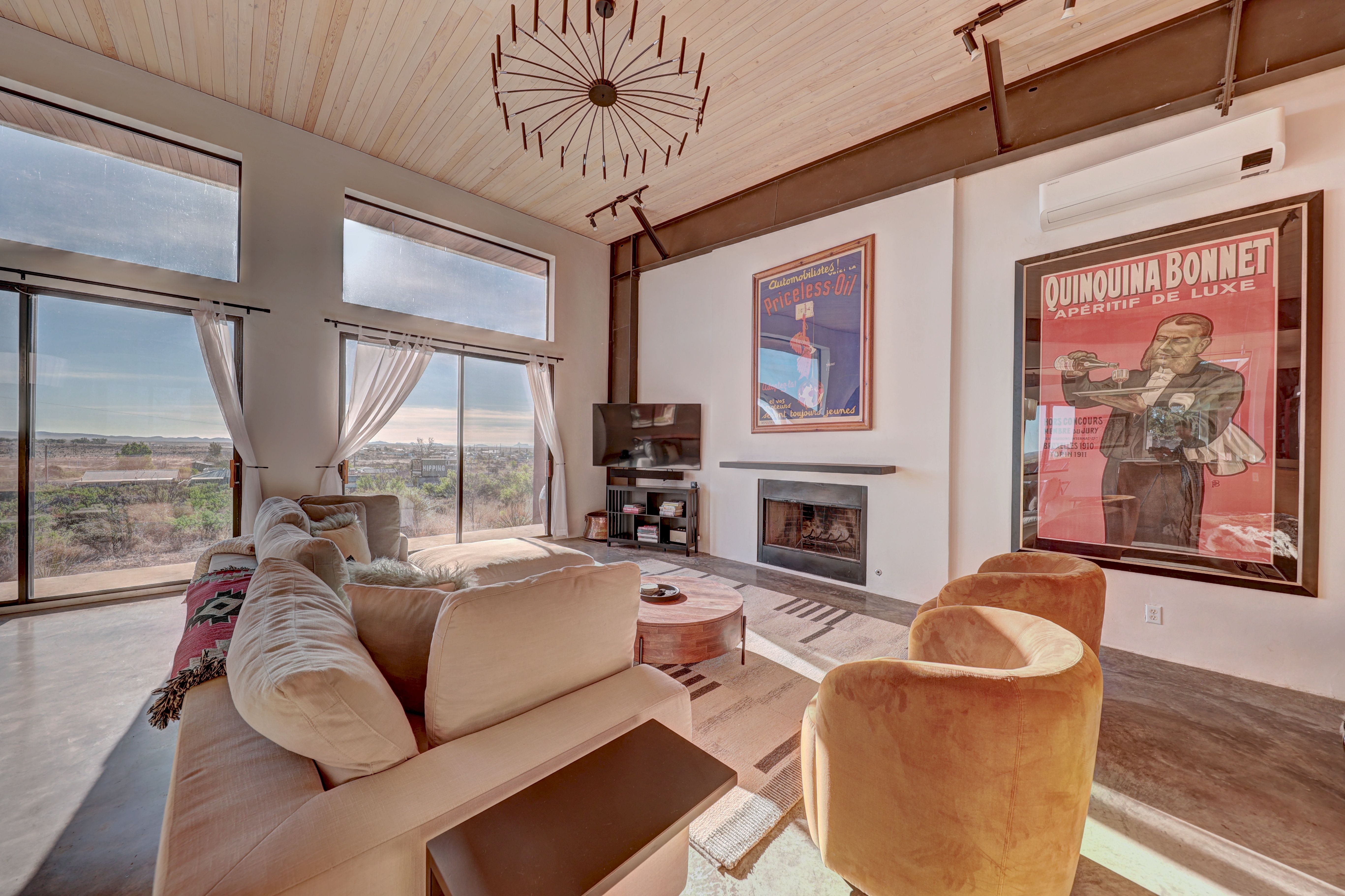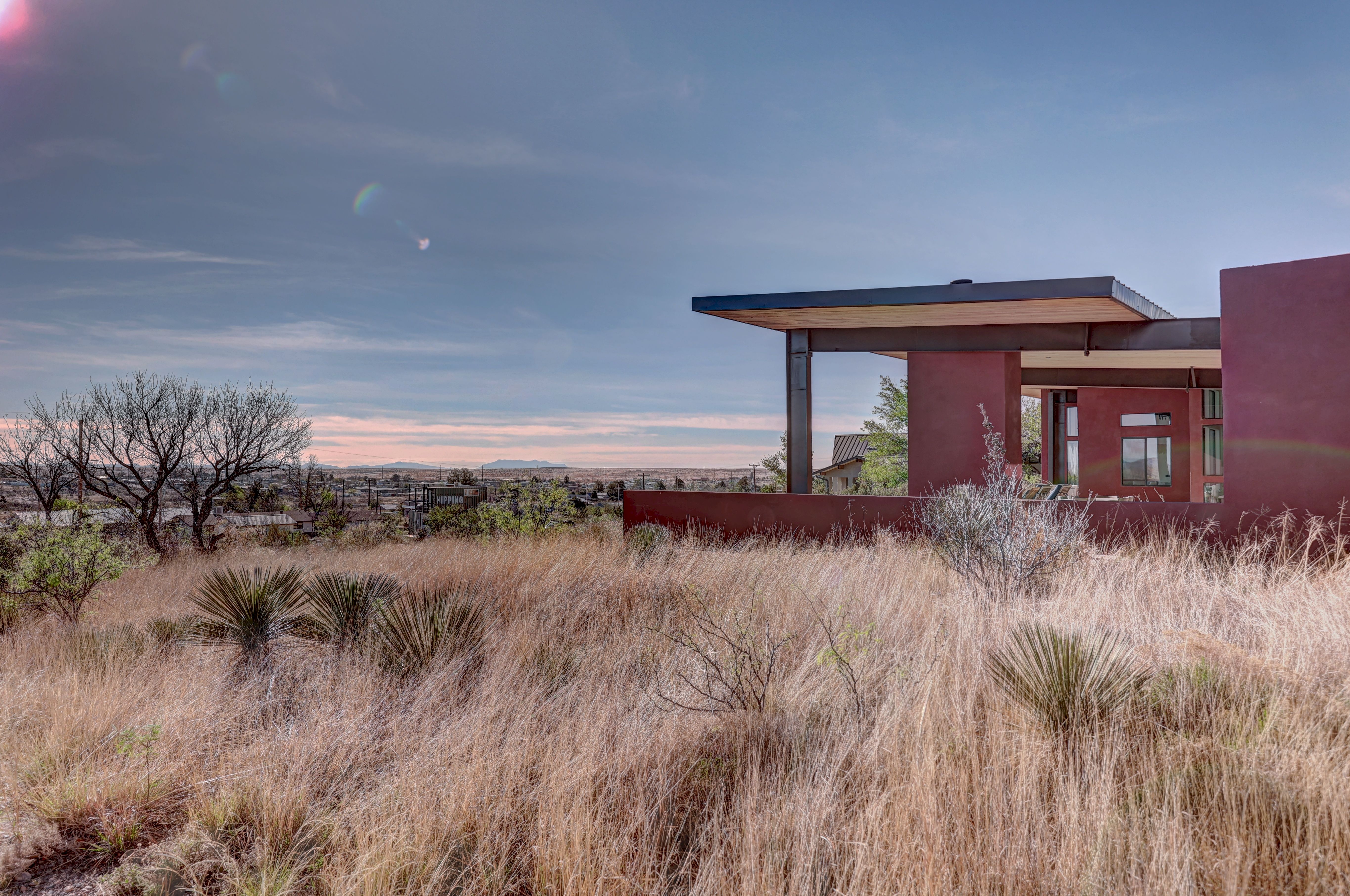 At the very highest point of Marfa sits 1104 North Alamito Street, a celebration of contemporary architecture that perfectly embodies the city surrounding it. The main house, designed by Cameron Armstrong Architects and expertly constructed of Hebel block and structural steel, creates a unique experience with the high desert. Sweeping views of the Haystacks and Puertacita Mountains stretch along the eastern skyline, with the home itself oriented to maximize the incomparable vistas. Comprising seven platted lots, the upper three host the luxurious main home, casita, and outbuildings, while the lower four slope down twenty feet to Hermosa Street and protect the jaw-dropping eastern views. Find your personal oasis in the northern end of the house, where the sprawling primary suite will welcome rest and relaxation. A gorgeous guest suite awaits by the entry, while a detached casita is a home-away-from-home for guests, offering additional flexibility and privacy. The open interior is bathed in light from the massive eastern fenestrations. Entertain outdoors on the expansive covered patio, cuddled up by the outdoor fireplace as the sun rises over the mountain ranges or the stars sparkle in the coal-black Texas sky.
