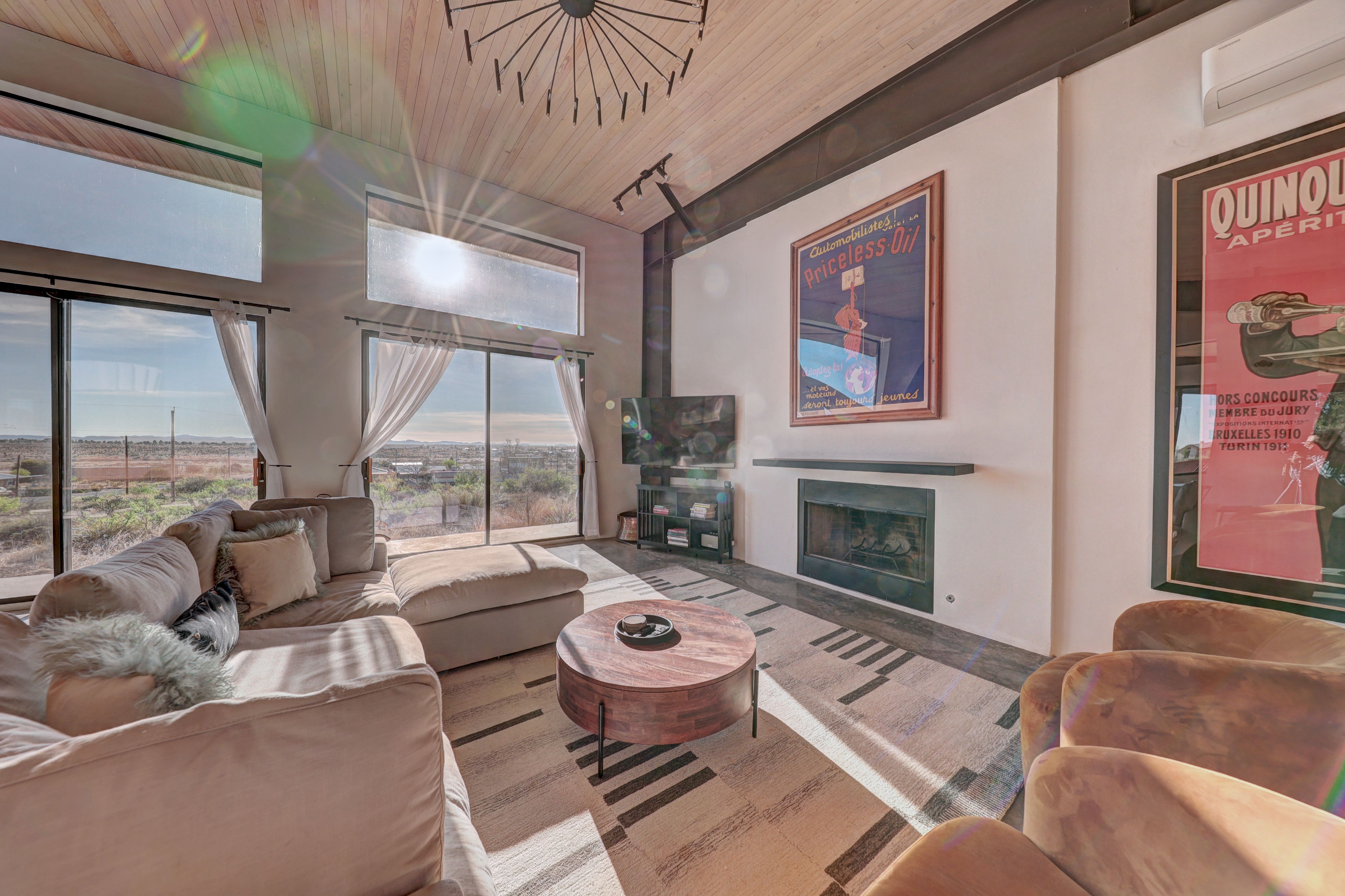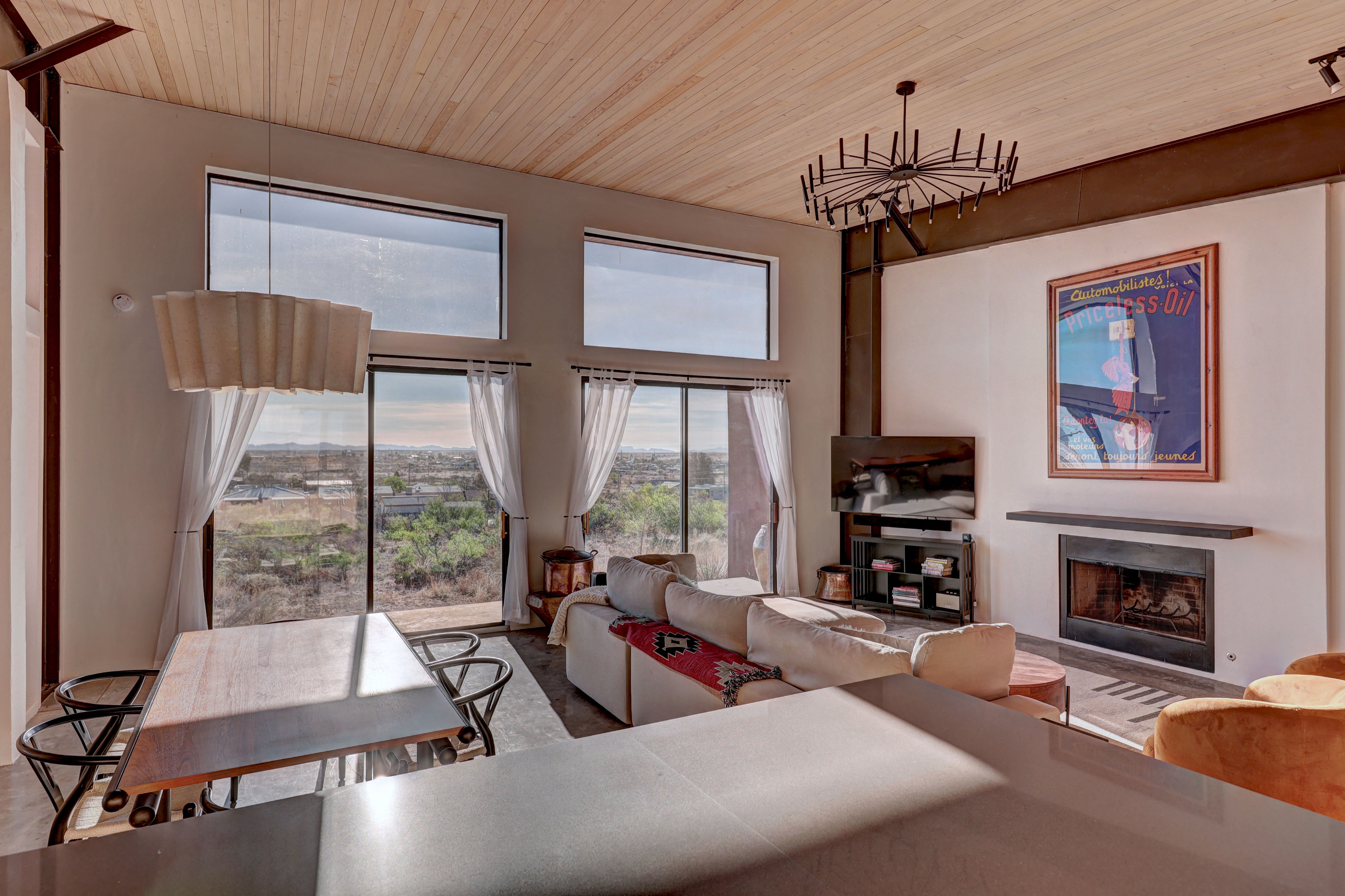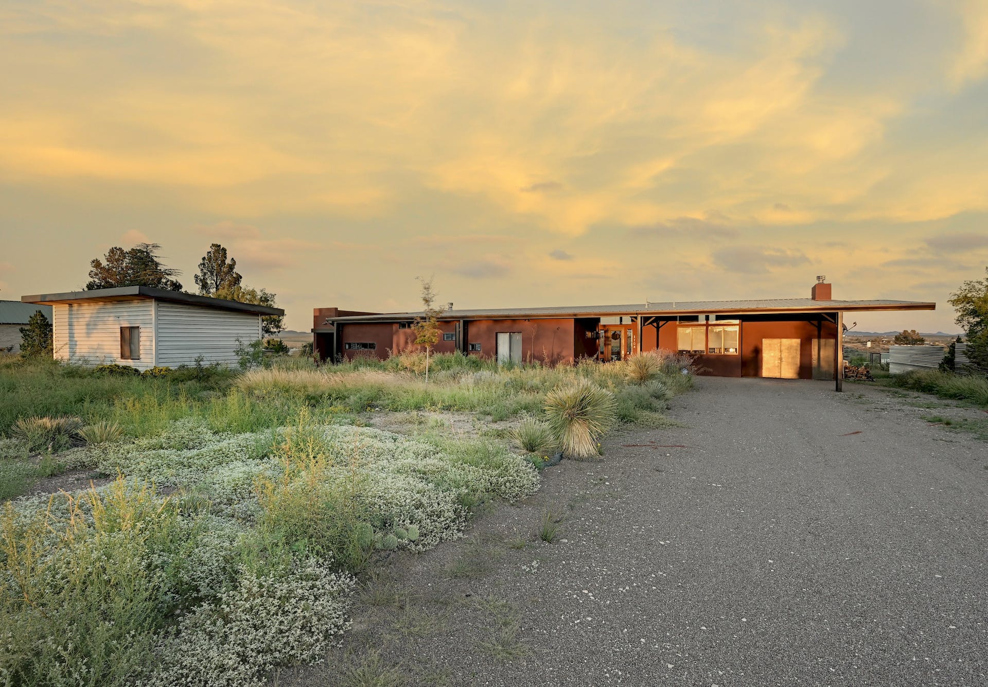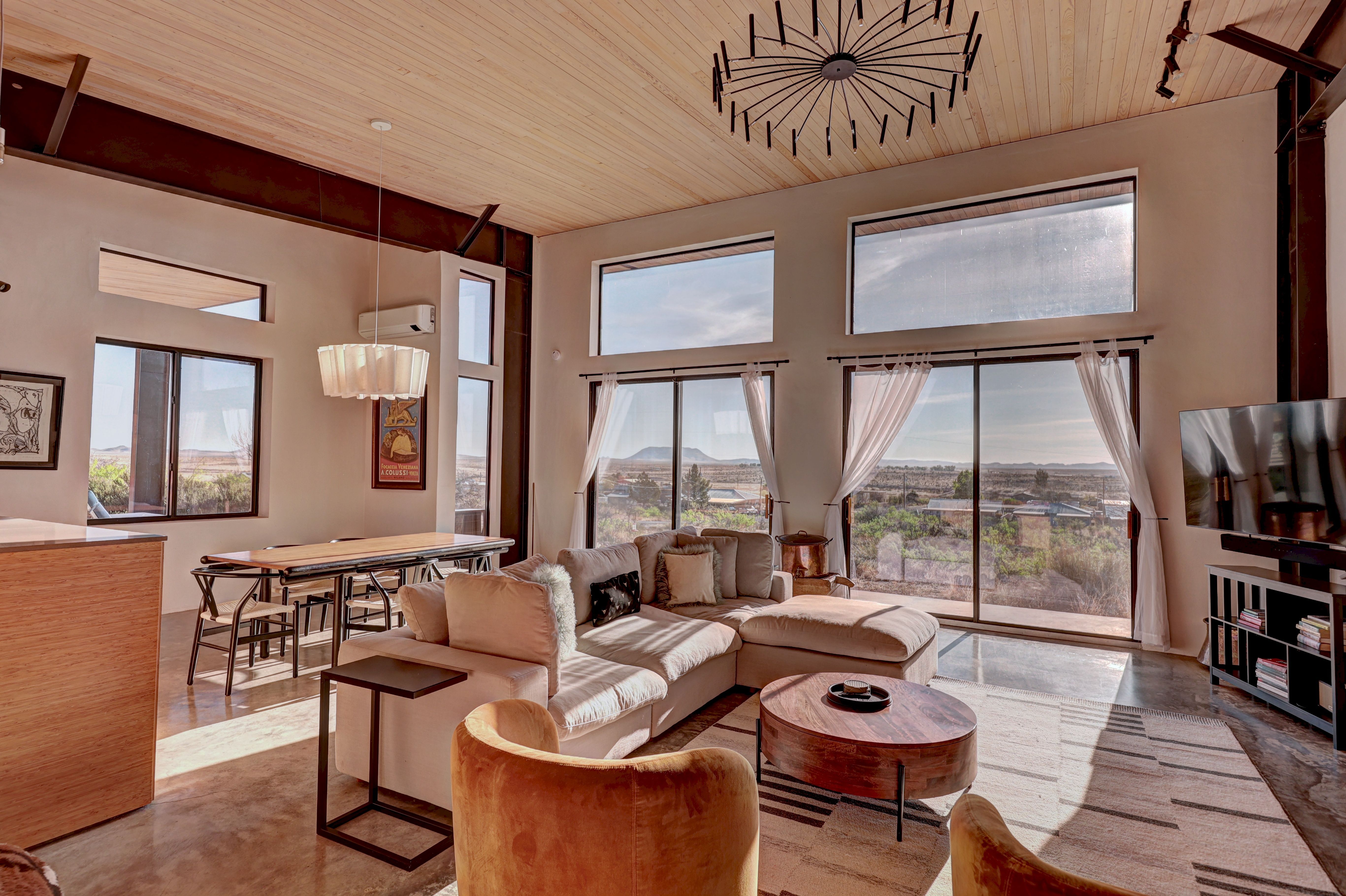 At the very highest point of Marfa sits 1104 North Alamito Street, a celebration of contemporary architecture that perfectly embodies the city surrounding it. The main house, designed by Cameron Armstrong Architects and expertly constructed of Hebel block and structural steel, creates a unique experience with the high desert. Sweeping views of the Haystacks and Puertacita Mountains stretch along the eastern skyline, with the home itself oriented to maximize the incomparable vistas. Comprising seven platted lots, the upper three host the luxurious main home, casita, and outbuildings, while the lower four slope down twenty feet to Hermosa Street and protect the jaw-dropping eastern views. Find your personal oasis in the northern end of the house, where the sprawling primary suite will welcome rest and relaxation. A gorgeous guest suite awaits by the entry, while a detached casita is a home-away-from-home for guests, offering additional flexibility and privacy. The open interior is bathed in light from the massive eastern fenestrations. Entertain outdoors on the expansive covered patio, cuddled up by the outdoor fireplace as the sun rises over the mountain ranges or the stars sparkle in the coal-black Texas sky.