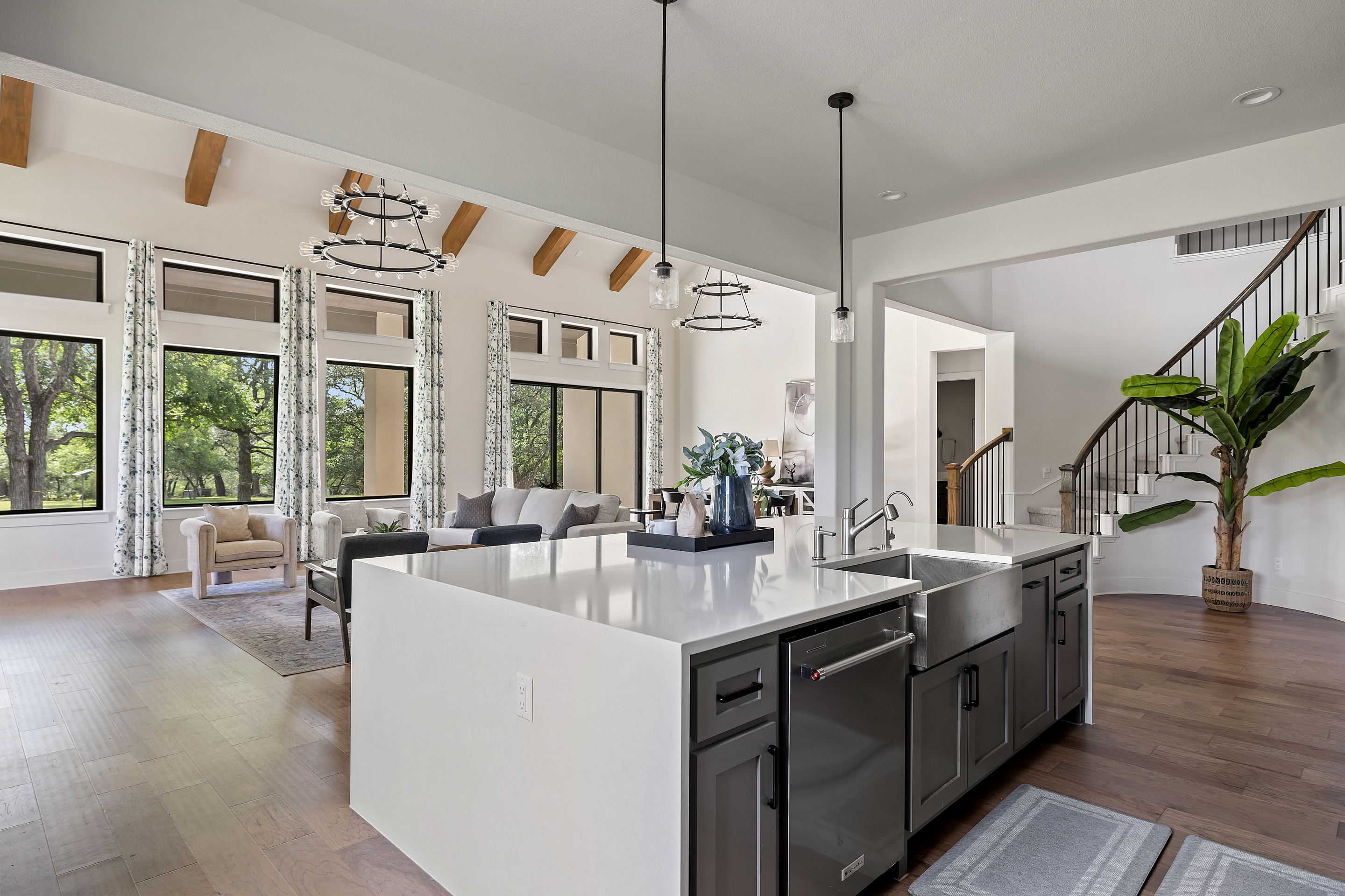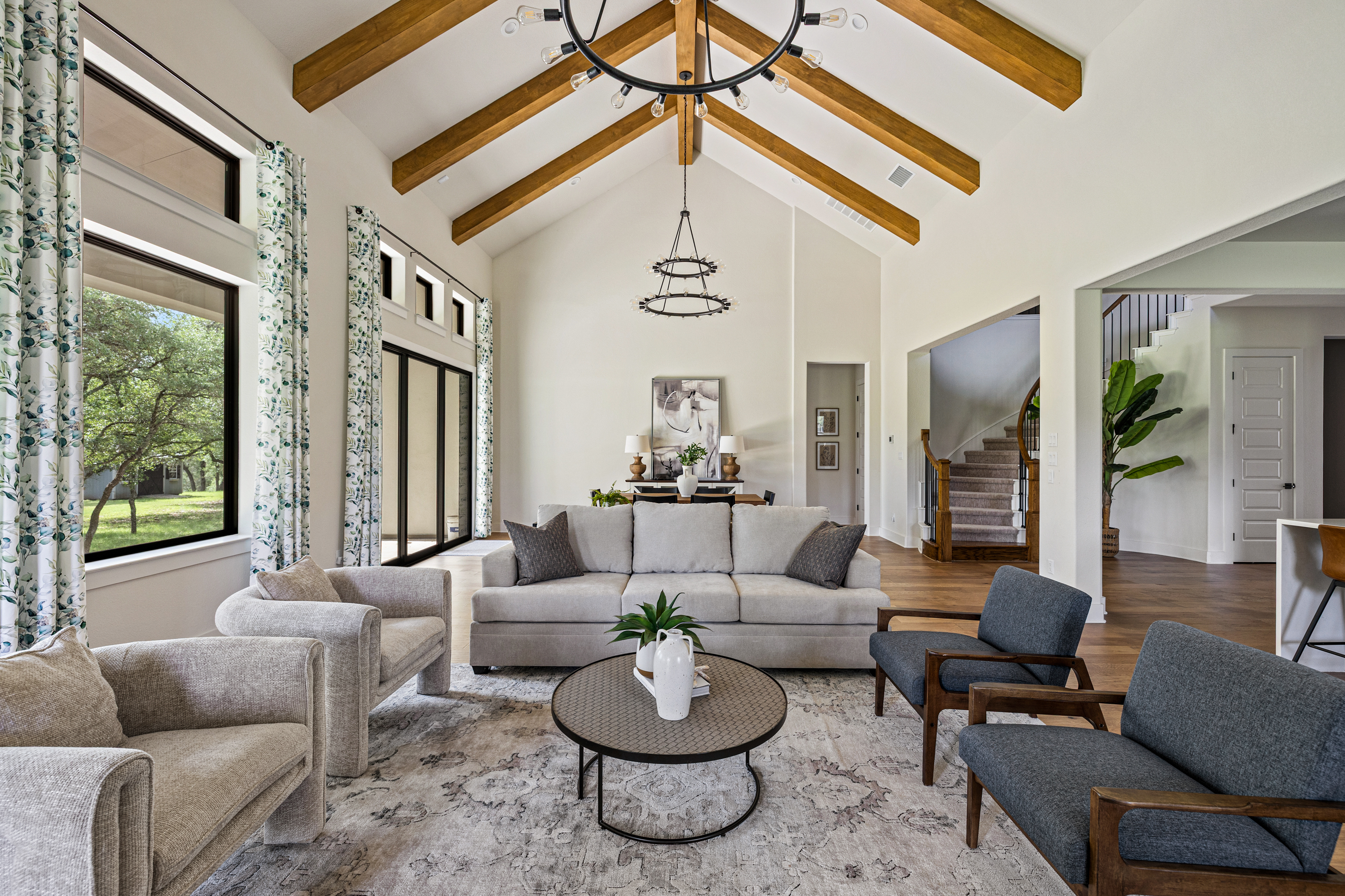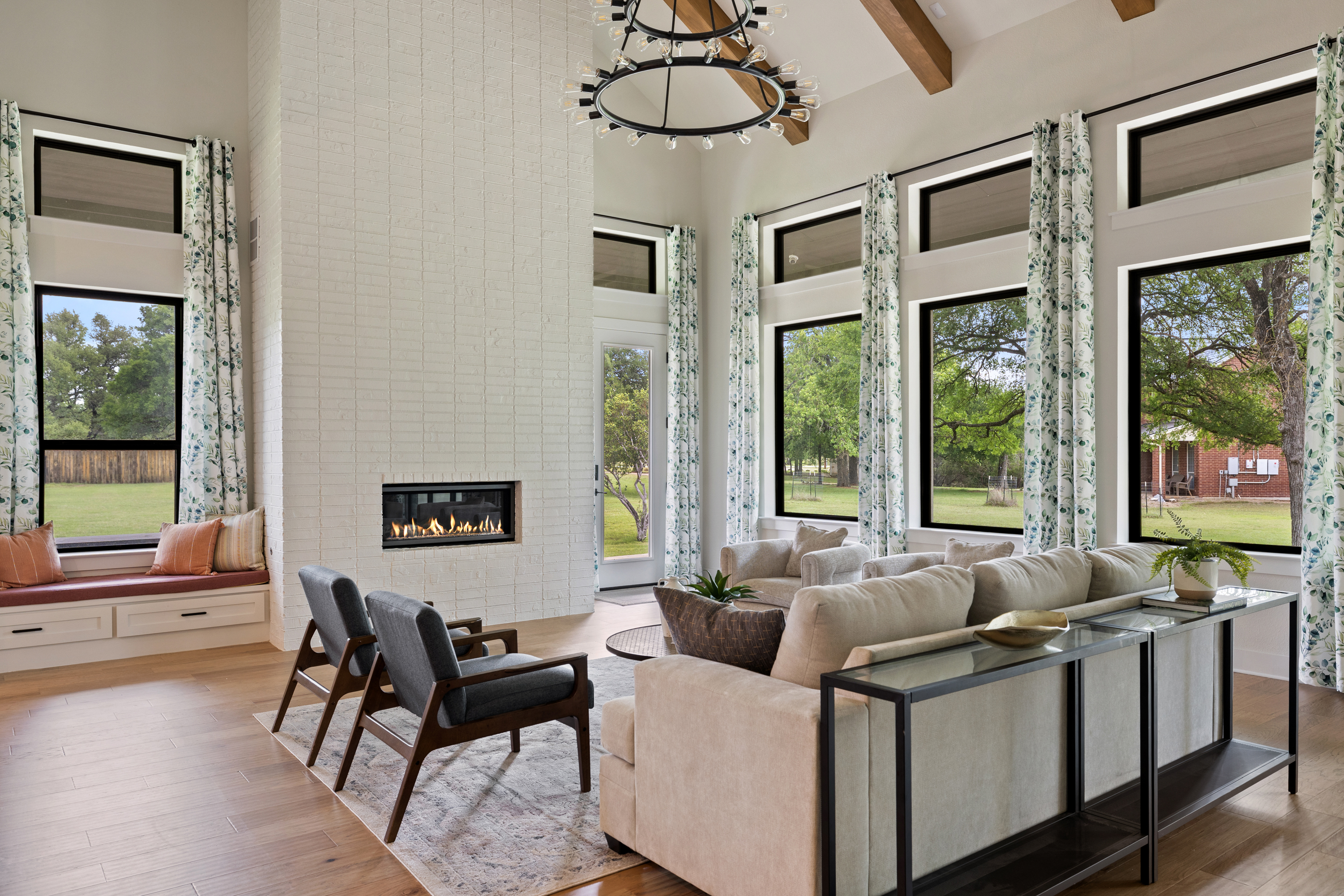 Stunning contemporary custom home set on over an acre in the gated community of Gabriel’s Overlook. Tucked among mature trees, this private, picturesque lot offers a serene retreat with exceptional curb appeal, highlighted by a beautifully landscaped front yard, expansive driveway, and inviting wraparound porch designed to take in the peaceful surroundings. Inside, the main level showcases white oak flooring, soaring vaulted ceilings with exposed beams, and a wall of floor-to-ceiling windows that flood the great room with natural light. The open-concept design seamlessly connects the gourmet kitchen to the oversized living area, perfect for both everyday living and entertaining. Ideal for multi-generational living, the main floor also features a private in-law suite complete with its own living room. The primary suite is a true sanctuary, offering large windows overlooking the wooded backyard, a spa-inspired bath with a freestanding soaking tub, oversized walk-in shower, and a spacious custom closet. Upstairs, you’ll find a media room, game room, and three generously sized bedrooms, each with its own en-suite bathroom, providing comfort and privacy for family and guests alike.