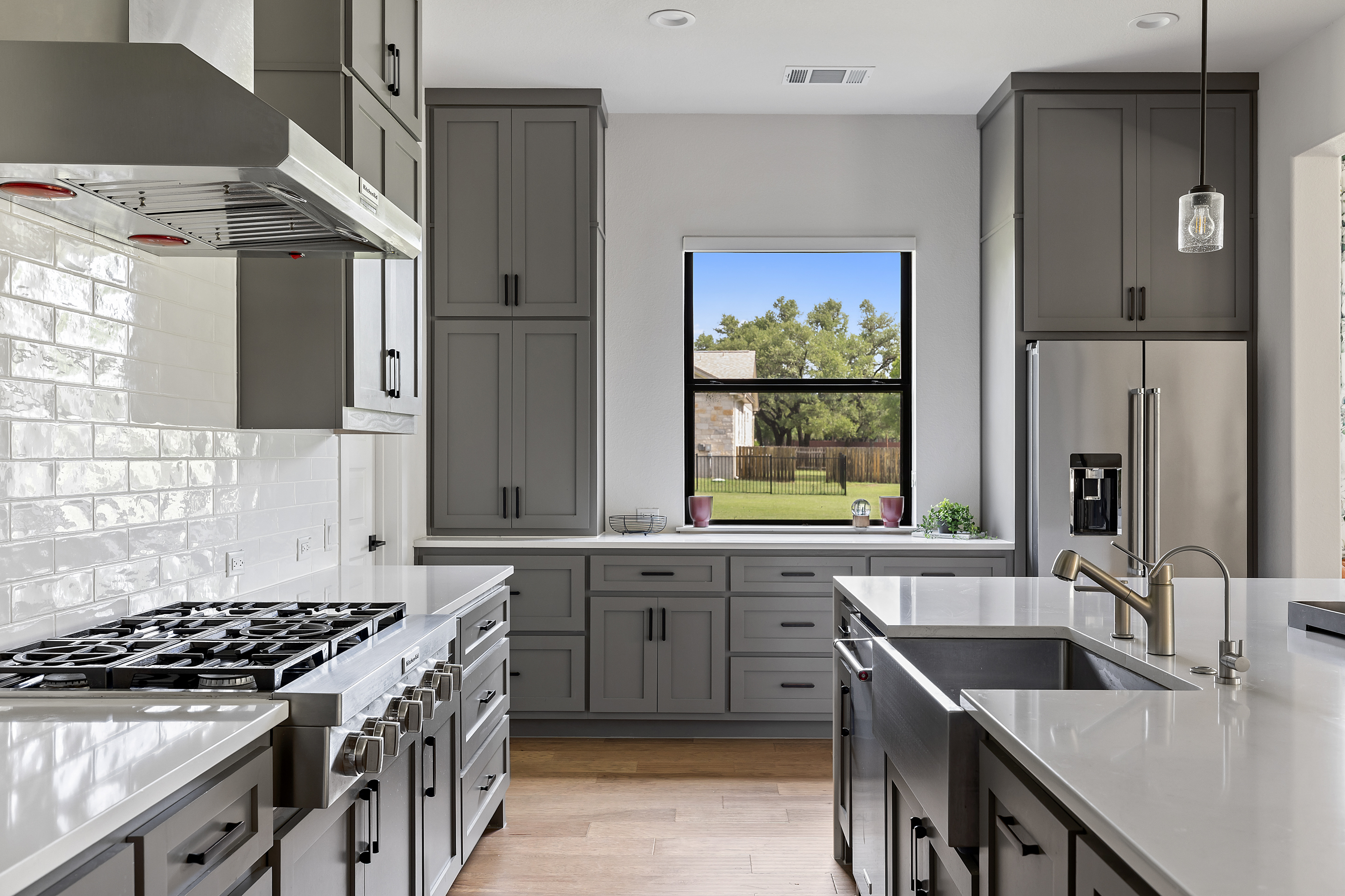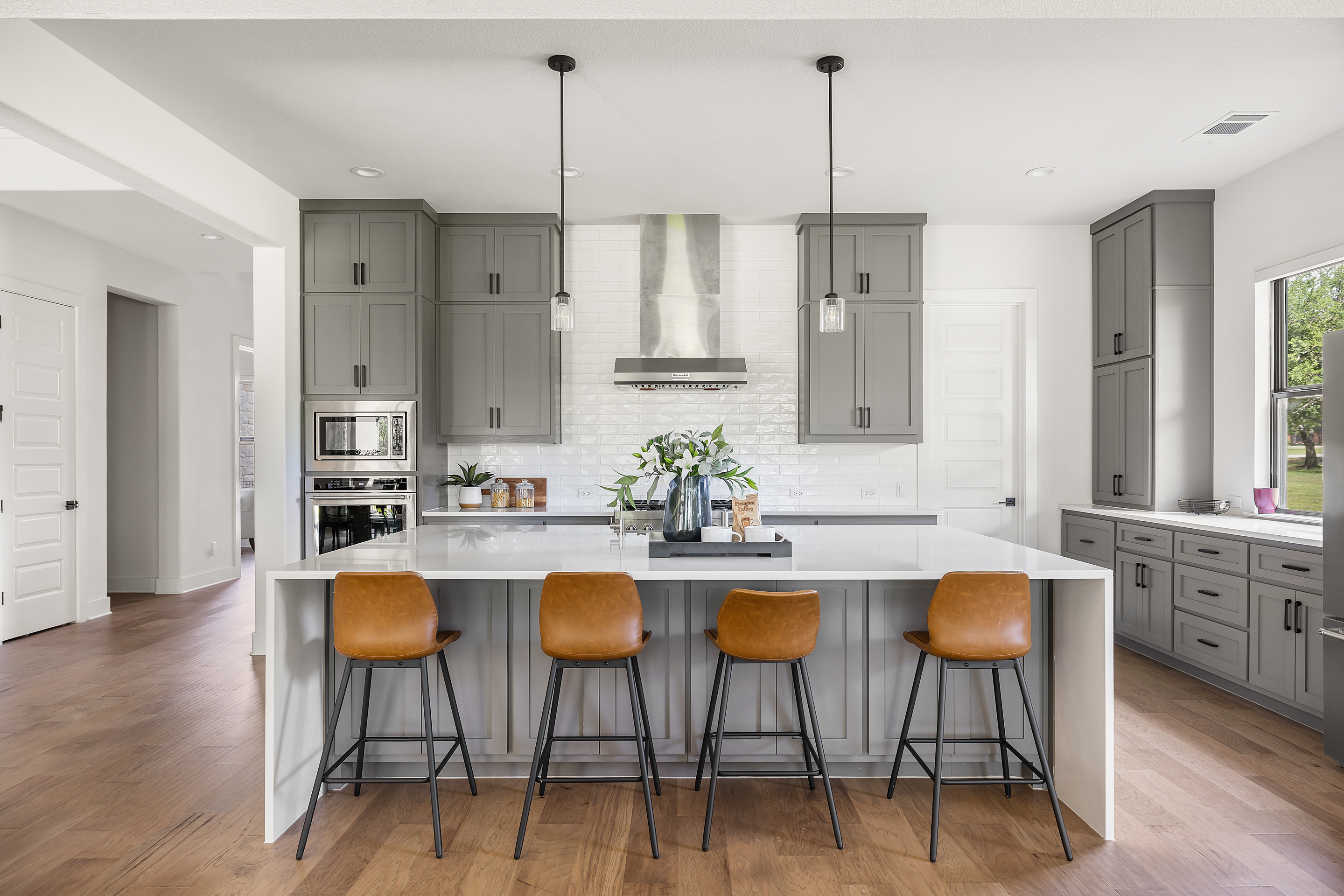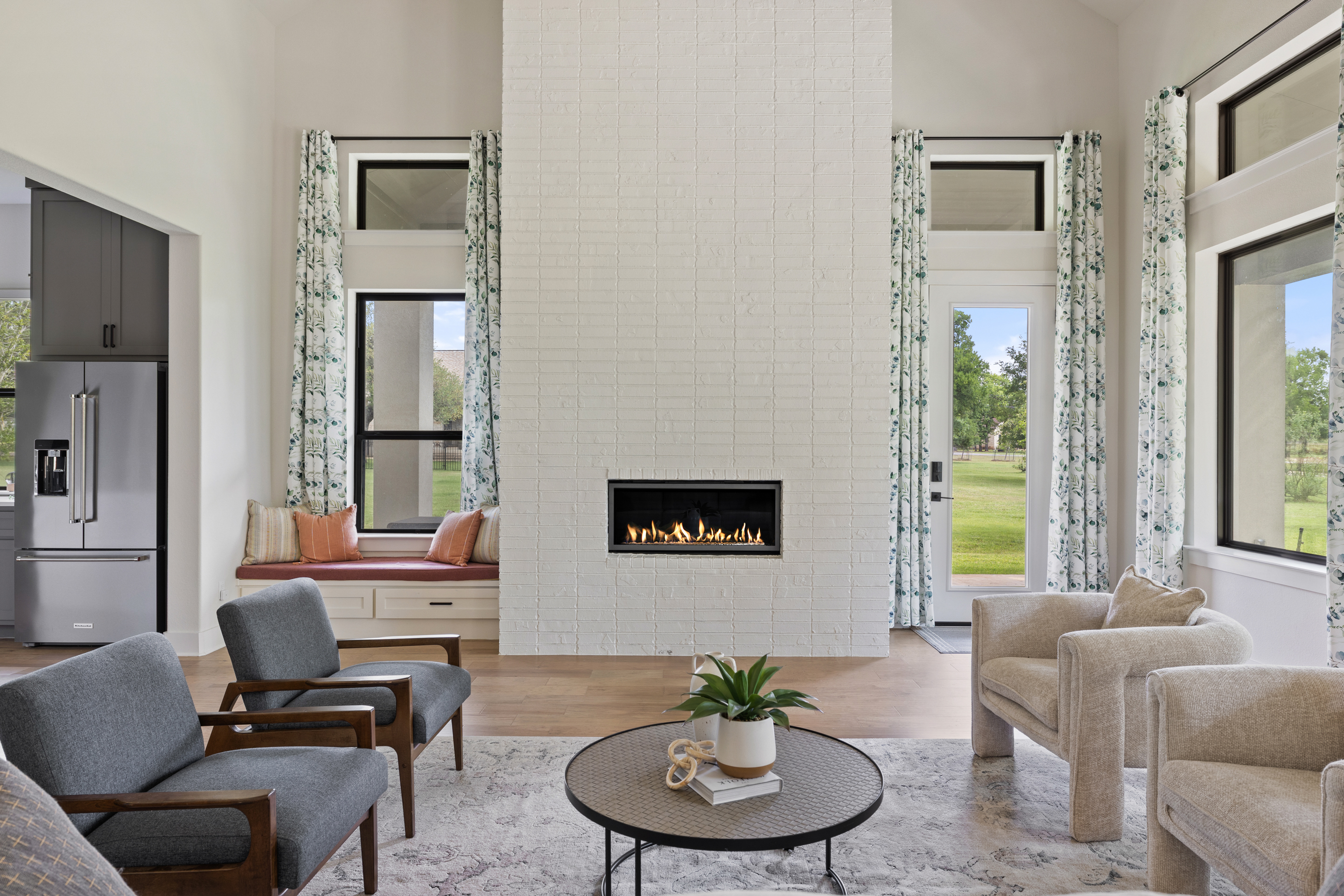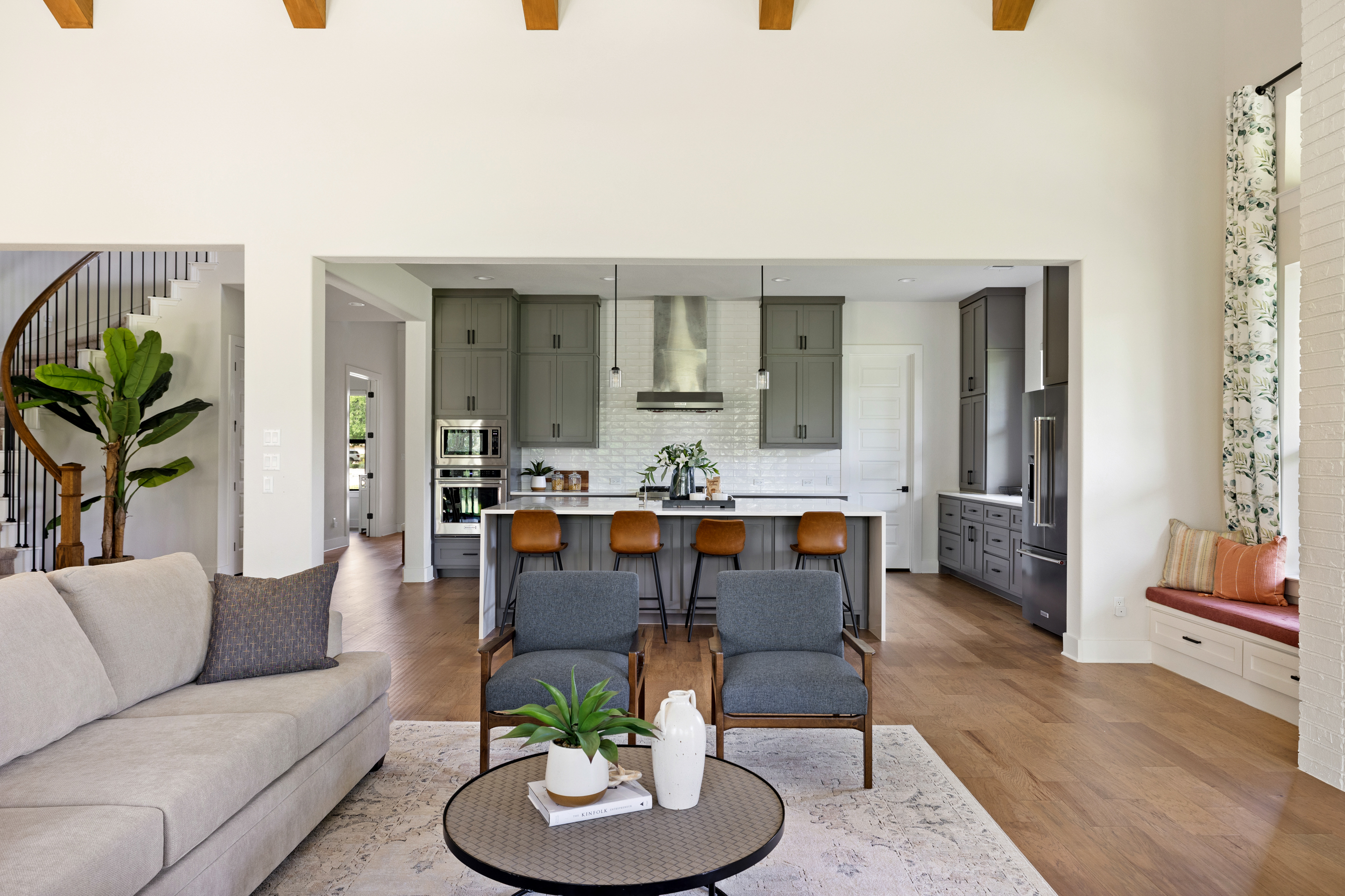 Stunning contemporary custom home set on over an acre in the gated community of Gabriel’s Overlook. Tucked among mature trees, this private, picturesque lot offers a serene retreat with exceptional curb appeal, highlighted by a beautifully landscaped front yard, expansive driveway, and inviting wraparound porch designed to take in the peaceful surroundings. Inside, the main level showcases white oak flooring, soaring vaulted ceilings with exposed beams, and a wall of floor-to-ceiling windows that flood the great room with natural light. The open-concept design seamlessly connects the gourmet kitchen to the oversized living area, perfect for both everyday living and entertaining. Ideal for multi-generational living, the main floor also features a private in-law suite complete with its own living room. The primary suite is a true sanctuary, offering large windows overlooking the wooded backyard, a spa-inspired bath with a freestanding soaking tub, oversized walk-in shower, and a spacious custom closet. Upstairs, you’ll find a media room, game room, and three generously sized bedrooms, each with its own en-suite bathroom, providing comfort and privacy for family and guests alike.