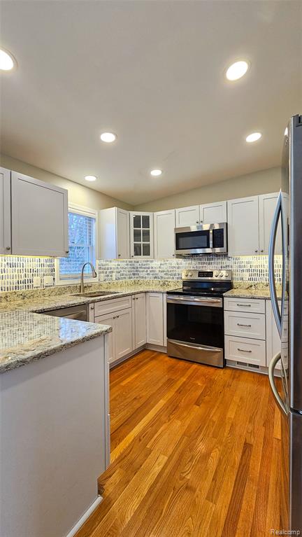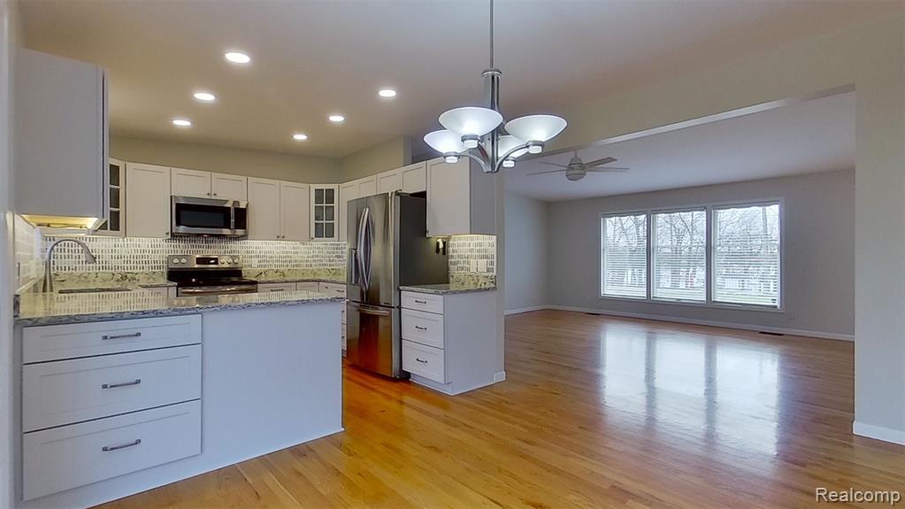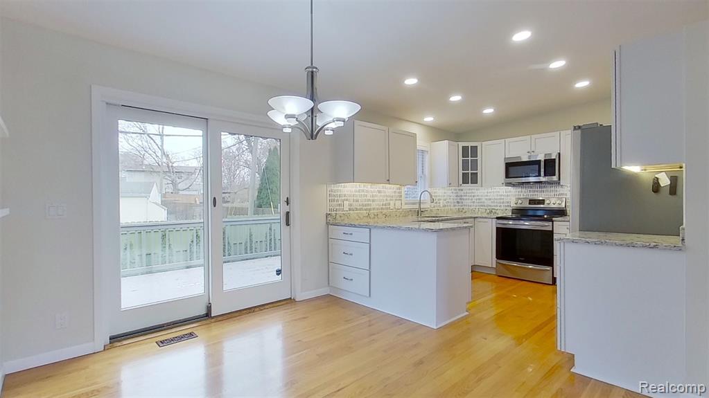 Enjoy stunning Elizabeth Lake sunsets from the patio of this beautifully appointed home. Offering a combined 2,600 sq ft of living space, this property delivers comfort, flexibility, and lake-side charm. The main level features primary suite with attached full bath and 2 more spacious bedrooms and another full bath. The bright updated kitchen opens to dining area while the open concept living room has expansive lake views. Walkout the dining area to the private backyard providing morning sun, afternoon shade and Sunsetter awning. The lower level features large rec room with egress-ideal as a 4th bedroom. The LL ceramic tiled bathroom with walk in shower along with media room and dedicated office is an oasis of its own. Full laundry room includes 2 washers and 2 dryers. Abundant storage throughout. Additional Perks include spacious ground level front porch with another Sunsetter awning overlooking Elizabeth Lake. Garage equipped with overhead racks and built-ins. Simply Safe alarm system. ACCESS to ELIZABETH LAKE directly across the street via private association (at homeowners option)