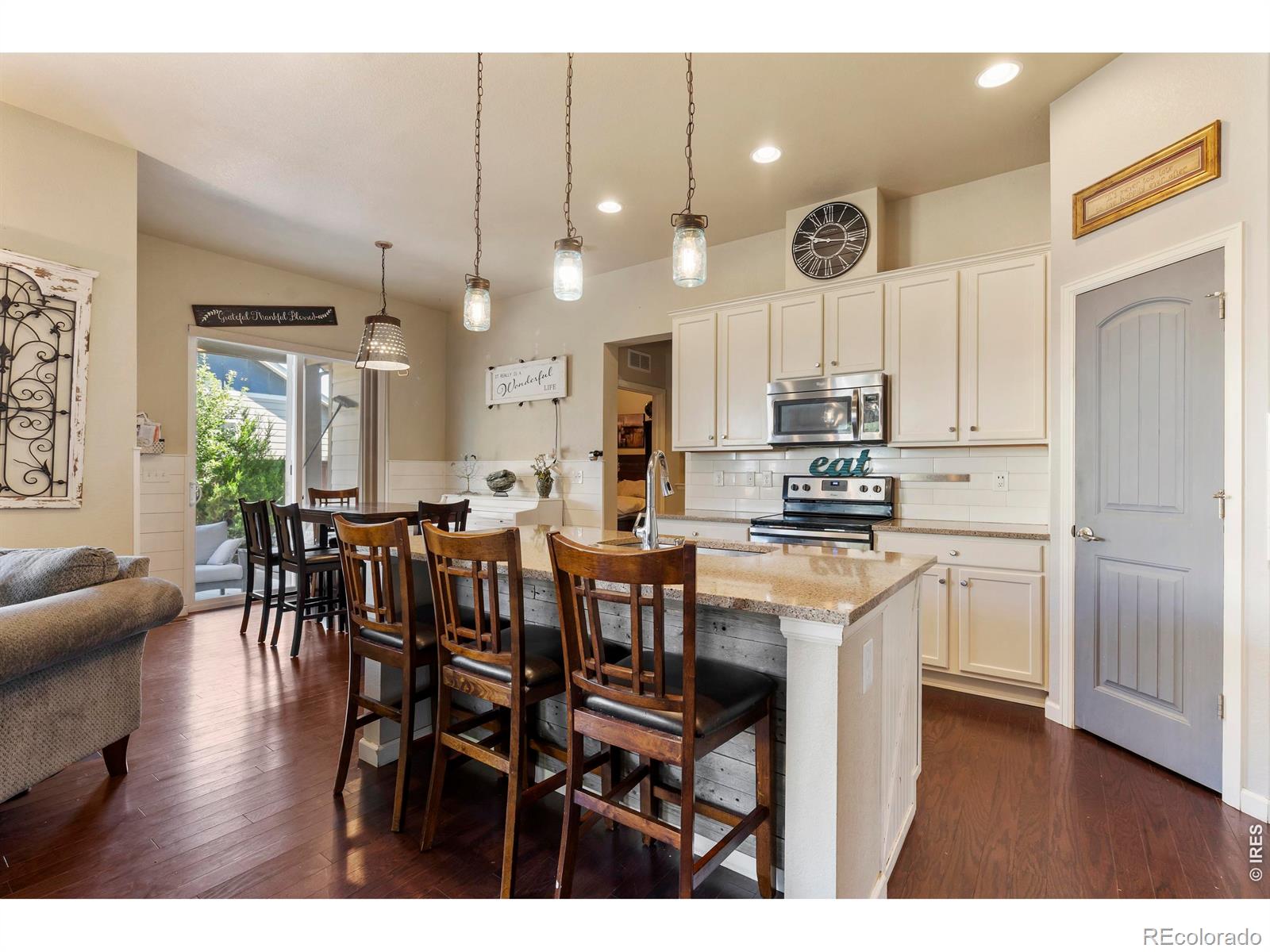 Modern ranch-style residence with practical living in a welcoming community setting. 4 bed, 4 bath with additional room for office/bedroom. Excellent open floorplan and abundant natural light and features hardwood flooring, shiplap detailing, and reclaimed wood finishes. The gourmet kitchen offers quartz countertops, a sizable island, stainless steel appliances, and classic white cabinetry with a subway tile backsplash. The finished basement boasts a spacious recreational room complete with granite wet bar, mini-kitchen creating an ideal environment for entertaining guests or multigenerational living. Outdoors, enjoy a covered patio with drop shade, gas firepit, and a secondary seating area. Thoughtful xeriscaping and drip irrigation enhance both beauty and sustainability. This home is situated in a vibrant neighborhood offering food truck events, green space, and community gardens. Located a couple minutes from Hwy 287, about a mile from TPC Colorado Golf Course and near Berthoud's recreation center, this property presents exceptional lifestyle benefits with access to premier amenities and outdoor activities.