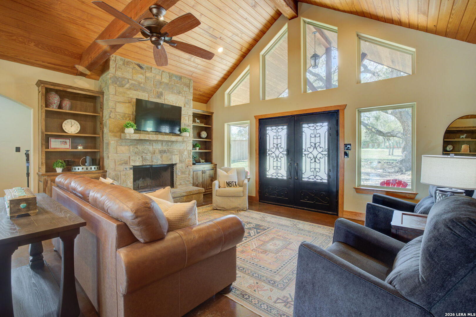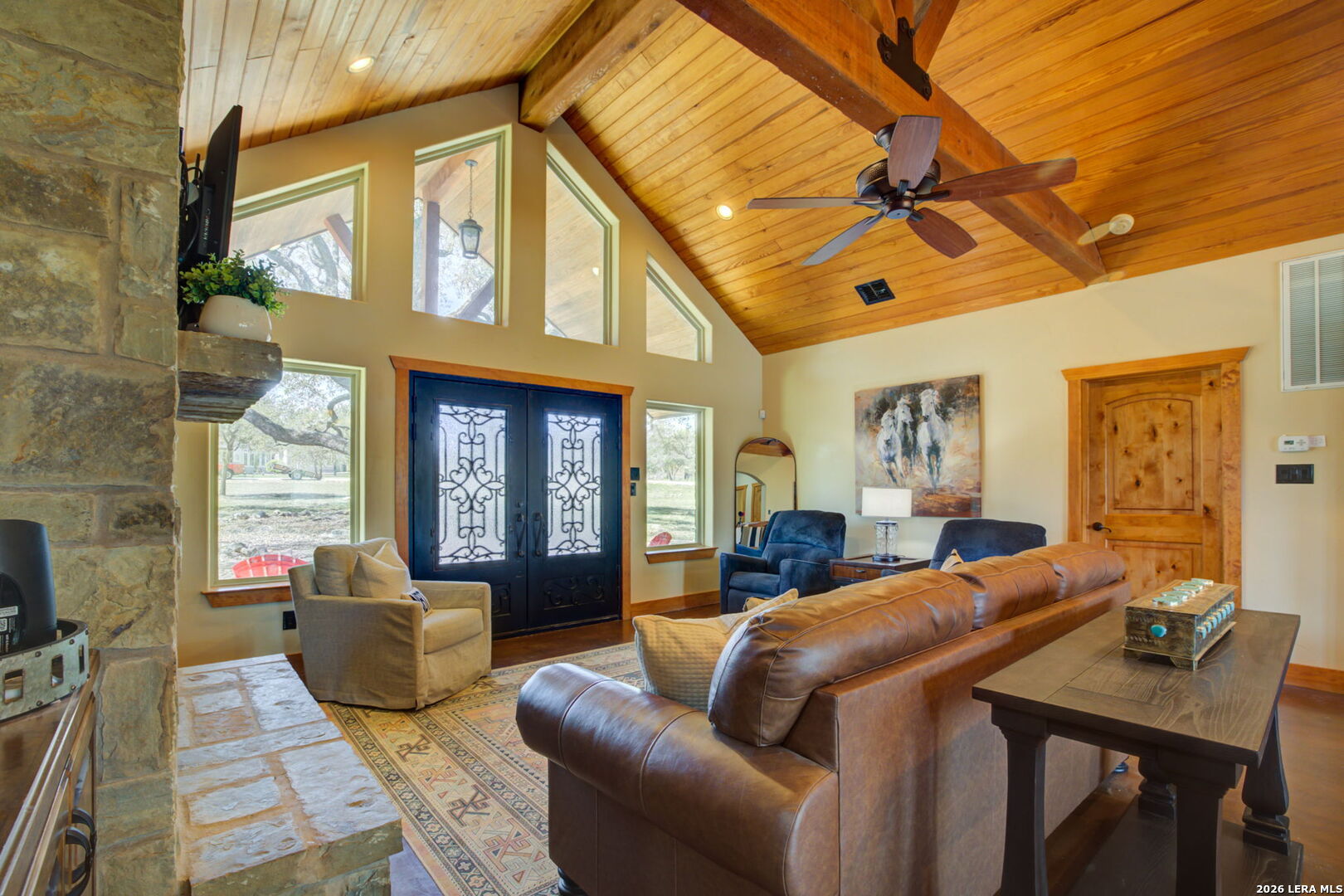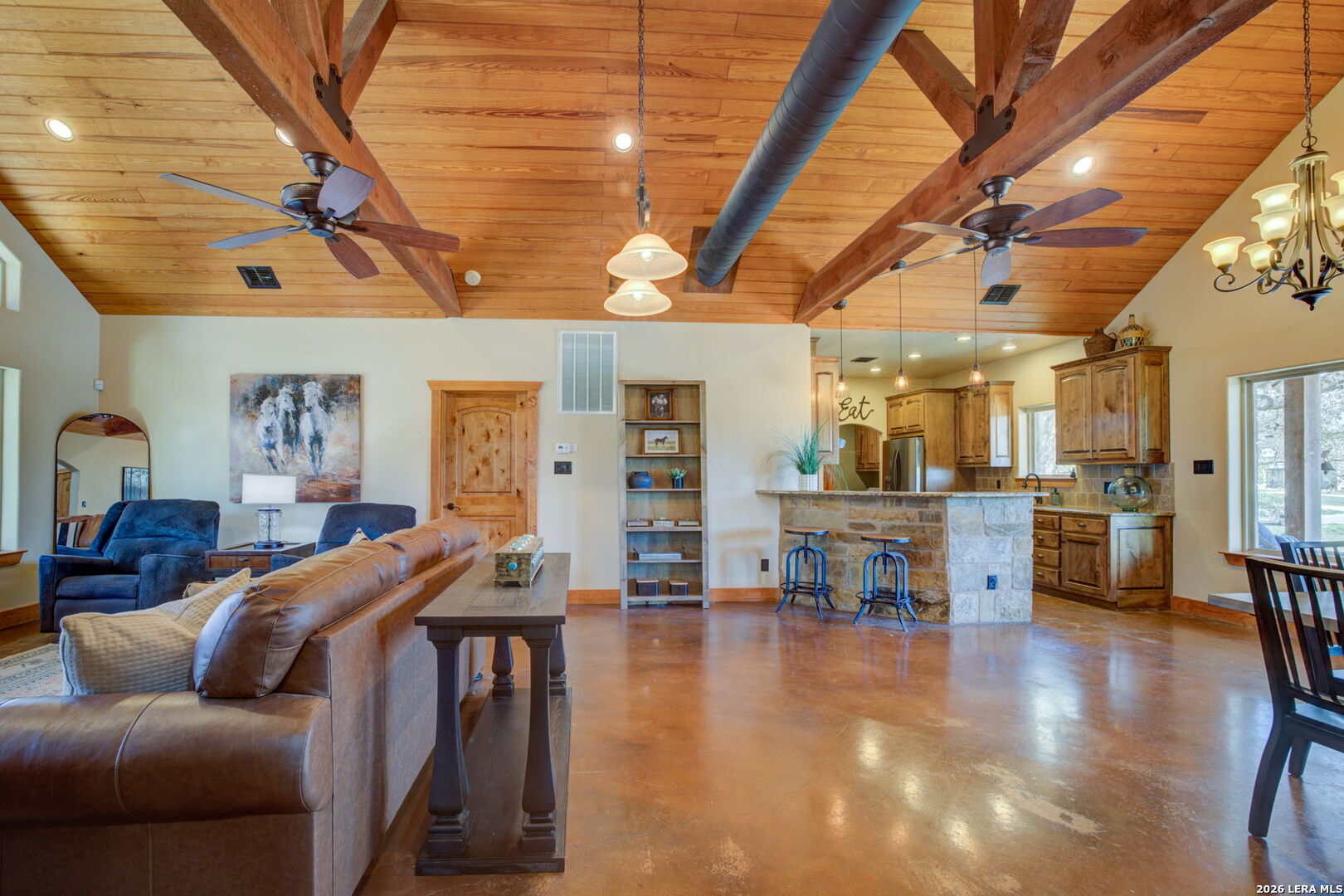 Must see, one-story, Canavan & Frank custom home with a pool. This property is on a 1+ acre corner lot toward the back of River Chase away from main traffic/FM306 for a quiet and more peaceful setting. Notable features include stunning tongue-and-groove ceilings, concrete flooring throughout, impressive iron front doors, custom cabinetry, well-appointed kitchen with double ovens, stone fireplace w/ built-ins, four side masonry, metal roof, partially fenced/privacy fenced, mature trees and a great backyard entertaining area with pool (heated for fall/winter). Don't forget to go tour the great amenities residents have access to, such as a 58 acre PRIVATE Guadalupe River park, multiple swimming pools, fishing pond, walking trails, tennis courts, park/playground and clubhouse with workout facility. Zoned to Hoffmann Lane Elementary and No City Taxes make this a desirable location. Come tour today.