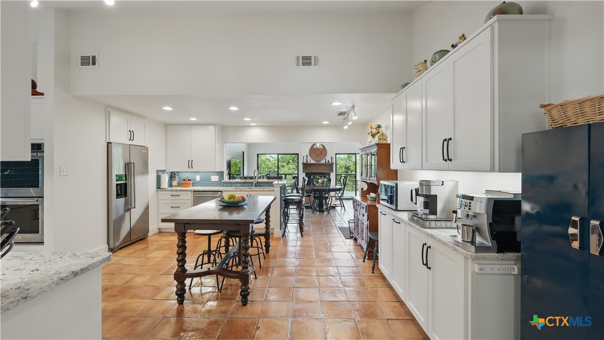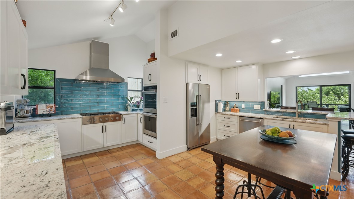 This beautiful 4/3.5/3 Lake Dunlap home is located just minutes from Downtown New Braunfels and offers 56 ft of improved waterfront in the No Wake zone, perfect for swimming, fishing, kayaking, and relaxing. Outdoor entertainment is easy with multiple decks, watercraft storage at waterfront, a professional kayak launch, and a covered/lighted BBQ area off the back deck. The light-filled main home offers an open floor plan with 3 bedrooms (2 main level, 1 large upstairs loft), 2.5 bathrooms, 2 living areas with WB FP, 2 dining areas, a flex room/home office that is currently used as a bedroom, and a workout room off the 3-car oversized garage (with workshop and permanent stairs up to floored/lighted attic storage). The kitchen features premium stainless appliances (6-burner gas range, pro-style range hood, dbl convection ovens, dishwasher, refrigerator), custom cabinets with undermount lighting, gorgeous tile backsplash, and granite counters. An adjacent walk-in pantry offers a ton of storage and an extra fridge. The owners' suite features a WB FP, walk-in closet, large bathroom with 2 vanity areas, and a large shower with dual shower heads. Additional closets just outside the owners' suite offer ample storage. The attached guest house has its own private entrance, a full kitchen with stainless appliances, a full bathroom with washer/dryer, and is large enough to accommodate multiple beds. Ready for a dip in the lake? Ride the electric tram or take the stairs and enjoy the waterfall view above. Fridges, washers, dryers, and watercraft convey!