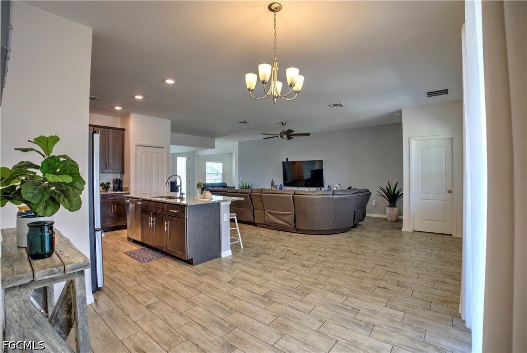 Newer construction home located in desirable Southwest Cape Coral offering over 2,400 sq ft under air. This spacious split-bedroom floor plan features 4 bedrooms and 3 full bathrooms, including a secondary bedroom with potential for an en-suite - ideal for guests or multi-generational living. Interior features include a formal dining area and a versatile flex space suitable for a den, office, or additional living room. The kitchen features granite countertops, a large island with seating, soft-close cabinetry, a pantry, stainless steel appliances, and a breakfast nook. Open-concept living area with plank tile flooring throughout main living spaces and carpet in the bedrooms. The primary suite offers dual walk-in closets and a spacious bathroom with dual vanities, a separate soaking tub, a walk-in shower, and a private water closet. Additional features include an inside laundry room with a washer and dryer, and a 3-car garage providing ample space for vehicles, storage, and recreational equipment. Enjoy outdoor living on the covered lanai with plenty of room to design and build your future pool. Property is connected to city water and sewer, with a very small balance to be assumed by the buyer. There is an assumable FHA loan available for interested buyers. Conveniently located near shopping, supermarkets, parks, dining, and Lee County schools, including Top-rated Cape Coral Municipal Charter Schools, with easy access to Fort Myers via Veterans Memorial Parkway. What are you waiting for? Schedule your private showing today!