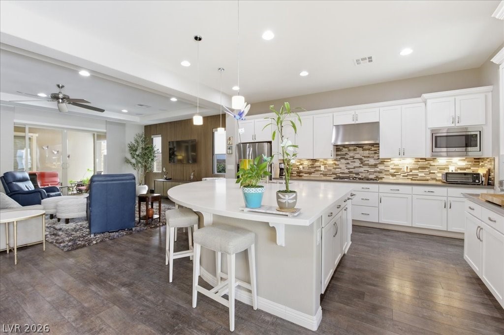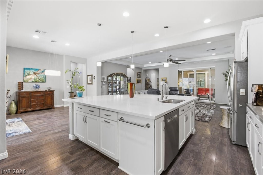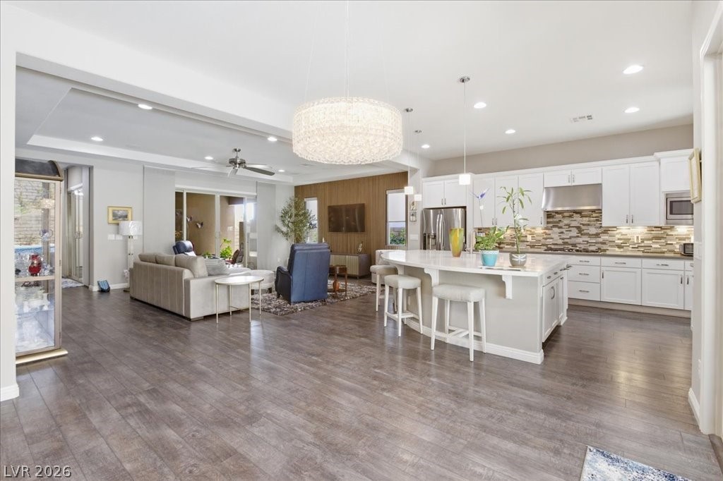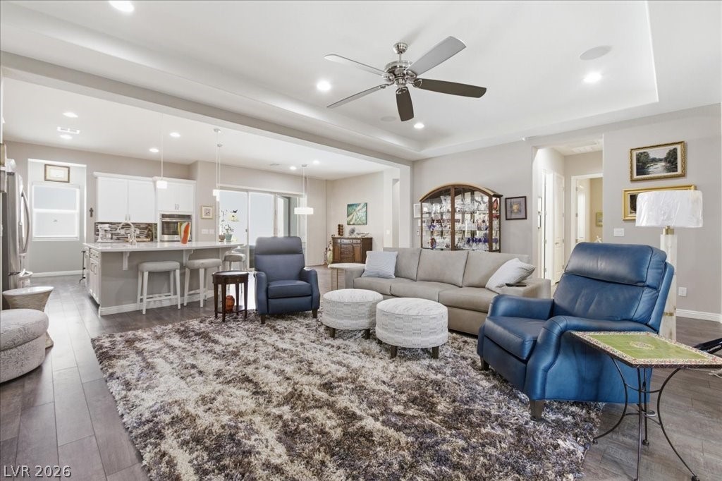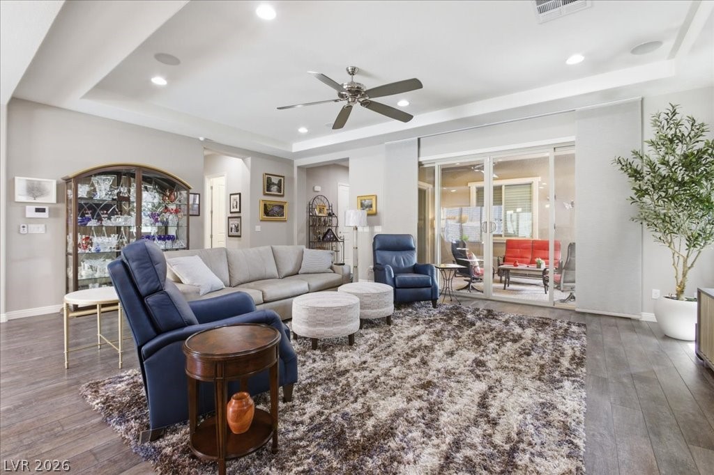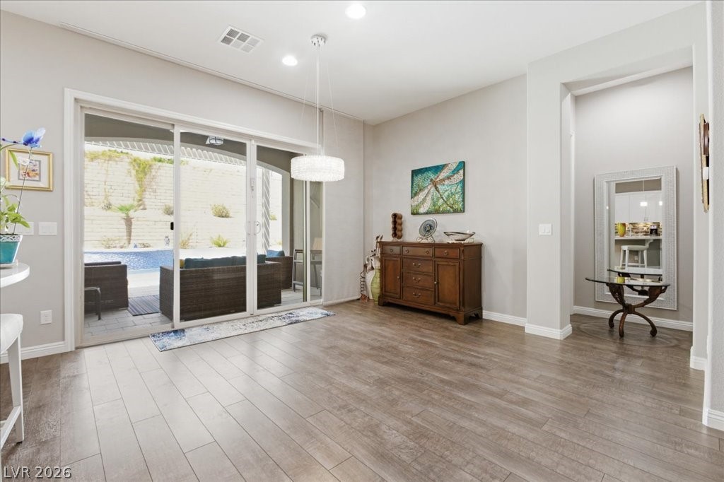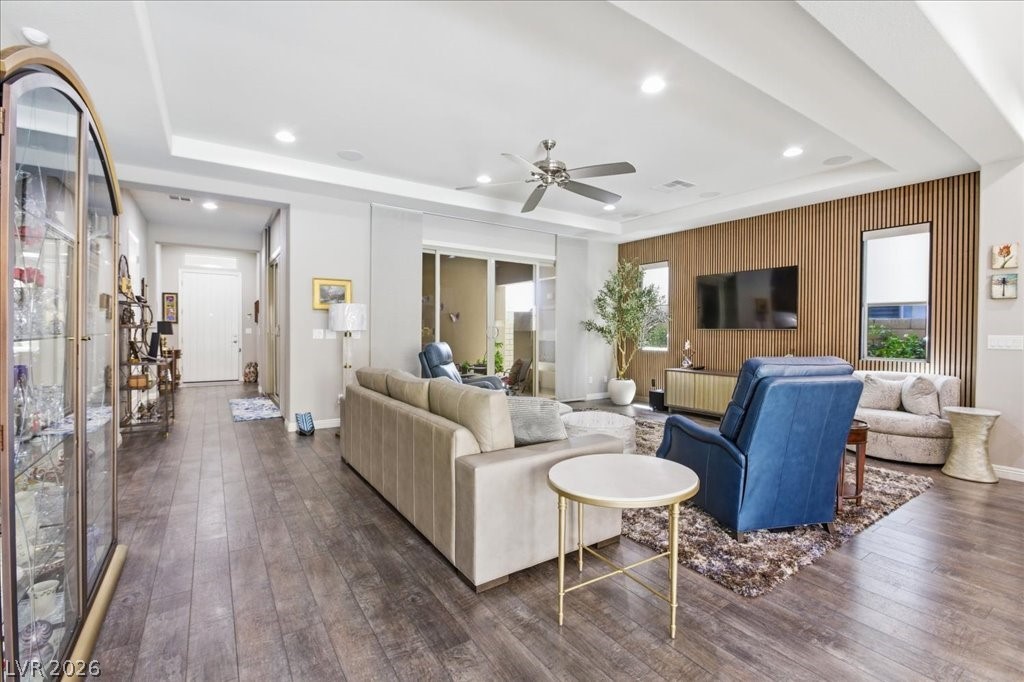 Exceptional single-story home in Summerlin. This upscale residence offers 2,095 sq ft, 3 bedrooms, and 3 baths. The home includes a fully paid-off solar system, a resort-style pool and spa, and a bright open-concept layout. Interior finishes include neutral tones, luxury vinyl flooring, and plantation shutters. The kitchen is equipped with GE appliances, a double oven, quartz countertops, and a walk-in pantry. The spacious primary suite features a walk-in closet and a functional layout, while secondary bedrooms are well-sized and versatile. The backyard offers a covered patio (with misters) overlooking the pool area. A separate courtyard features an outdoor fireplace, providing additional space for year-round use. Additional features include a 2-car garage with epoxy flooring and a dual HVAC system. Enjoy Las Vegas Strip view from the front yard patio. Located in the gated Savona community in The Paseos of Summerlin, this home is near parks, shopping, dining, and entertainment.