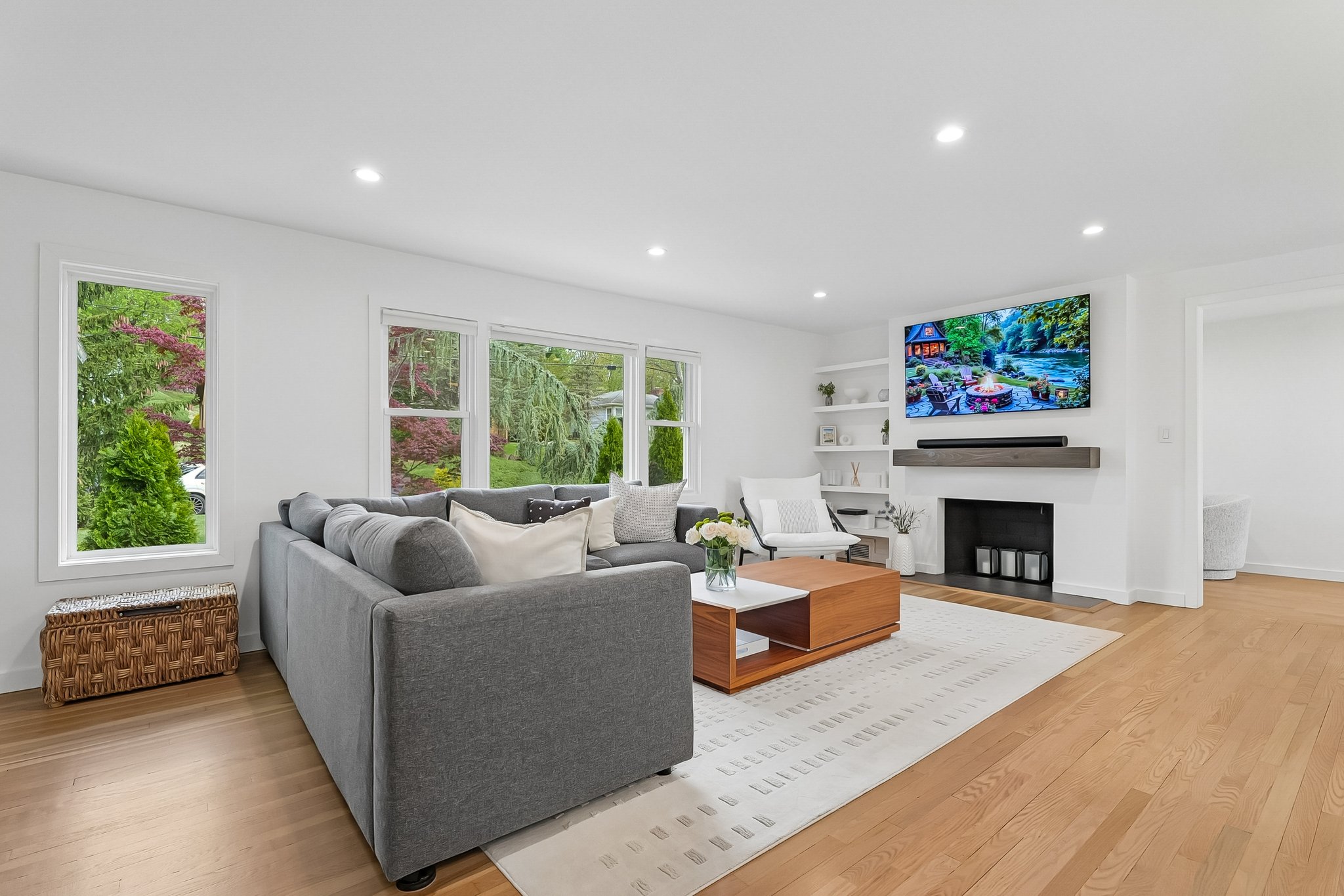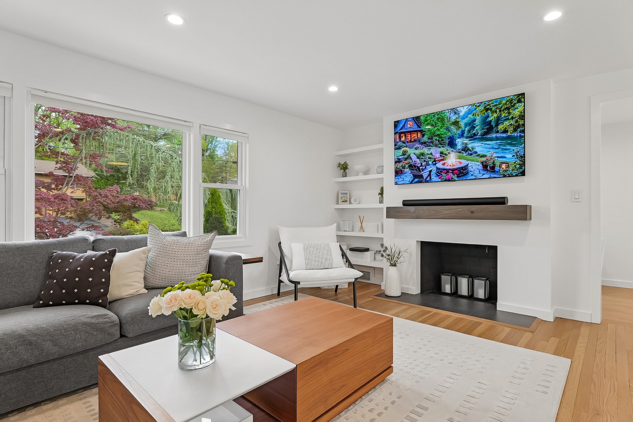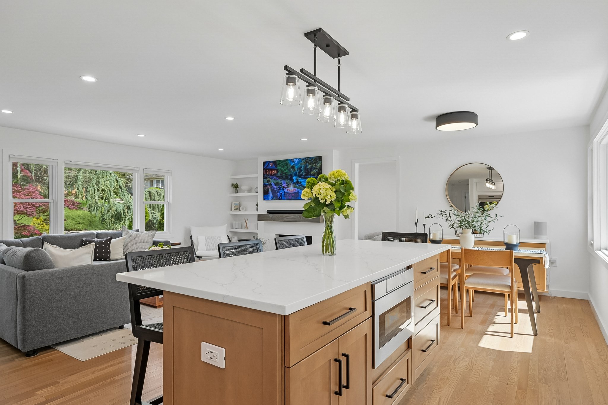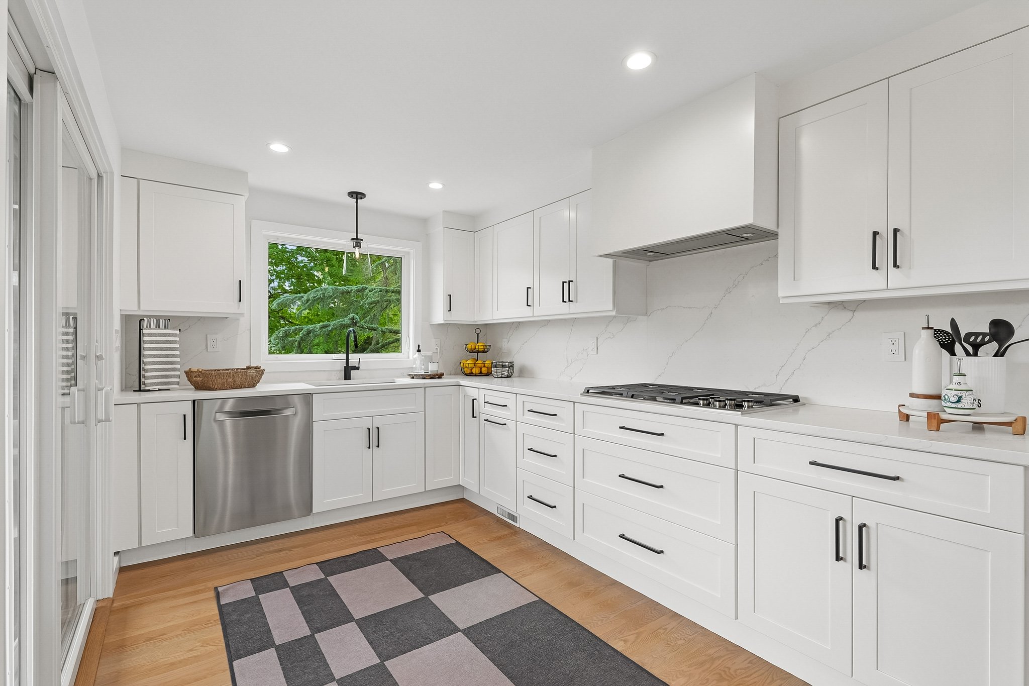 Welcome to elevated Ranch living, masterfully designed for entertaining. This meticulously maintained 3 bedroom, 1.5 rath home blends timeless style with modern comfort, offering a bright, open-concept layout ideal for both everyday living and effortless hosting. The inviting living room, complete with a cozy fireplace, flows seamlessly into the dining room complete with a floating wall-mounted cabinet and beautifully updated Kitchen featuring quartz countertops, a center island, custom windows, and high-end stainless steel appliances including Wolf and Bosch. Sliders provide direct access from the kitchen to a covered deck, creating the perfect indoor-outdoor flow for year-round entertaining. Just off the living room, a versatile office/playroom offers flexible space for remote work, hobbies, or additional living needs. The fully finished basement adds valuable living space with a dedicated laundry room and abundant storage. This home offers too many upgrades to list, including a new roof, siding, gutters, driveway, and more ensuring peace of mind for years to come along with central air, forced hot air heating, a sprinkler system, French drain, and sump pump. Outside, enjoy lush landscaping and a spacious deck, perfect for entertaining or relaxing in your own private retreat, while a 2-car garage completes this exceptional, move-in ready home that truly blends sophistication, comfort, and functionality. You don't want to miss this stunning home !
