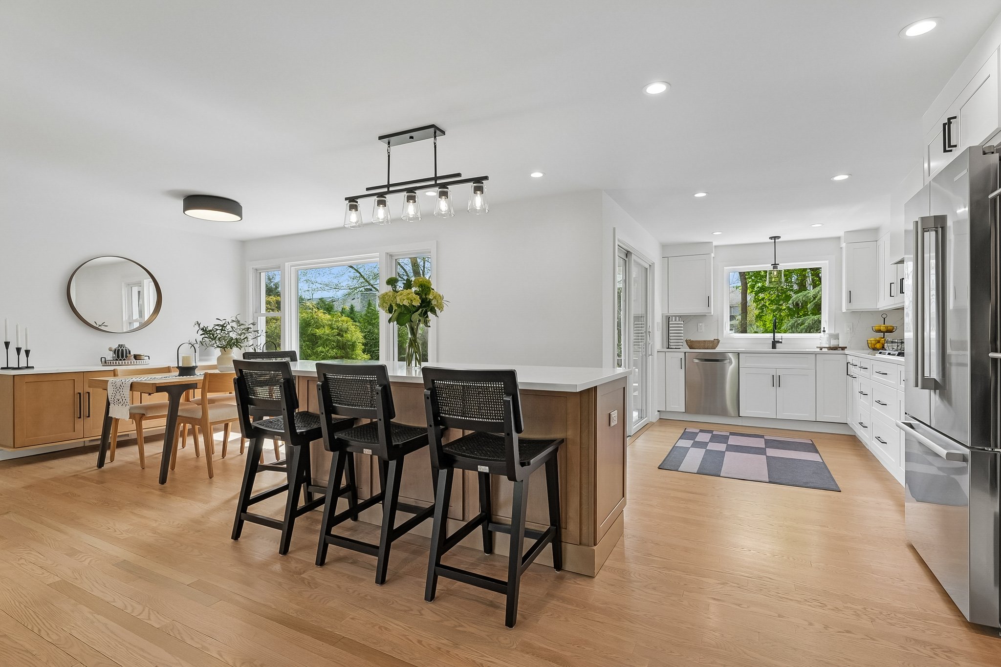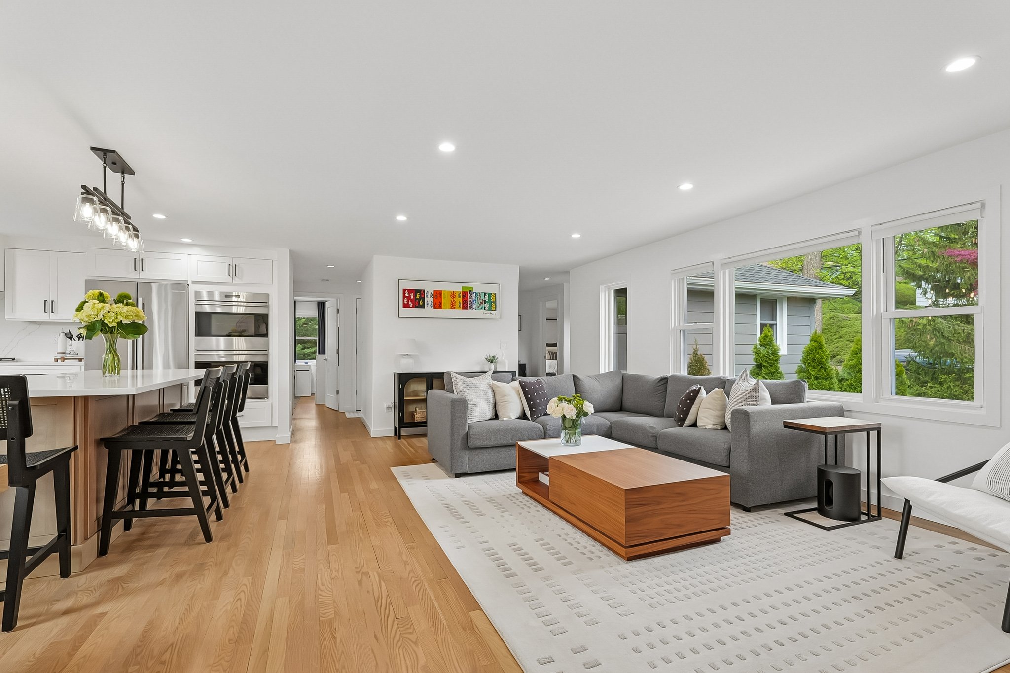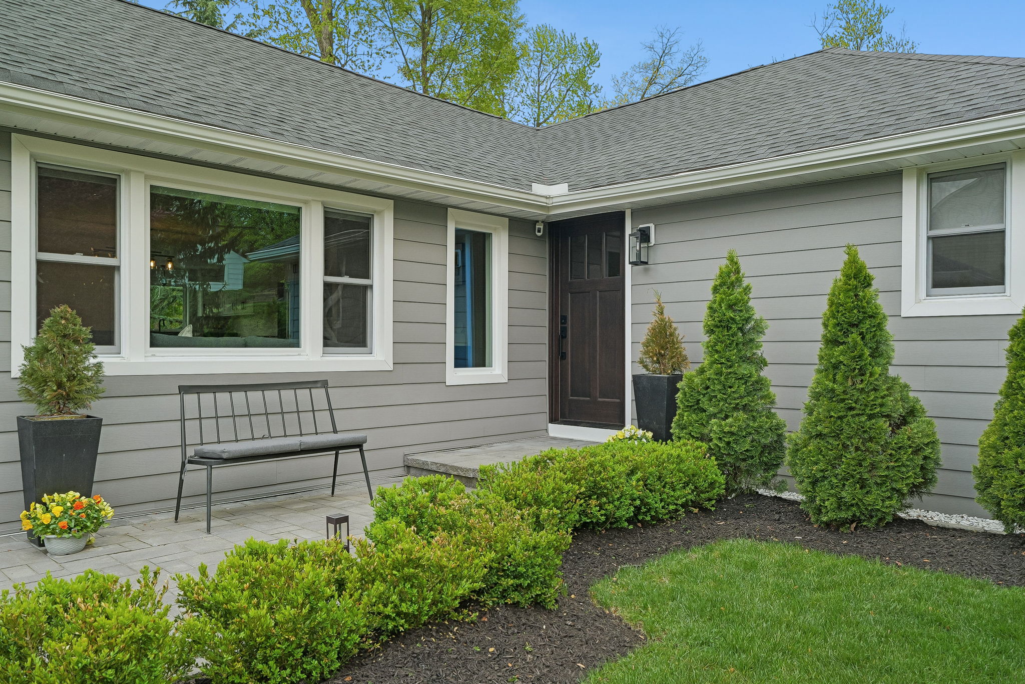 Welcome to elevated Ranch living, masterfully designed for entertaining. This meticulously maintained 3 bedroom, 1.5 rath home blends timeless style with modern comfort, offering a bright, open-concept layout ideal for both everyday living and effortless hosting. The inviting living room, complete with a cozy fireplace, flows seamlessly into the dining room complete with a floating wall-mounted cabinet and beautifully updated Kitchen featuring quartz countertops, a center island, custom windows, and high-end stainless steel appliances including Wolf and Bosch. Sliders provide direct access from the kitchen to a covered deck, creating the perfect indoor-outdoor flow for year-round entertaining. Just off the living room, a versatile office/playroom offers flexible space for remote work, hobbies, or additional living needs. The fully finished basement adds valuable living space with a dedicated laundry room and abundant storage. This home offers too many upgrades to list, including a new roof, siding, gutters, driveway, and more ensuring peace of mind for years to come along with central air, forced hot air heating, a sprinkler system, French drain, and sump pump. Outside, enjoy lush landscaping and a spacious deck, perfect for entertaining or relaxing in your own private retreat, while a 2-car garage completes this exceptional, move-in ready home that truly blends sophistication, comfort, and functionality. You don't want to miss this stunning home !